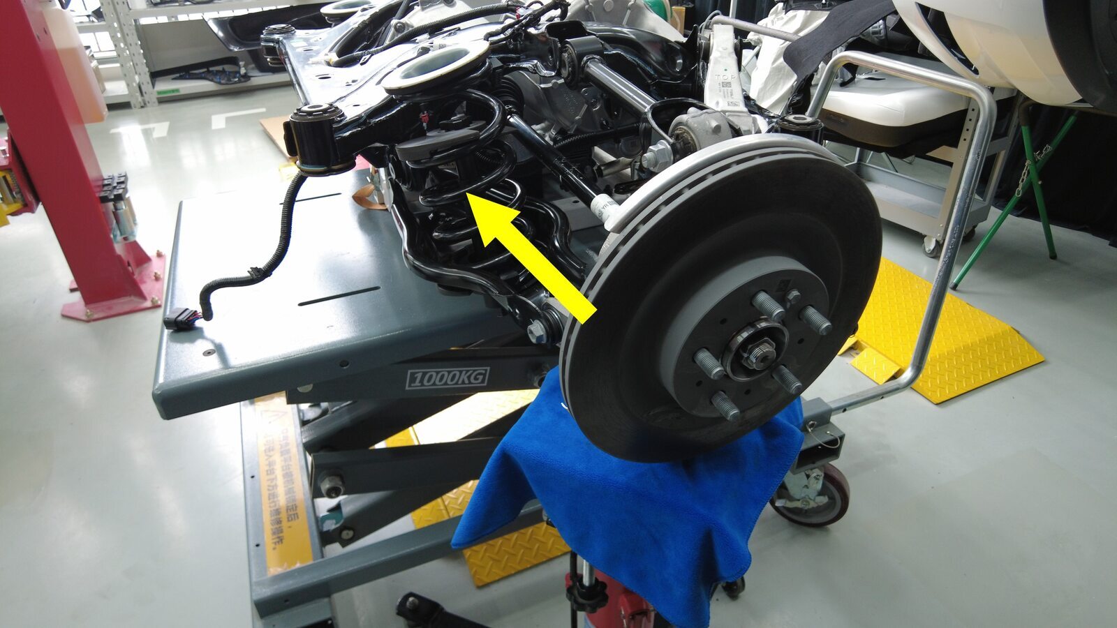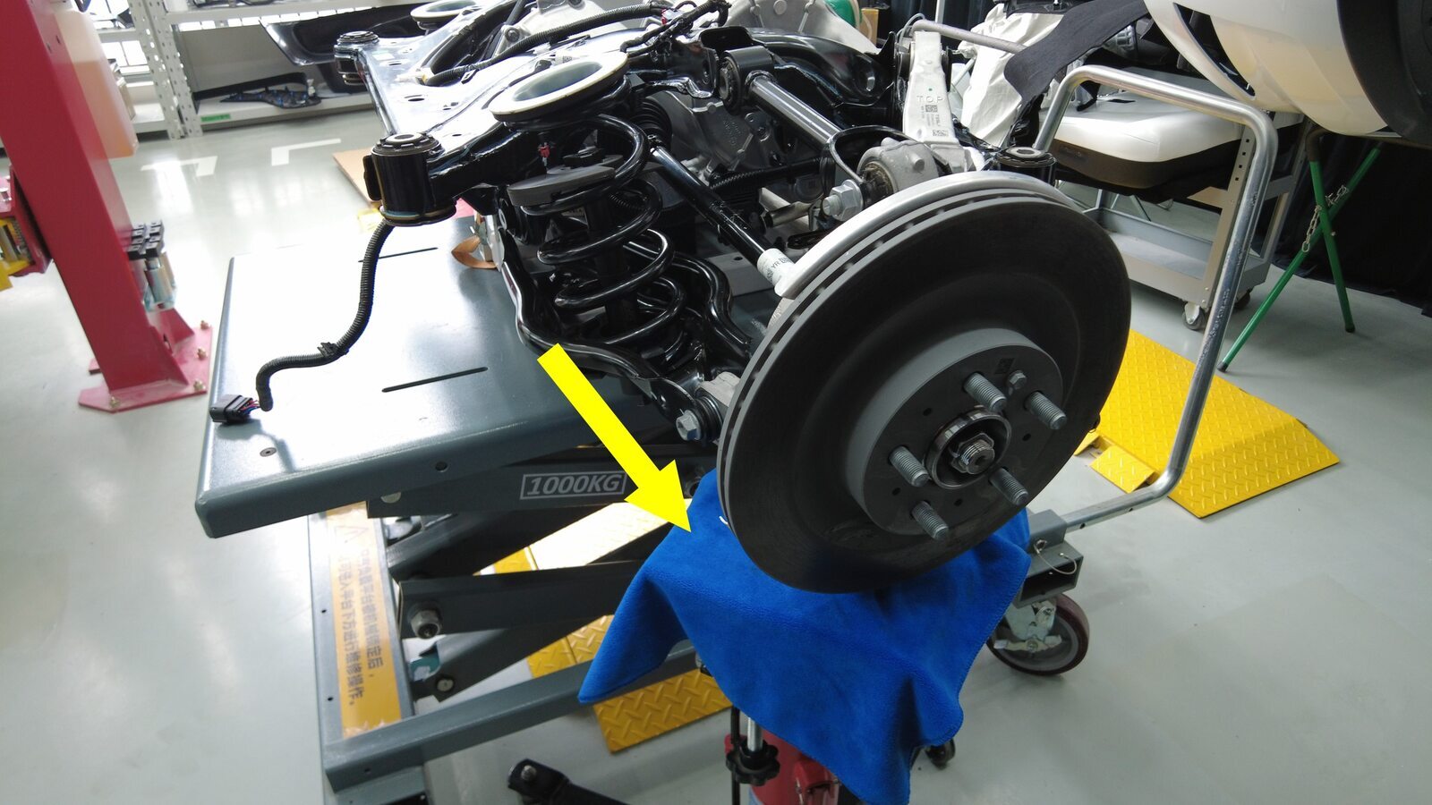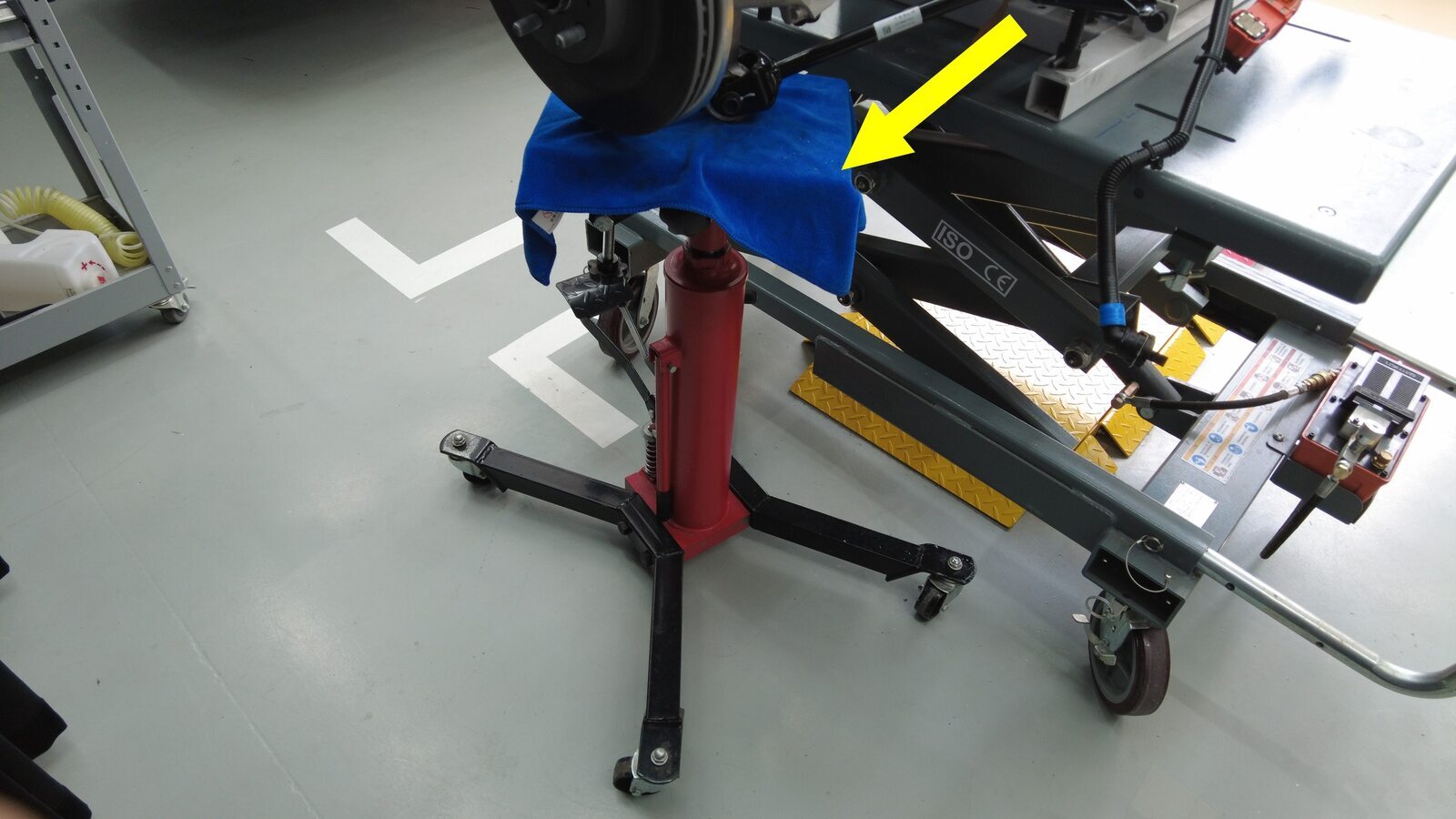 从车辆下方移走副车架举升工具。