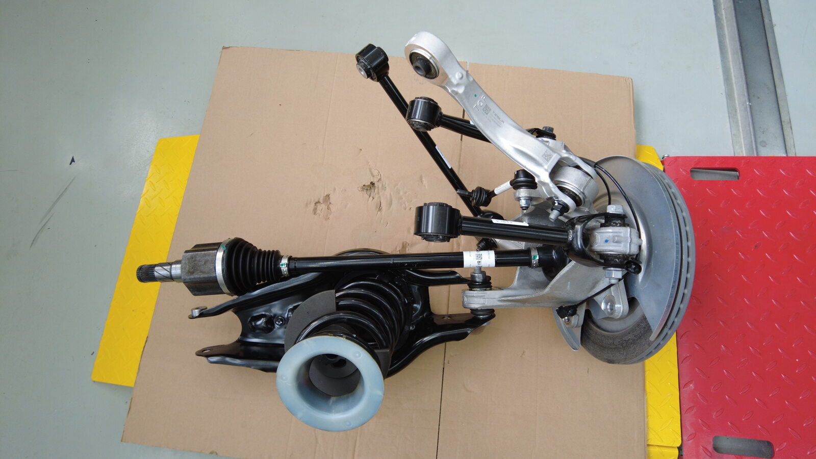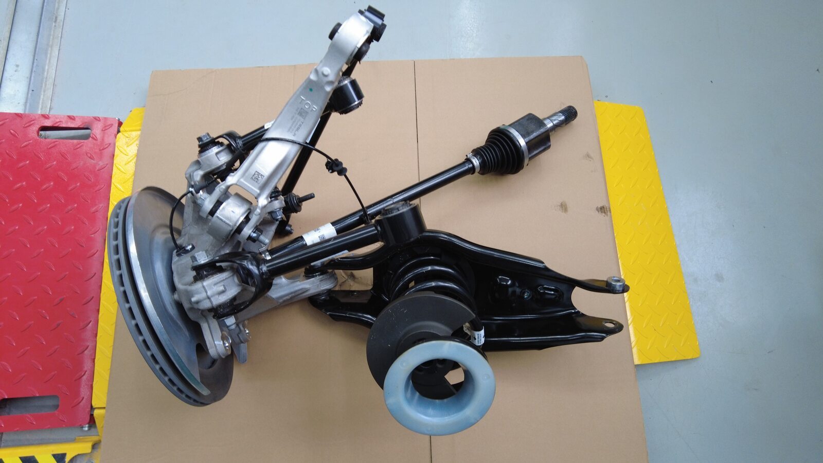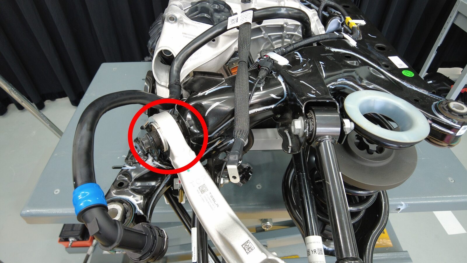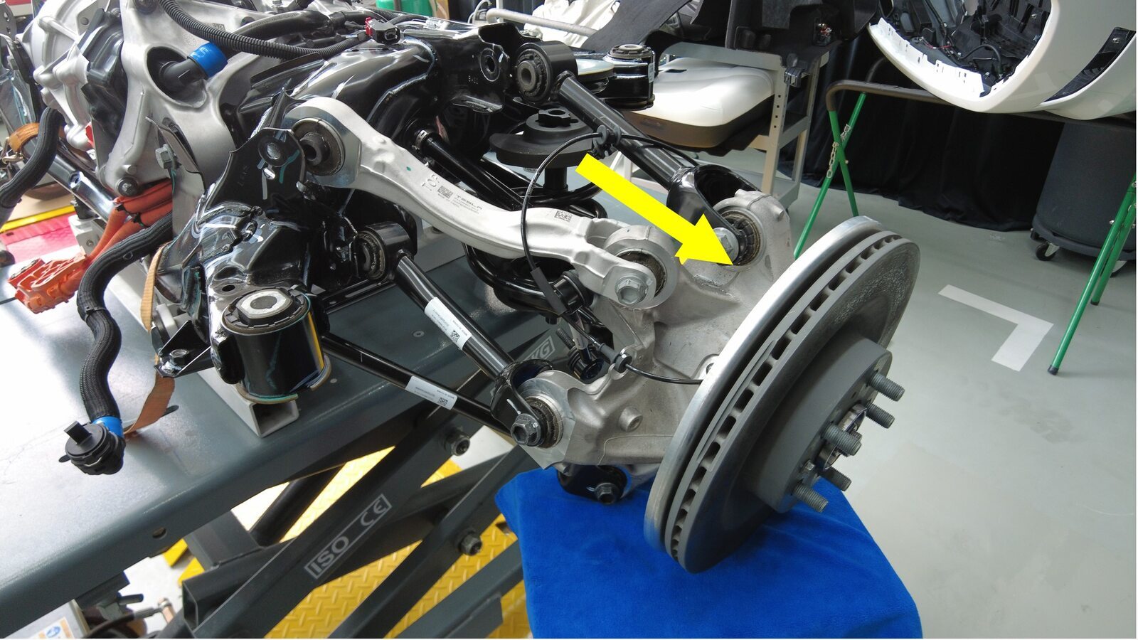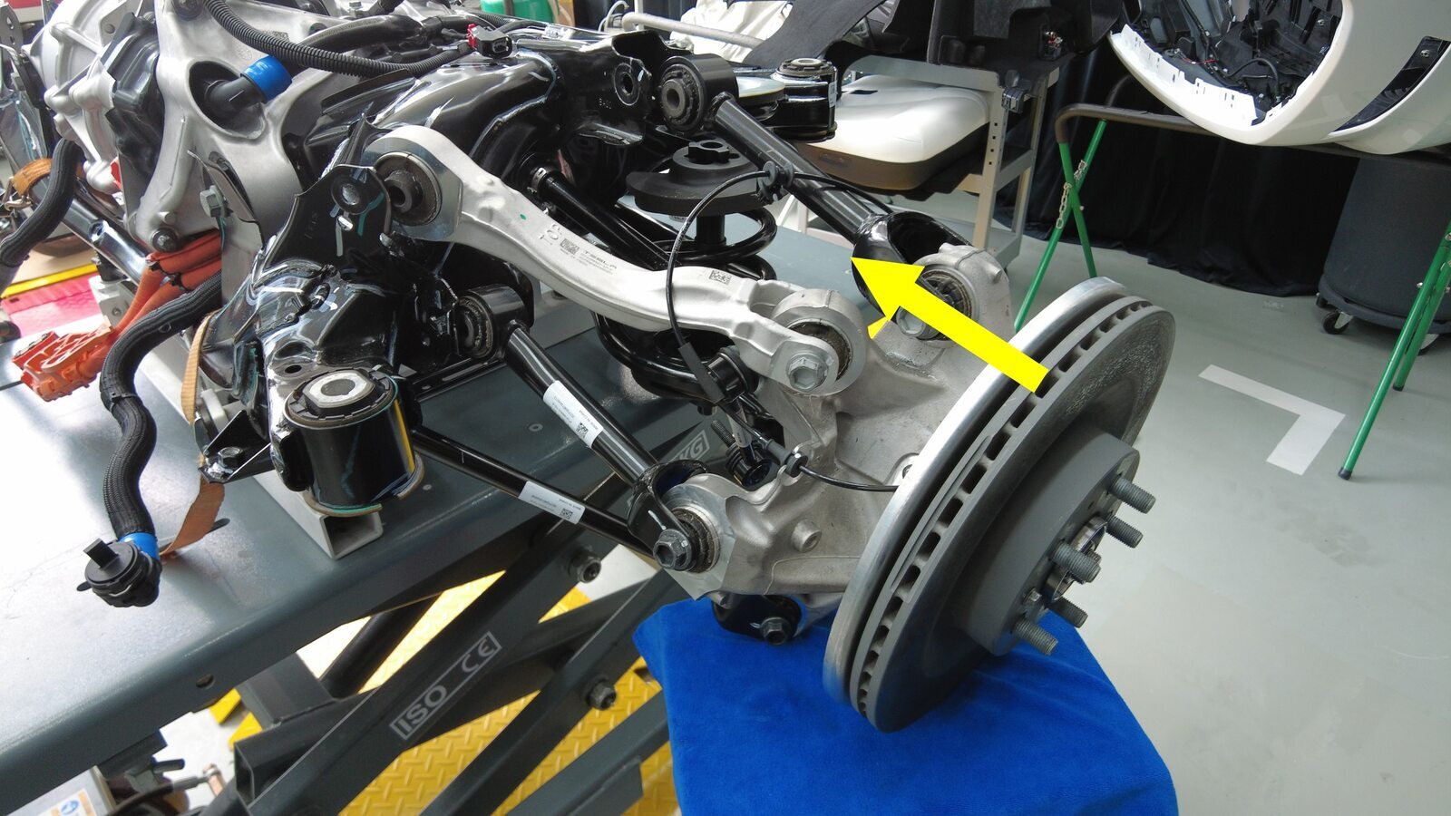 将后副车架和驱动电机总成举升到正确位置。