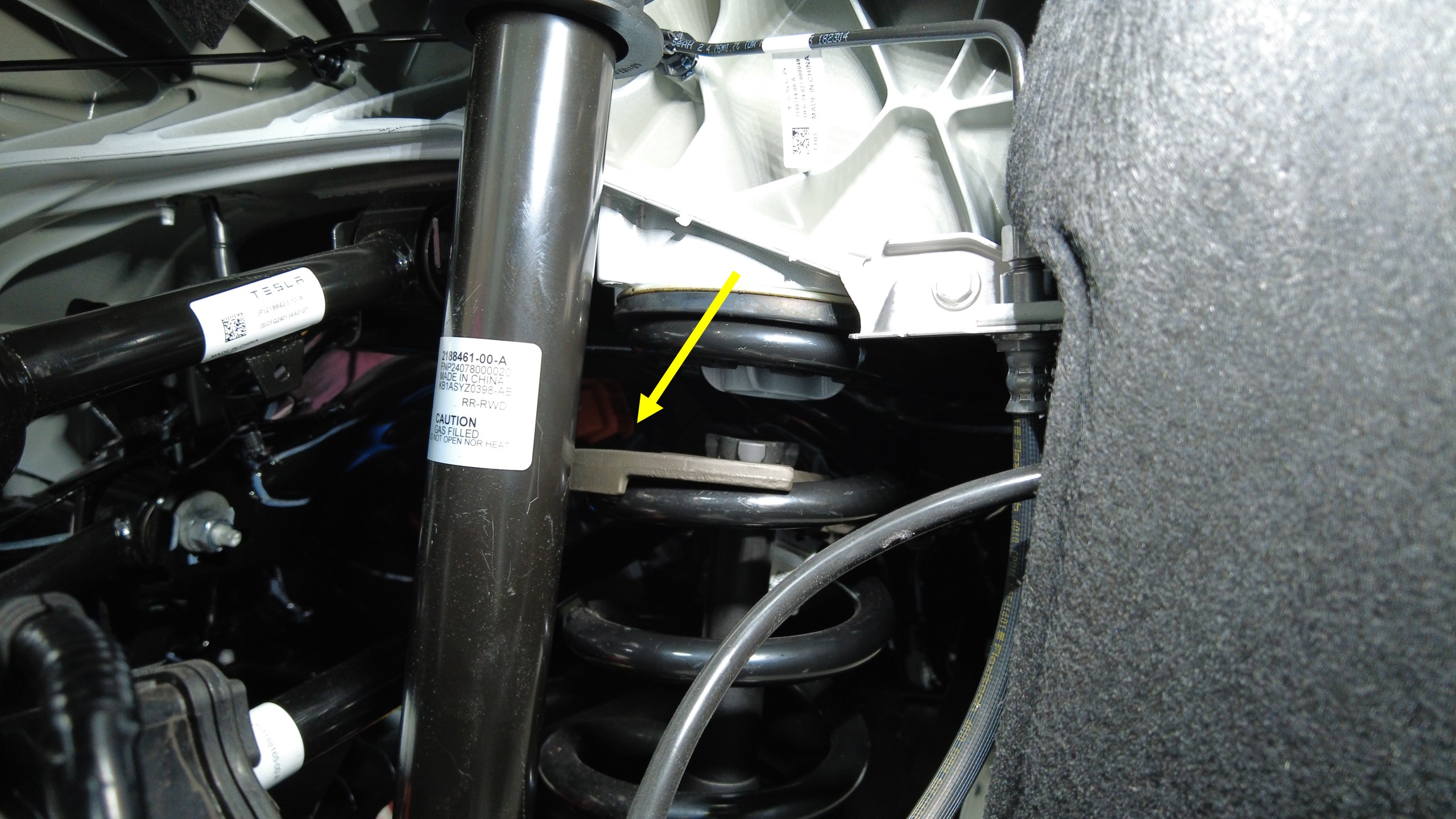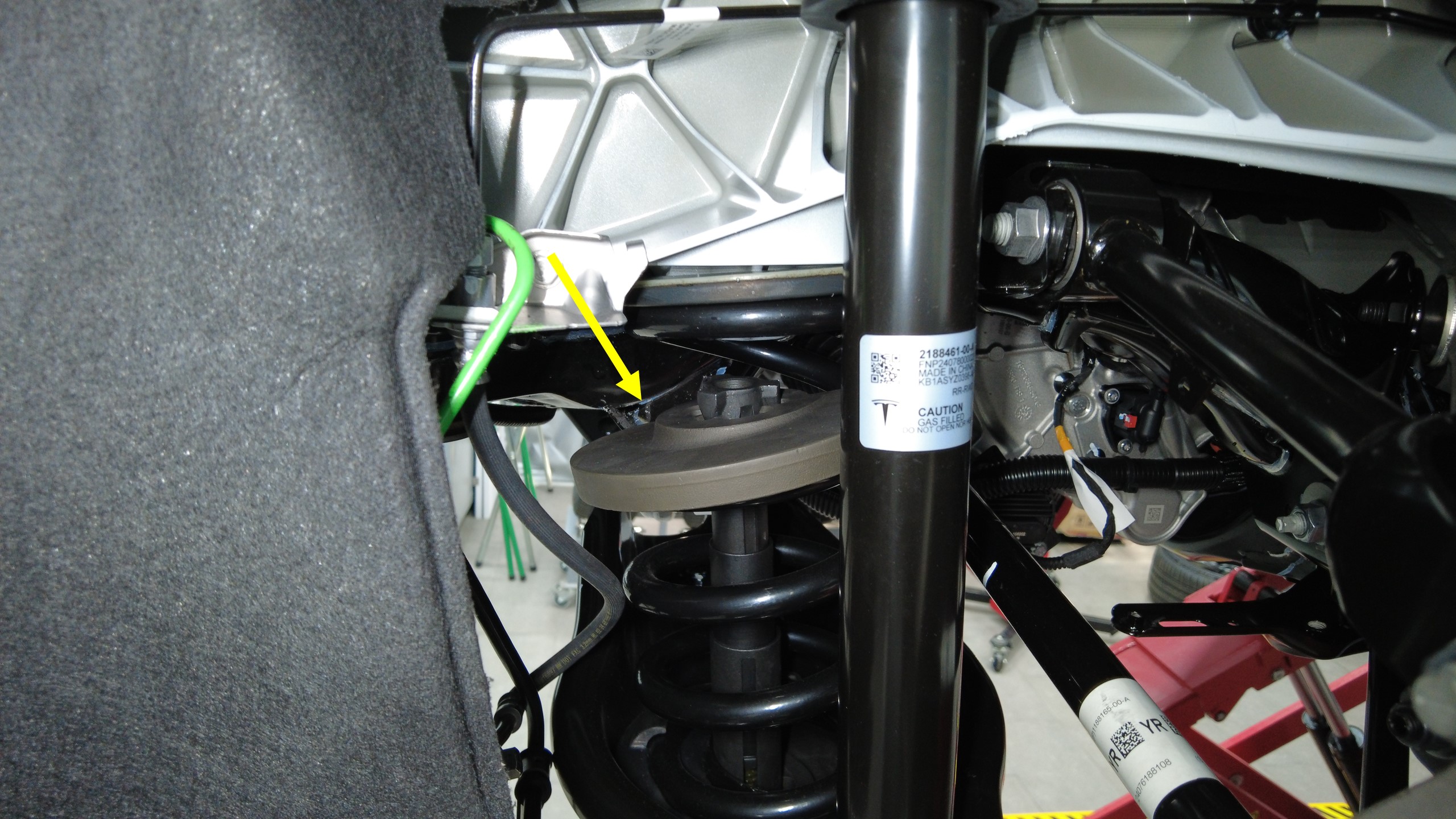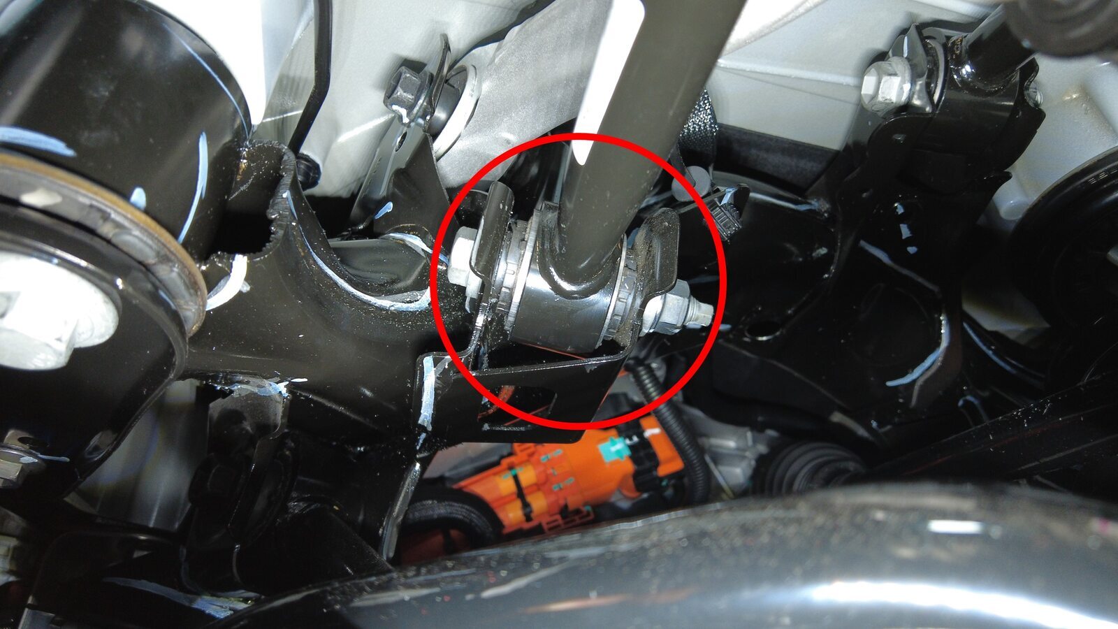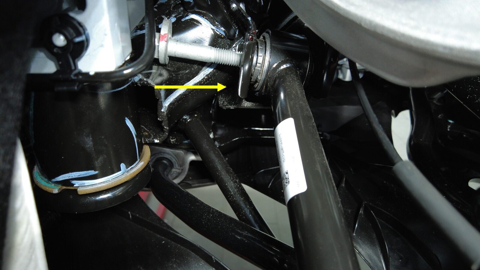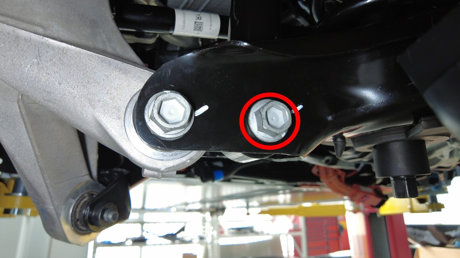 预装将右后止推杆固定到副车架的螺栓、垫片和螺母,将垫片调整到此前标记好的位置。
