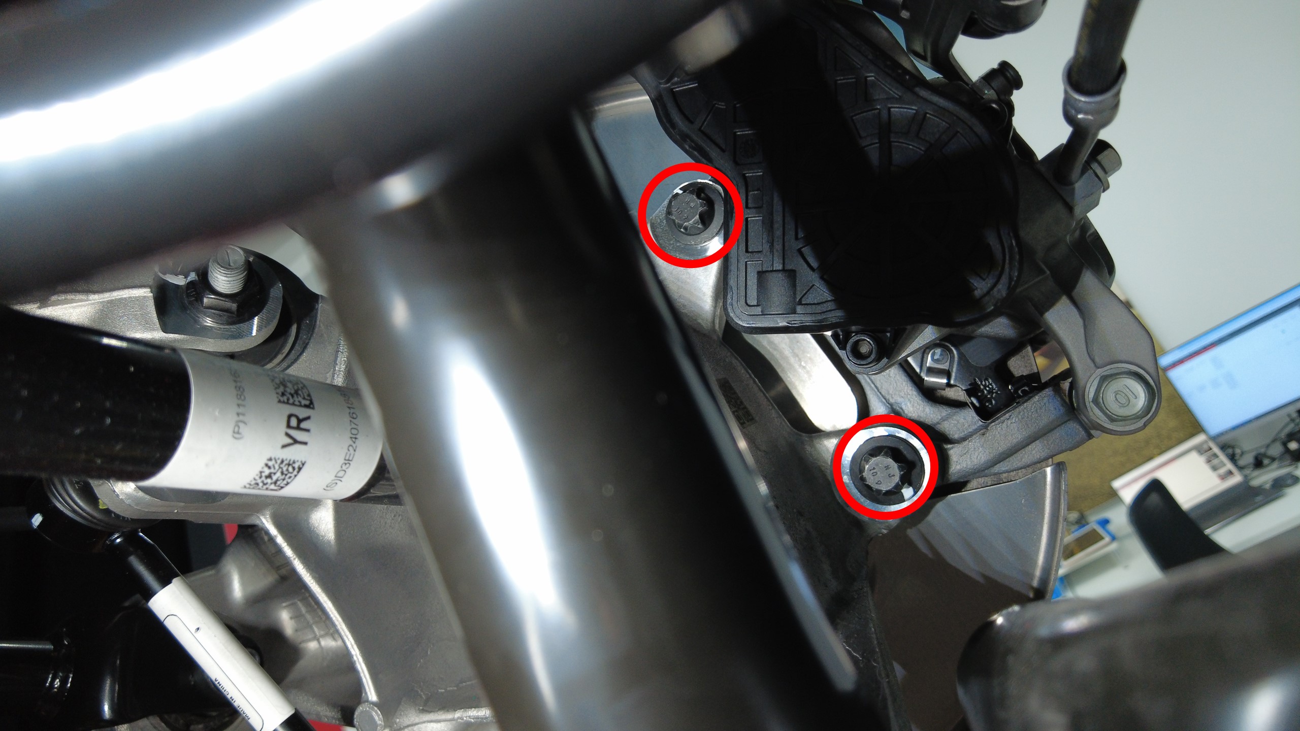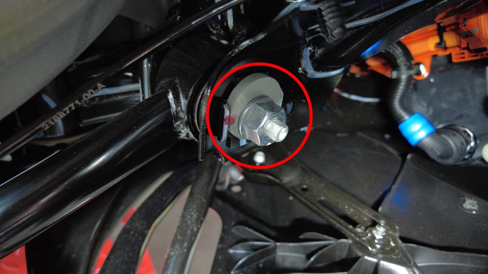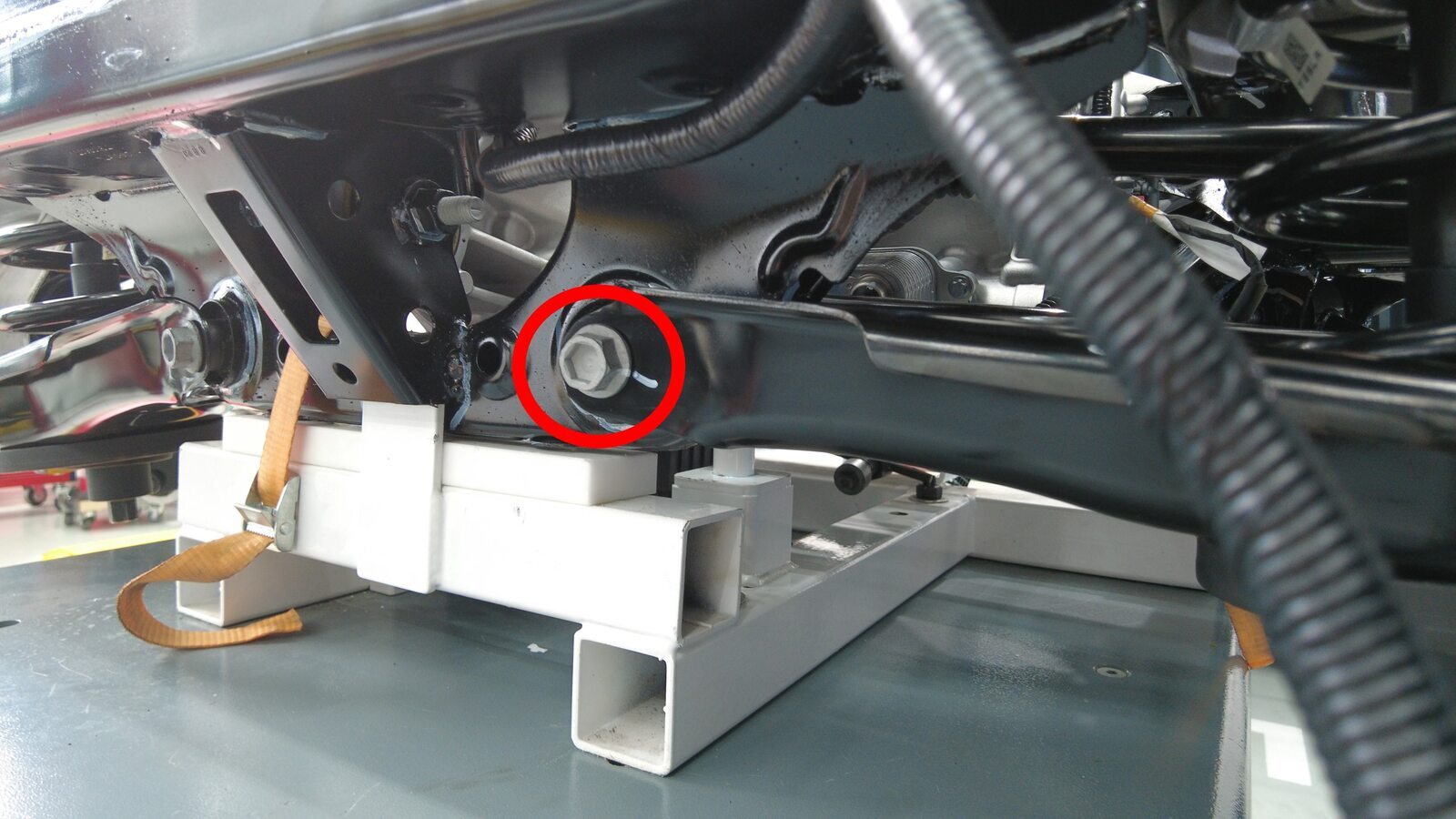 预装将右后下尾连杆固定到副车架的螺栓。