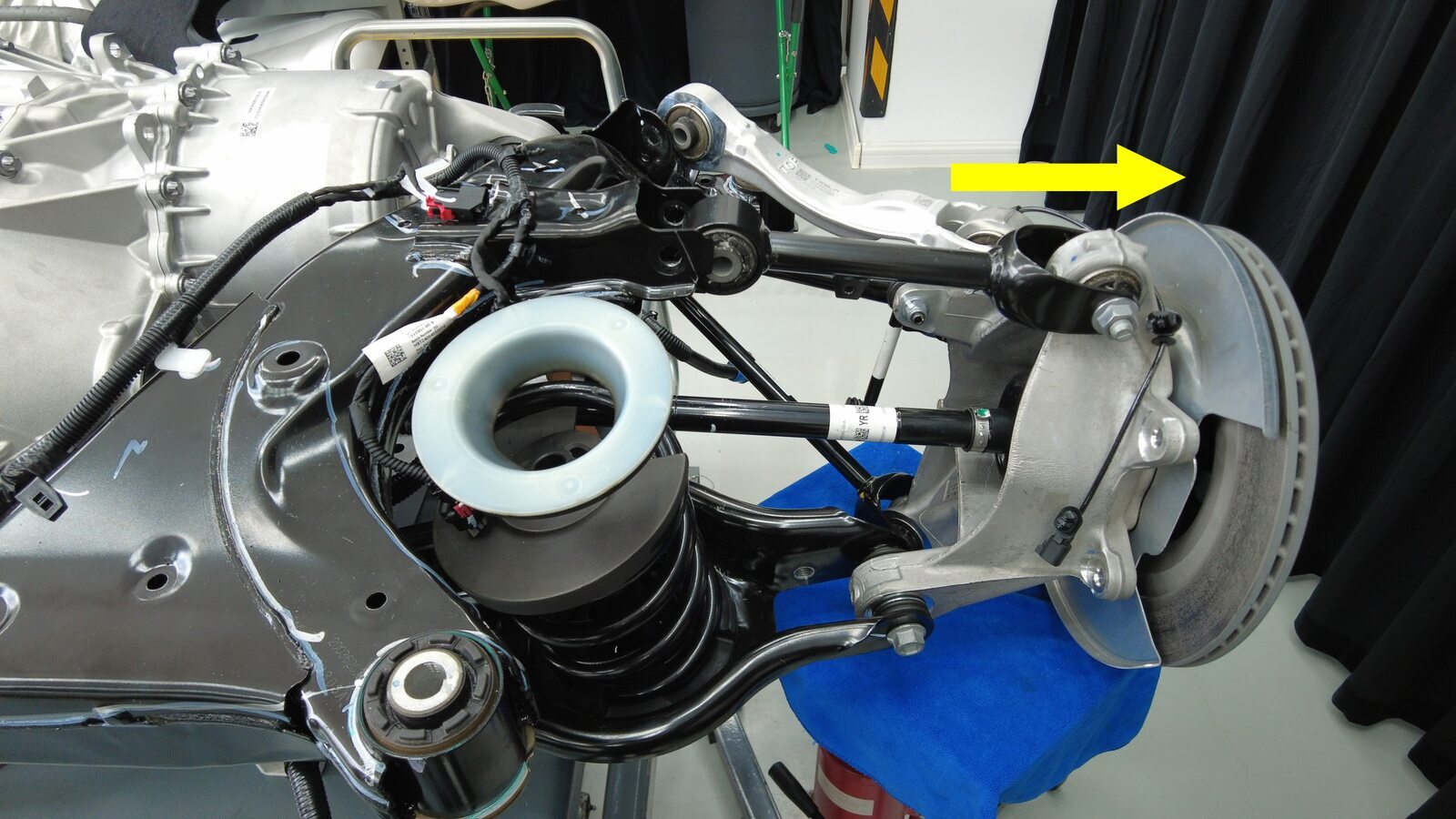 将支撑台架放置在右后下尾连杆下方,然后将右后悬架总成安装到后副车架上。