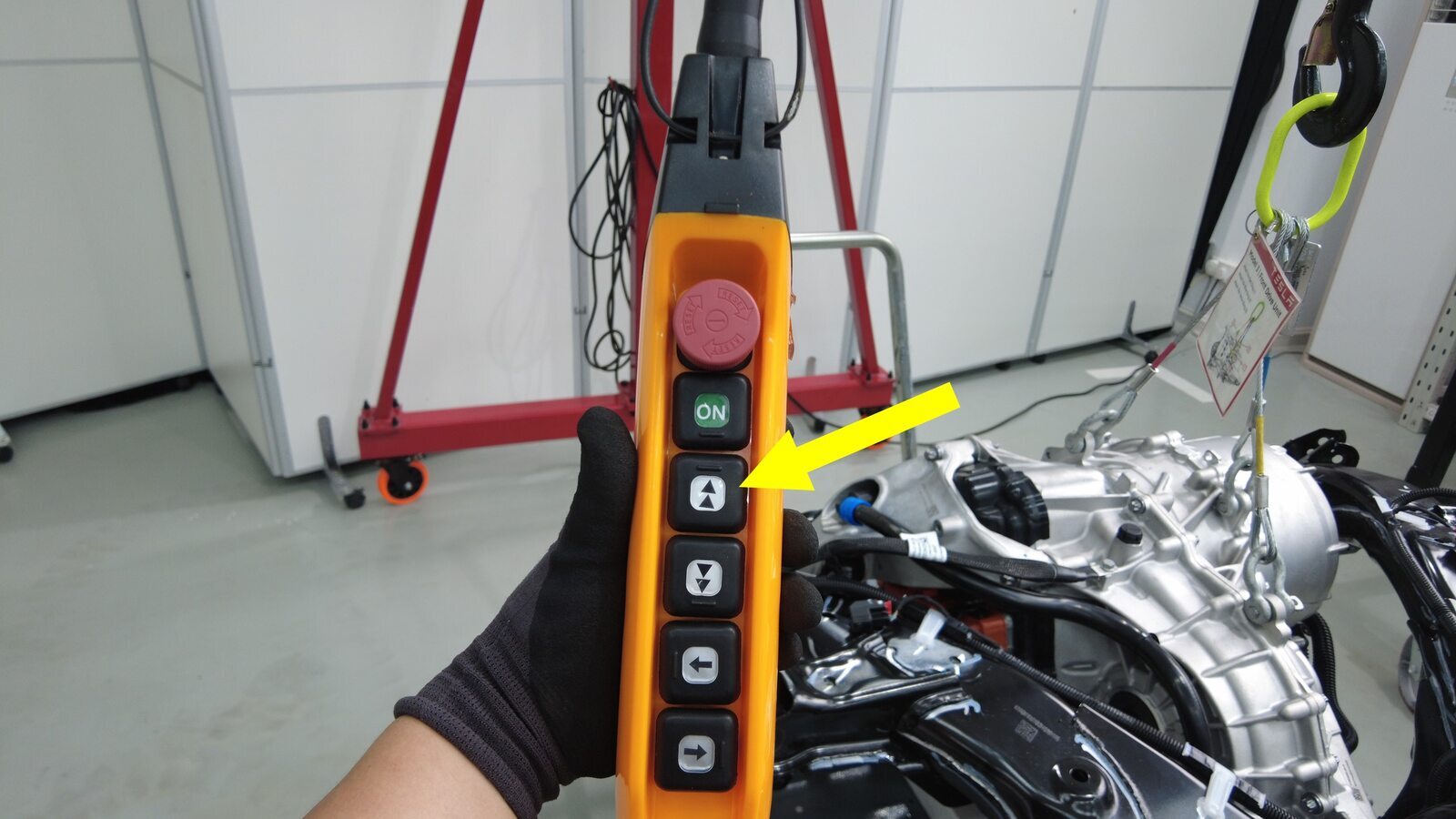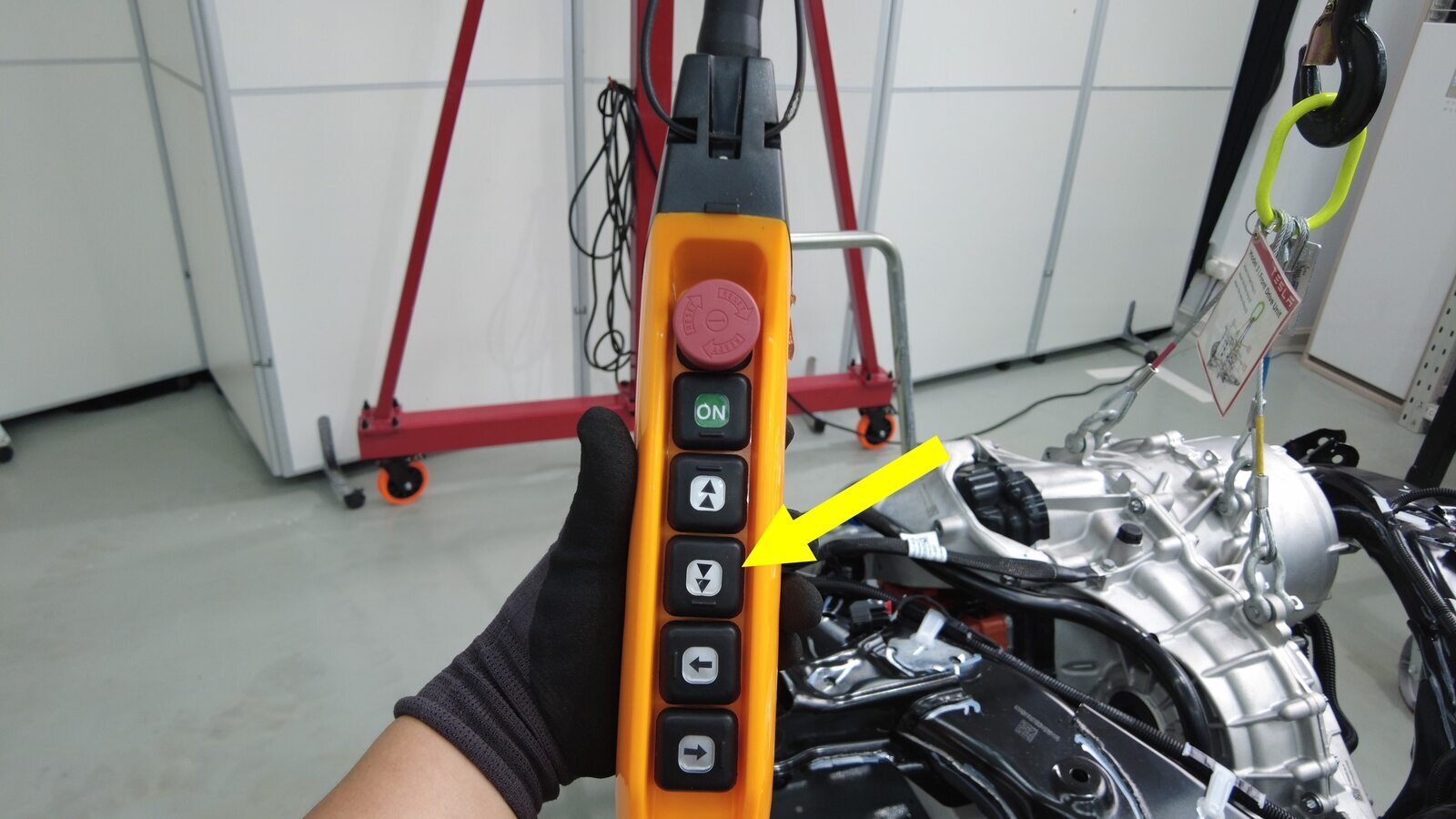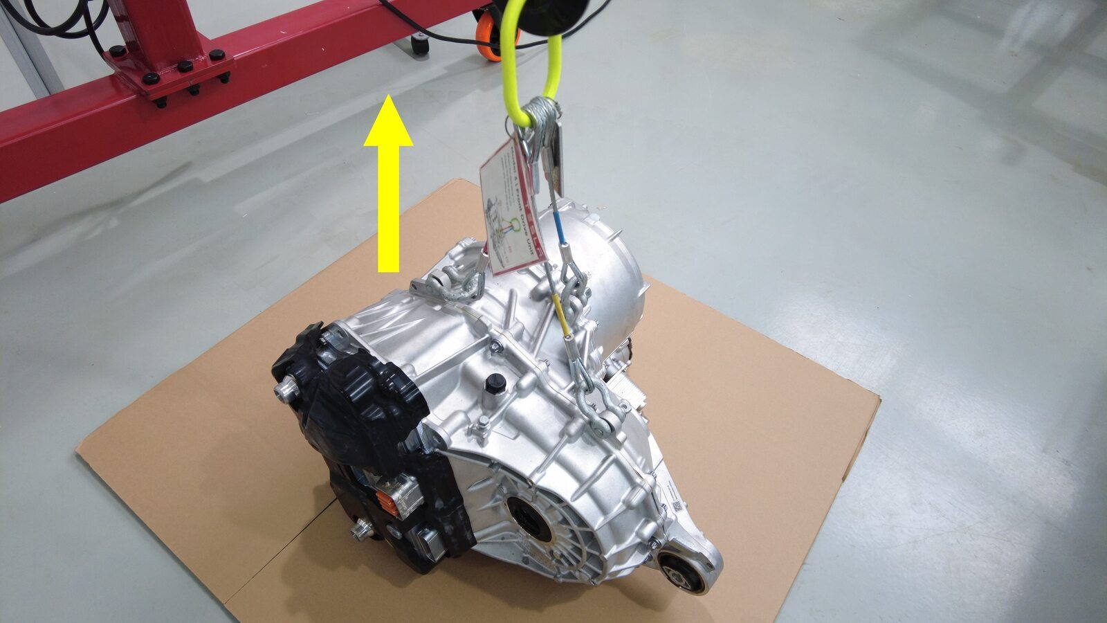 将空的驱动电机板条箱放置在后驱动电机下方,确保安全降下。