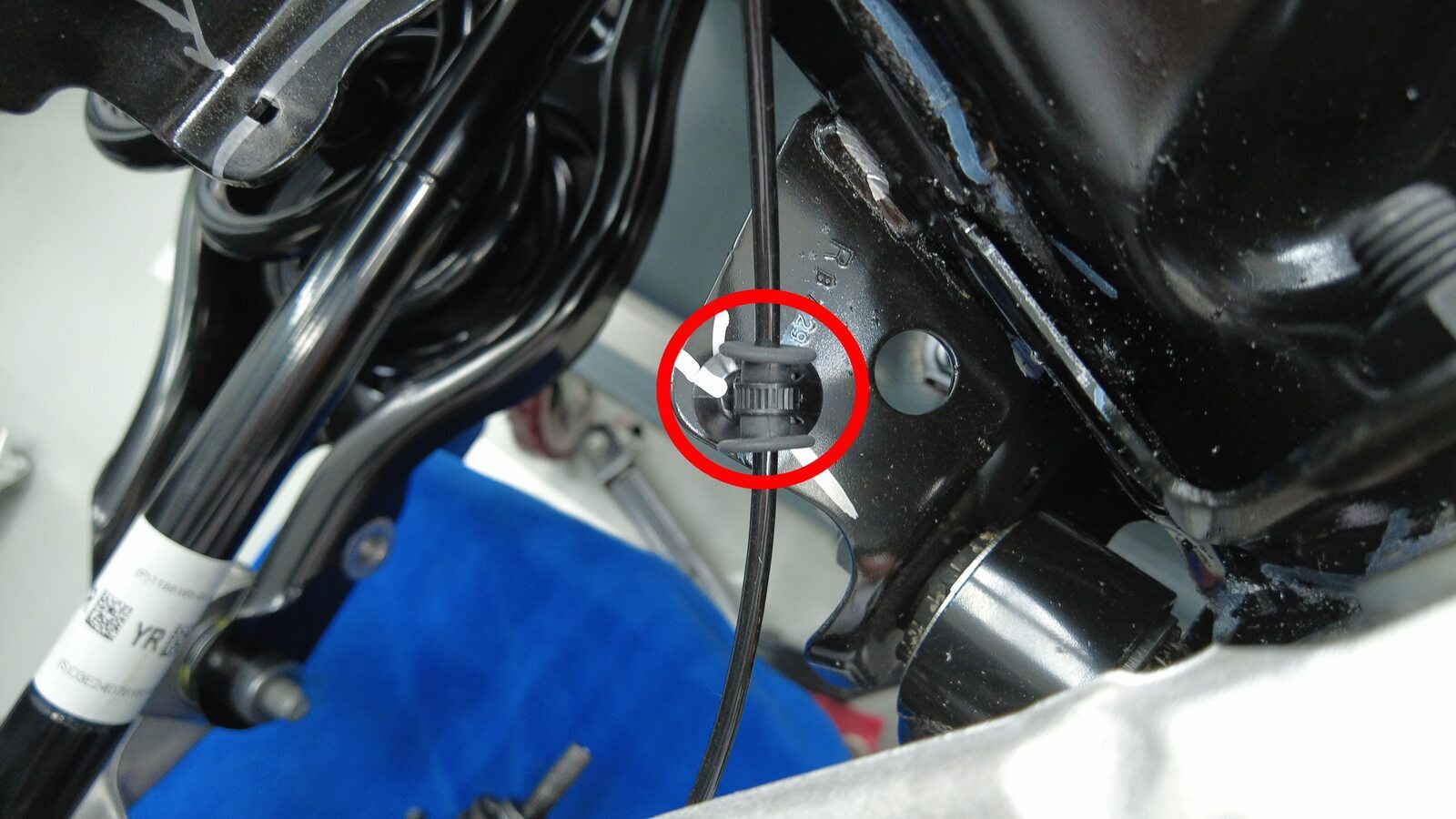 将左后轮毂转速传感器线束连接器卡子安装到后副车架上。