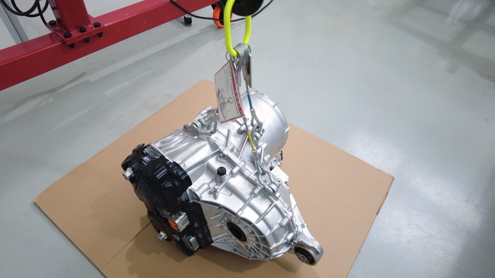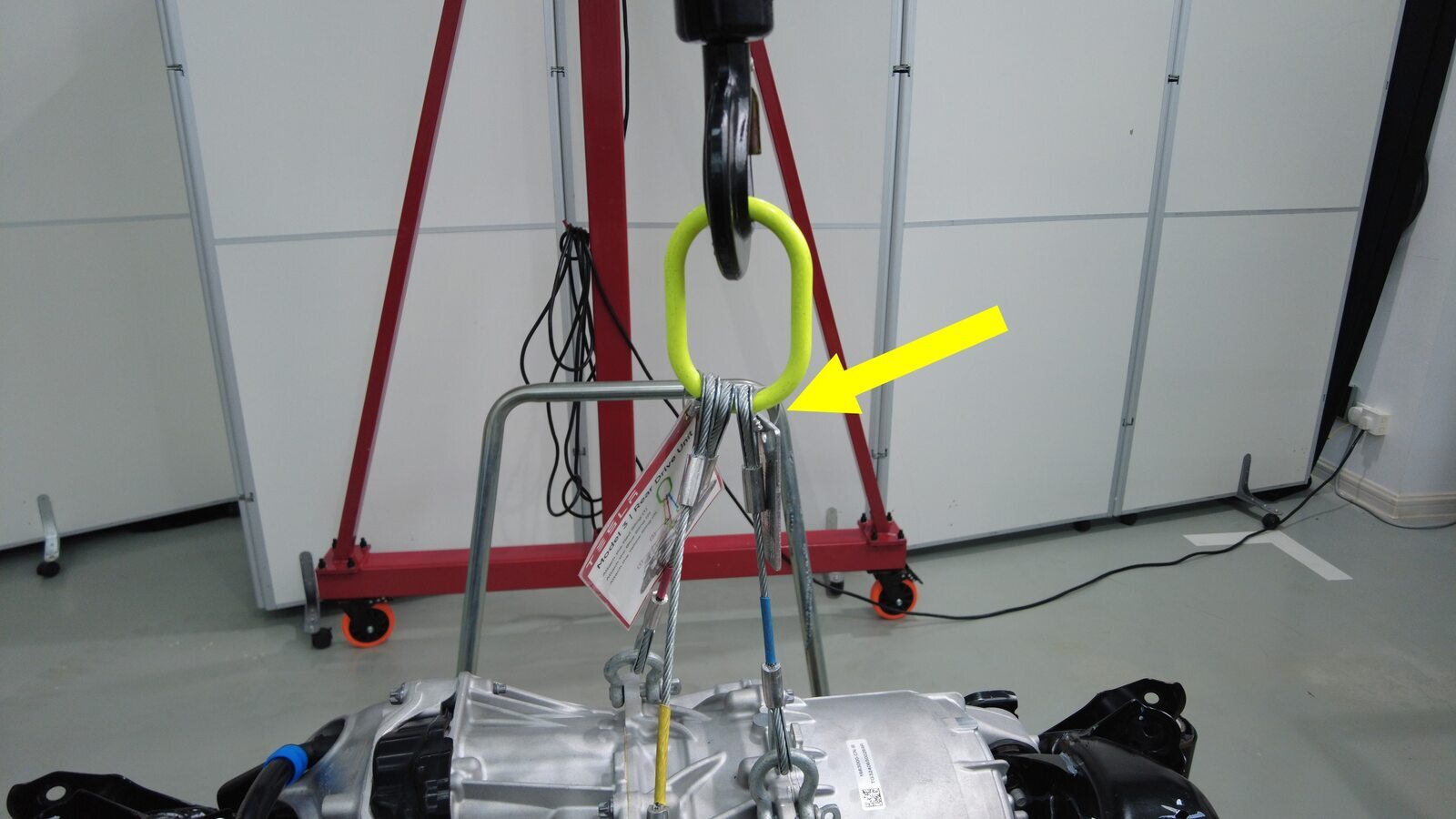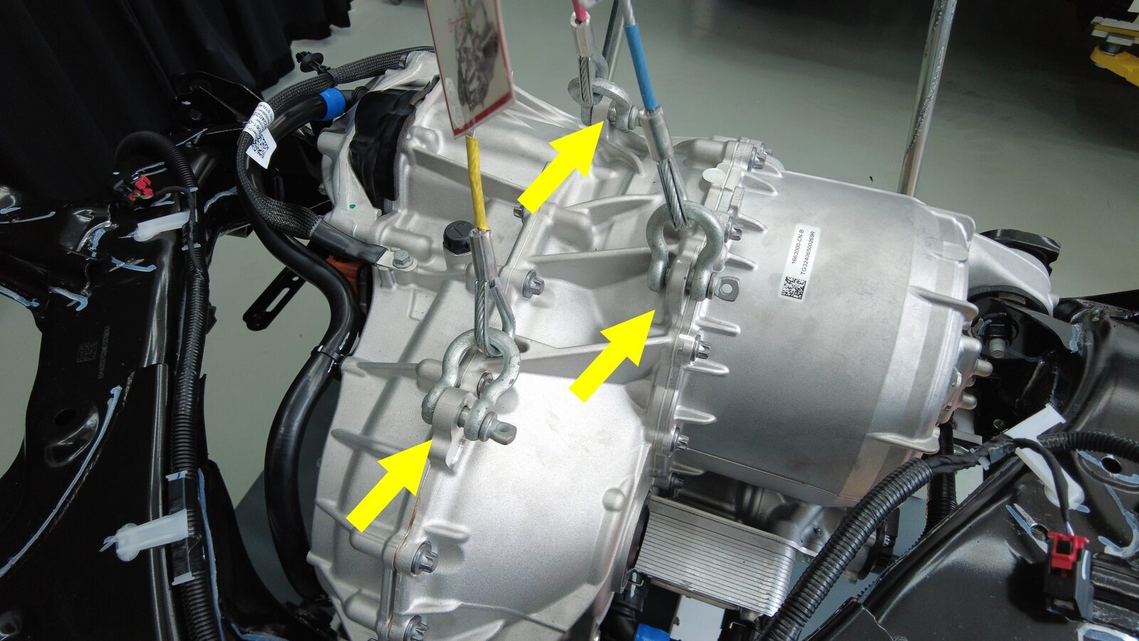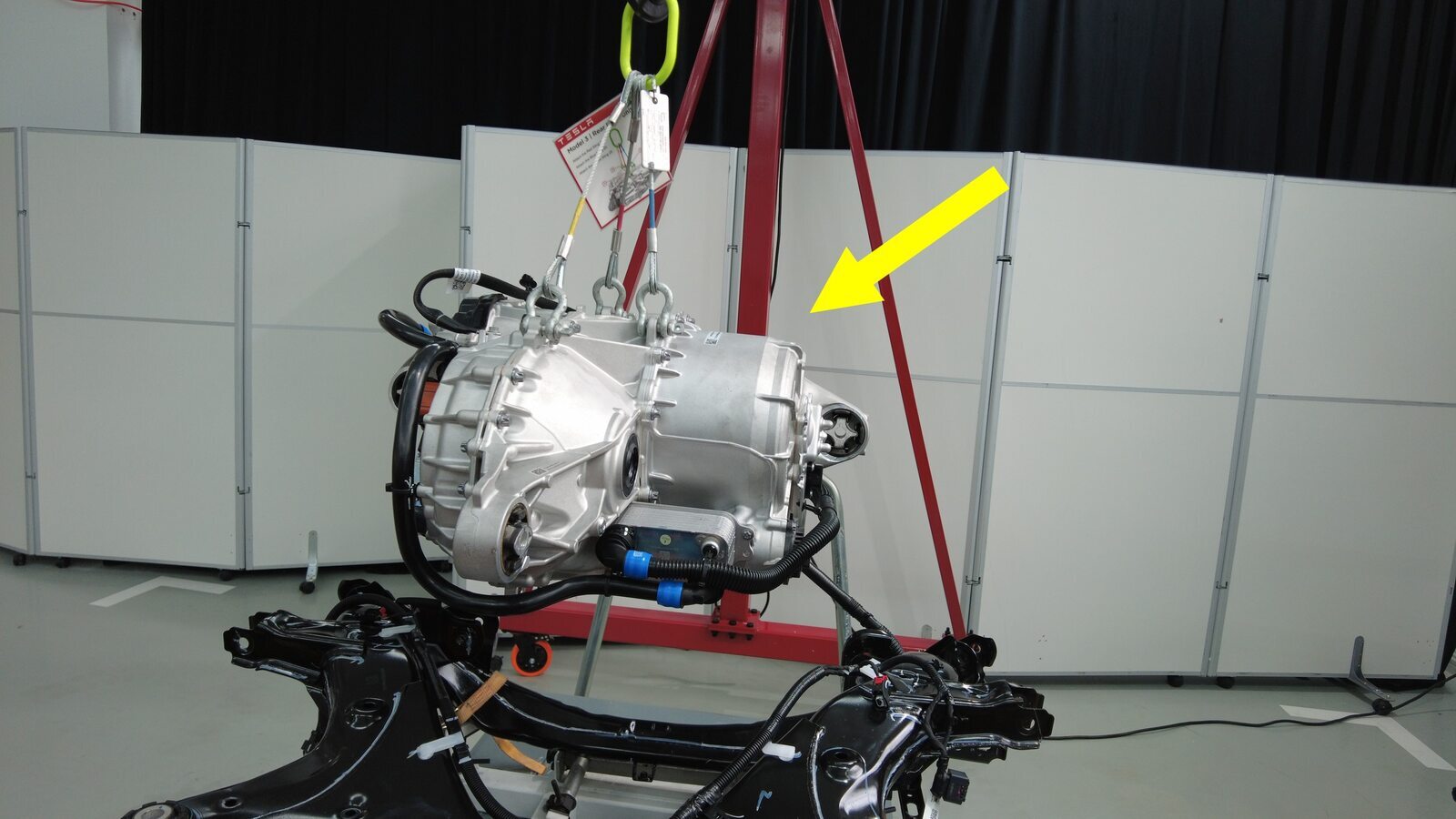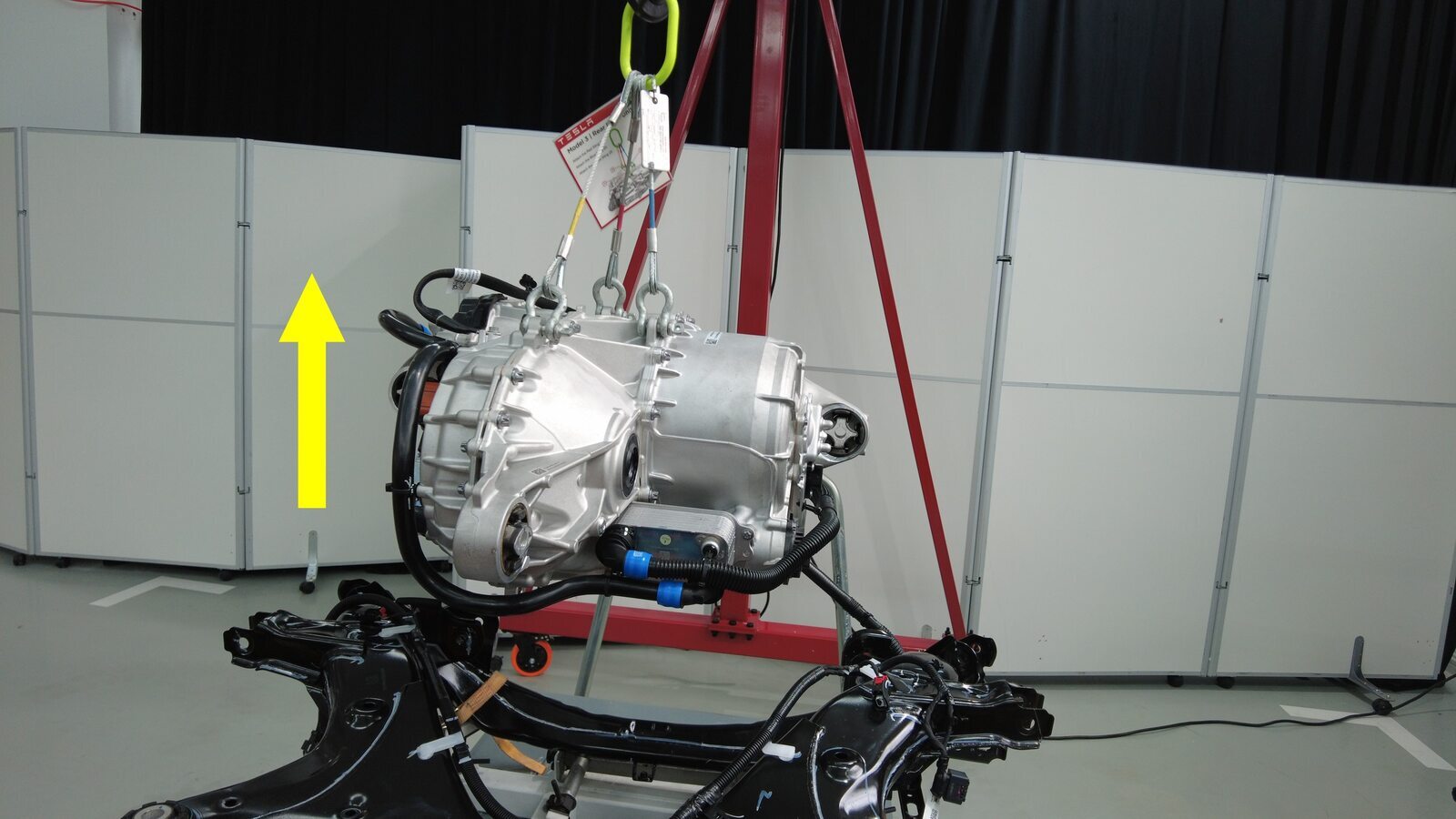降下吊索,将后驱动电机安装到后副车架上。