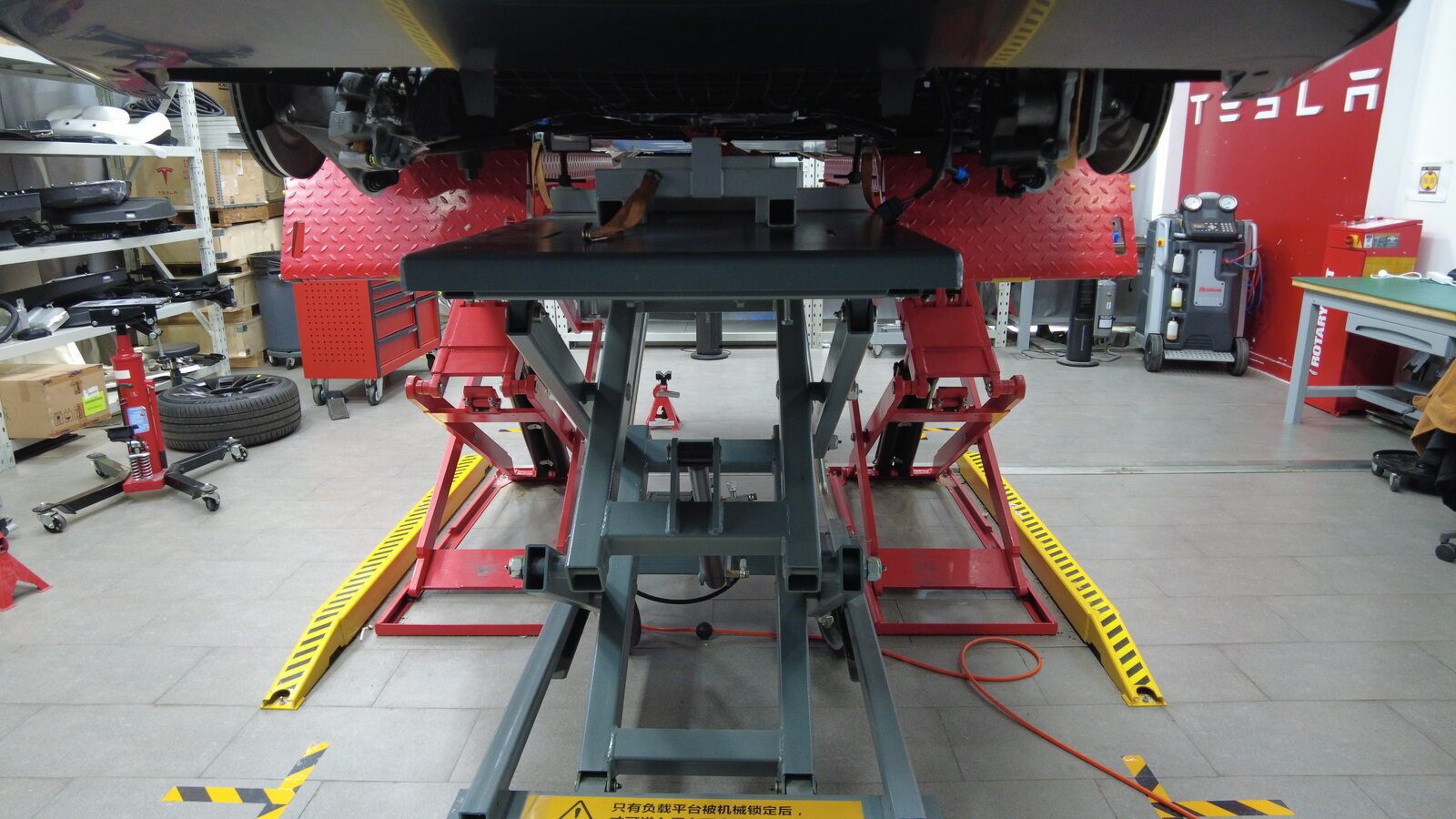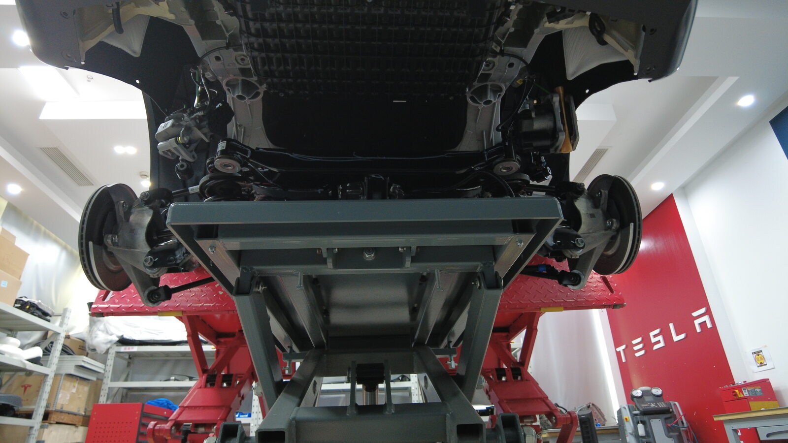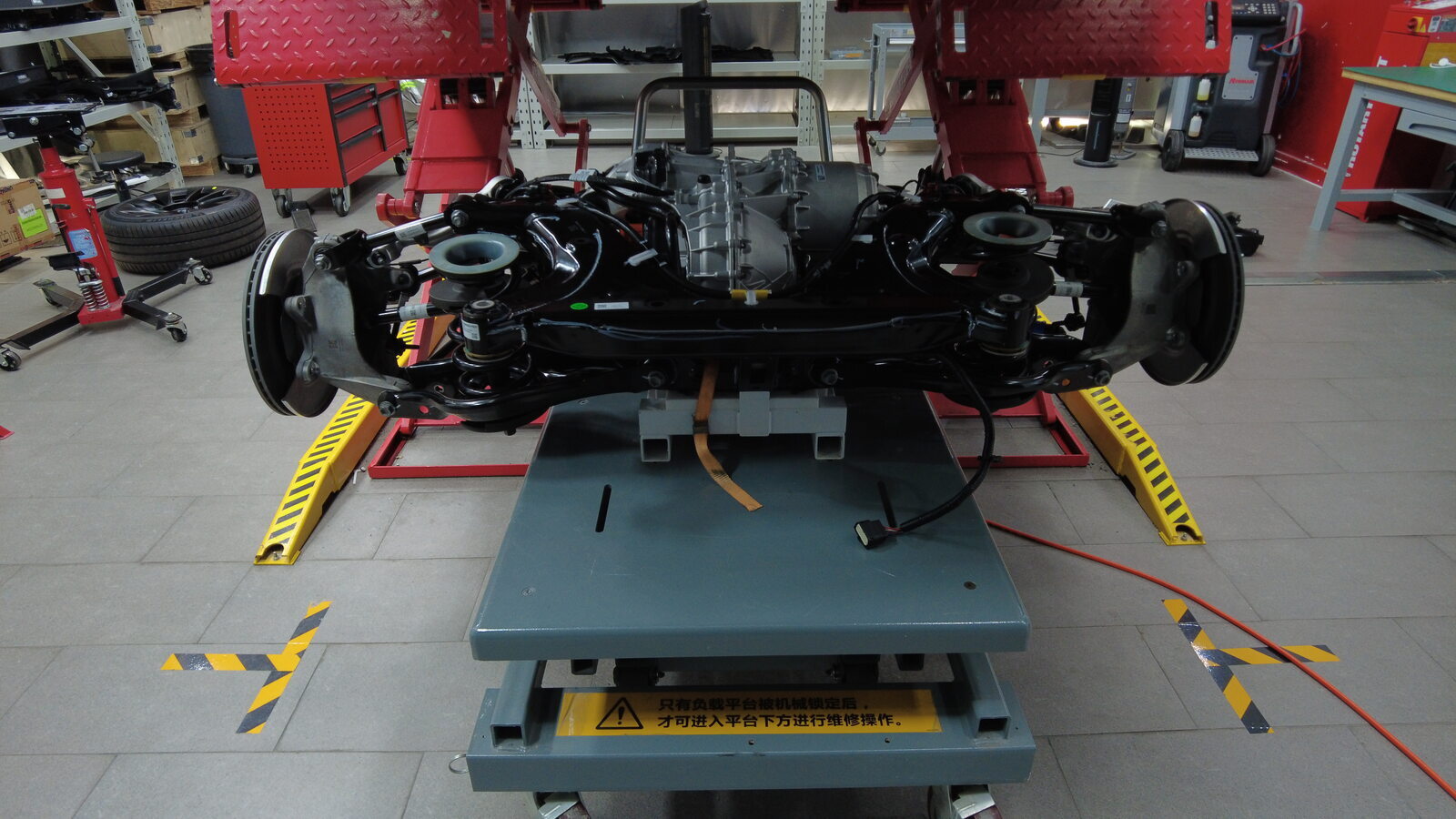 在后副车架区域下方放置副车架举升工具。