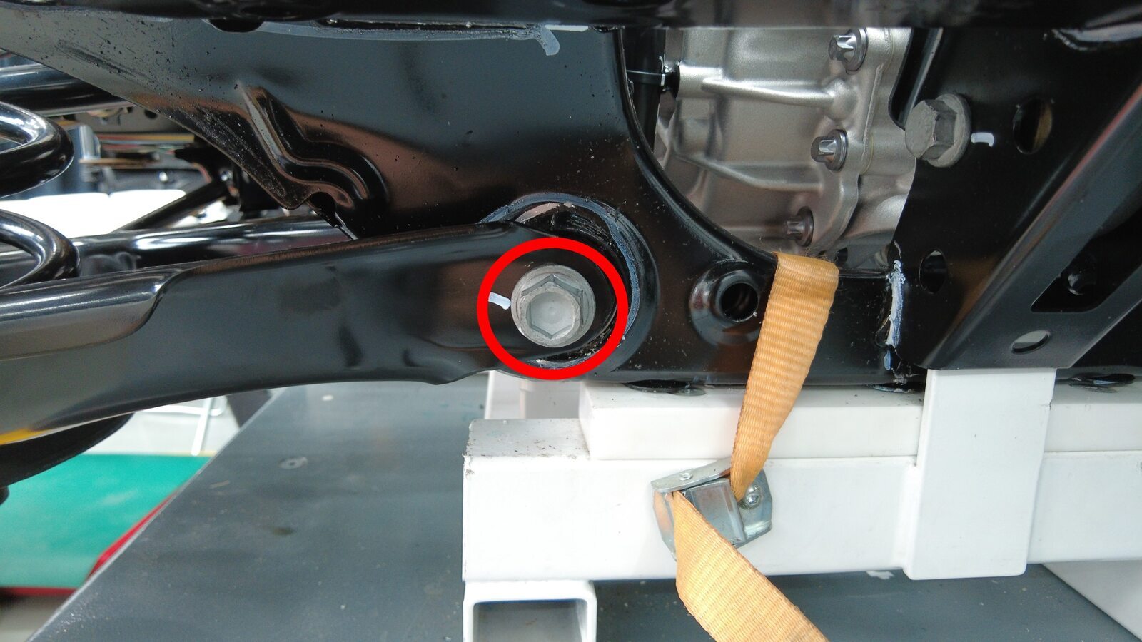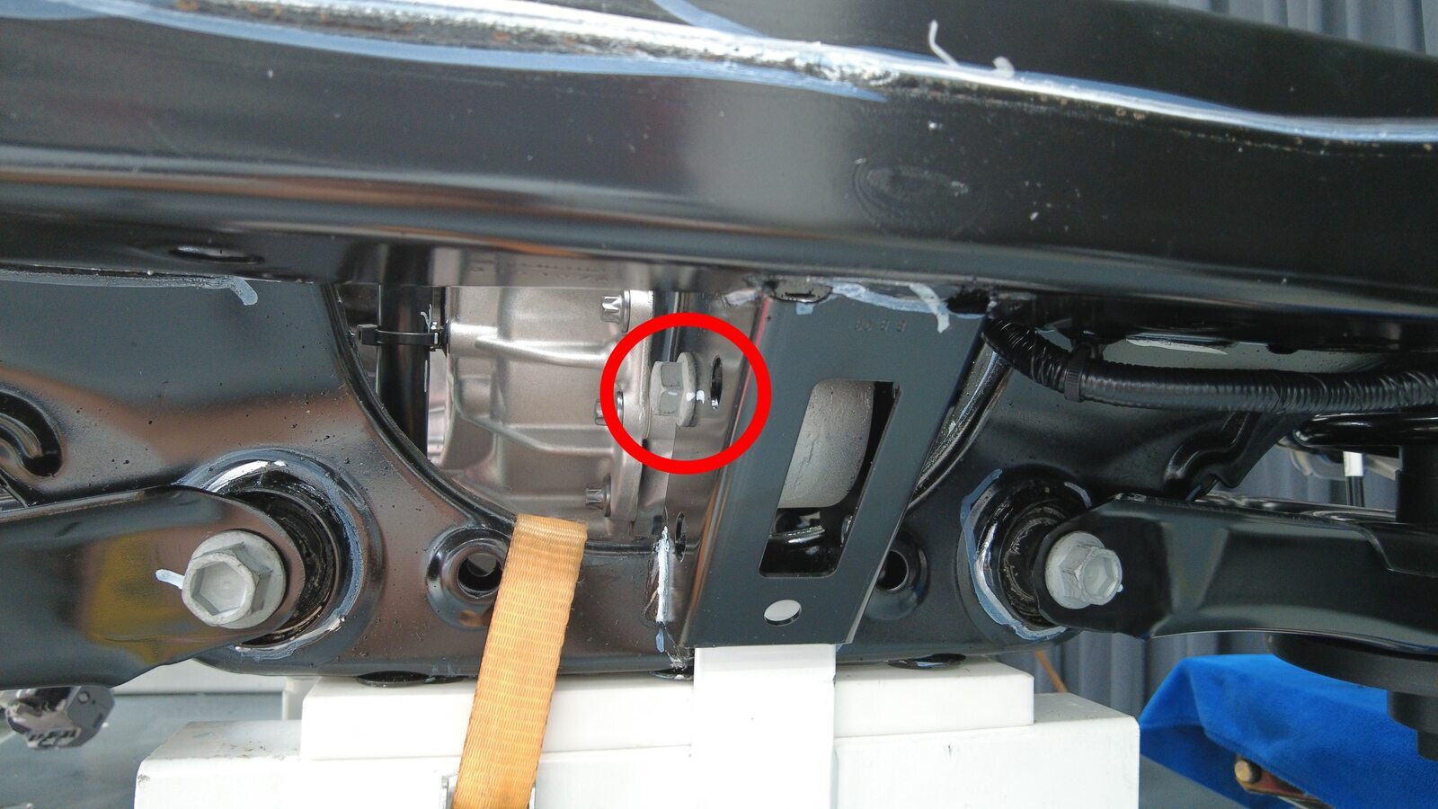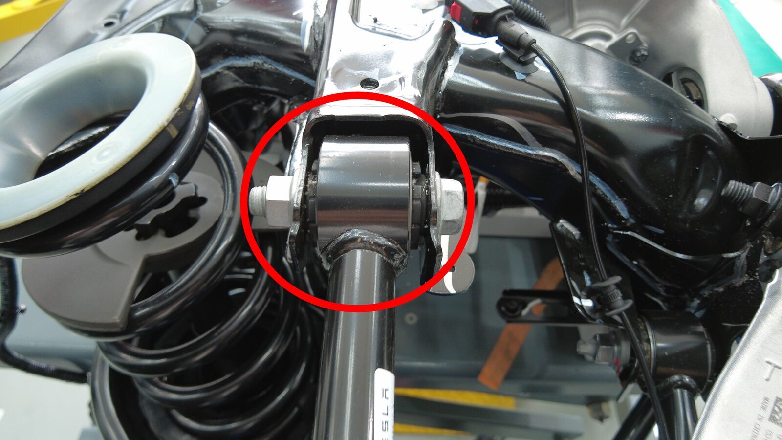 预装将左后止推杆固定到副车架的螺栓、垫片和螺母,将垫片调整到此前标记好的位置。