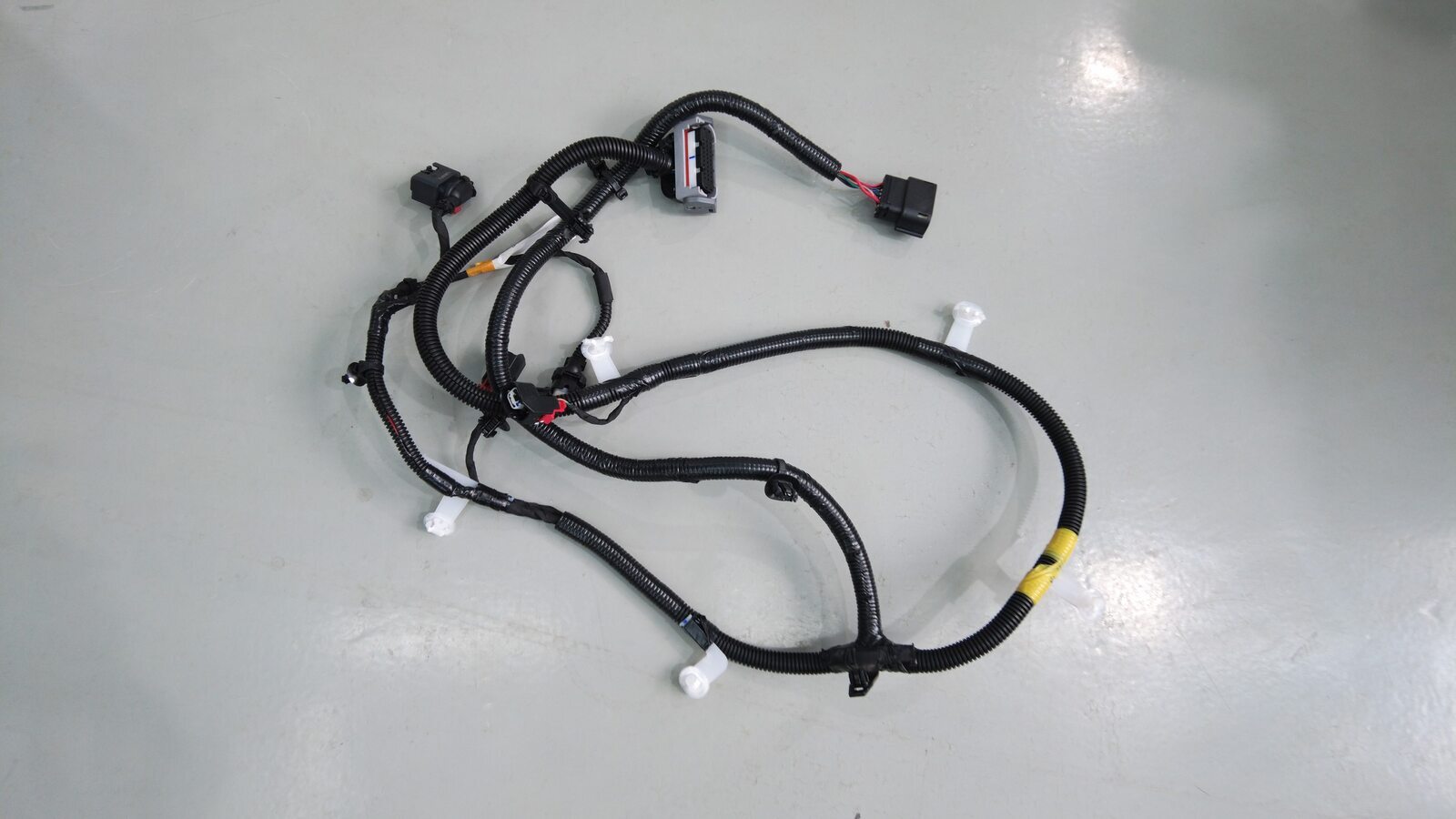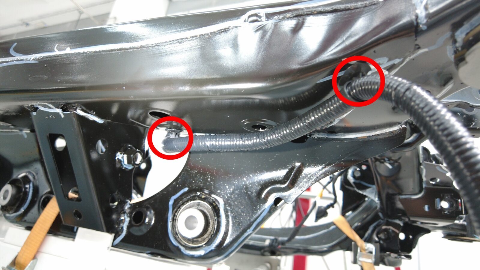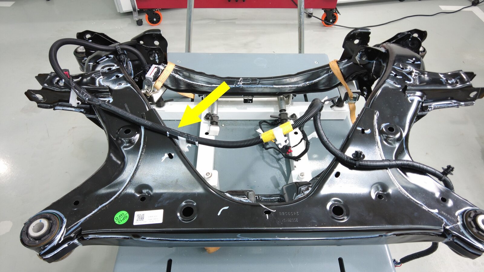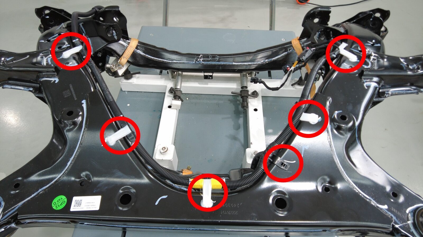 将后副车架线束布设到后副车架上,然后安装将线束固定到副车架顶部的夹子(8 个)。