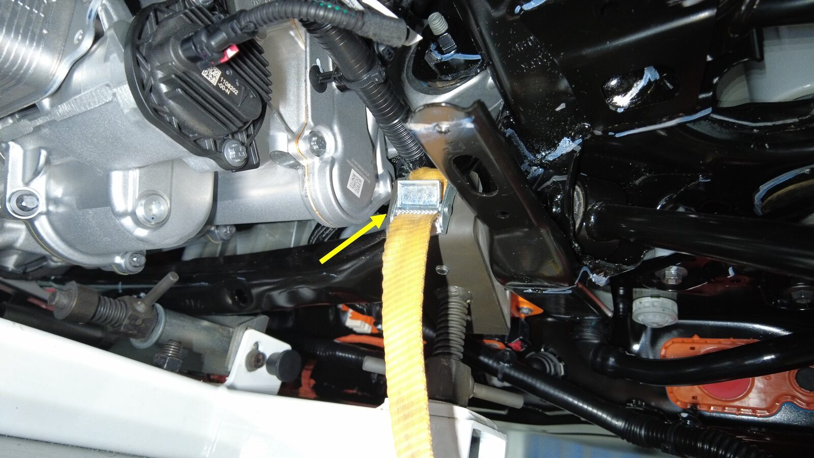 升起副车架举升工具以支撑后副车架,将系带(3 个)上的金属钩固定到举升工具卡环上,然后拉动系带,直至其紧固。