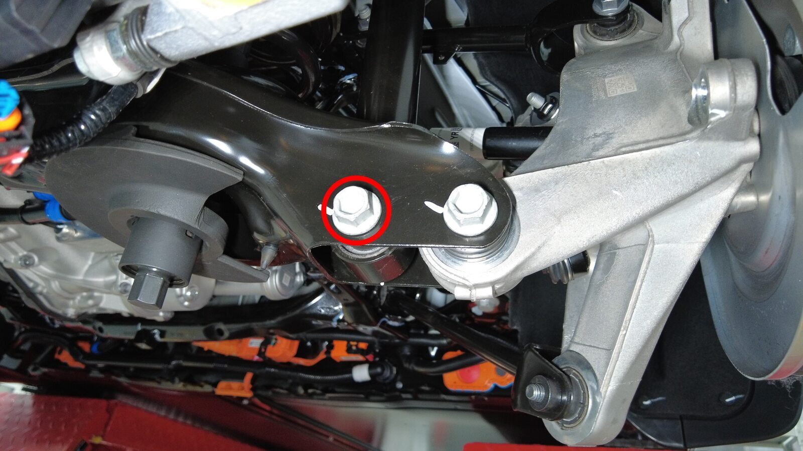 预装将右后下前连杆固定到副车架的螺栓。