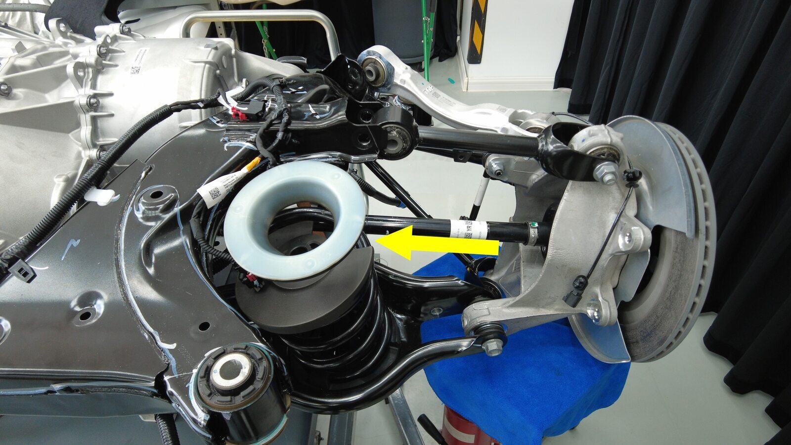 将支撑台架放置在左后下尾连杆下方,然后将左后悬架总成安装到后副车架上。