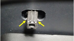 使用饰板工具小心地松开将第一排左侧座椅大腿伸展开关按钮固定到座椅总成的锁片(2 个),然后将按钮从总成上拆下。