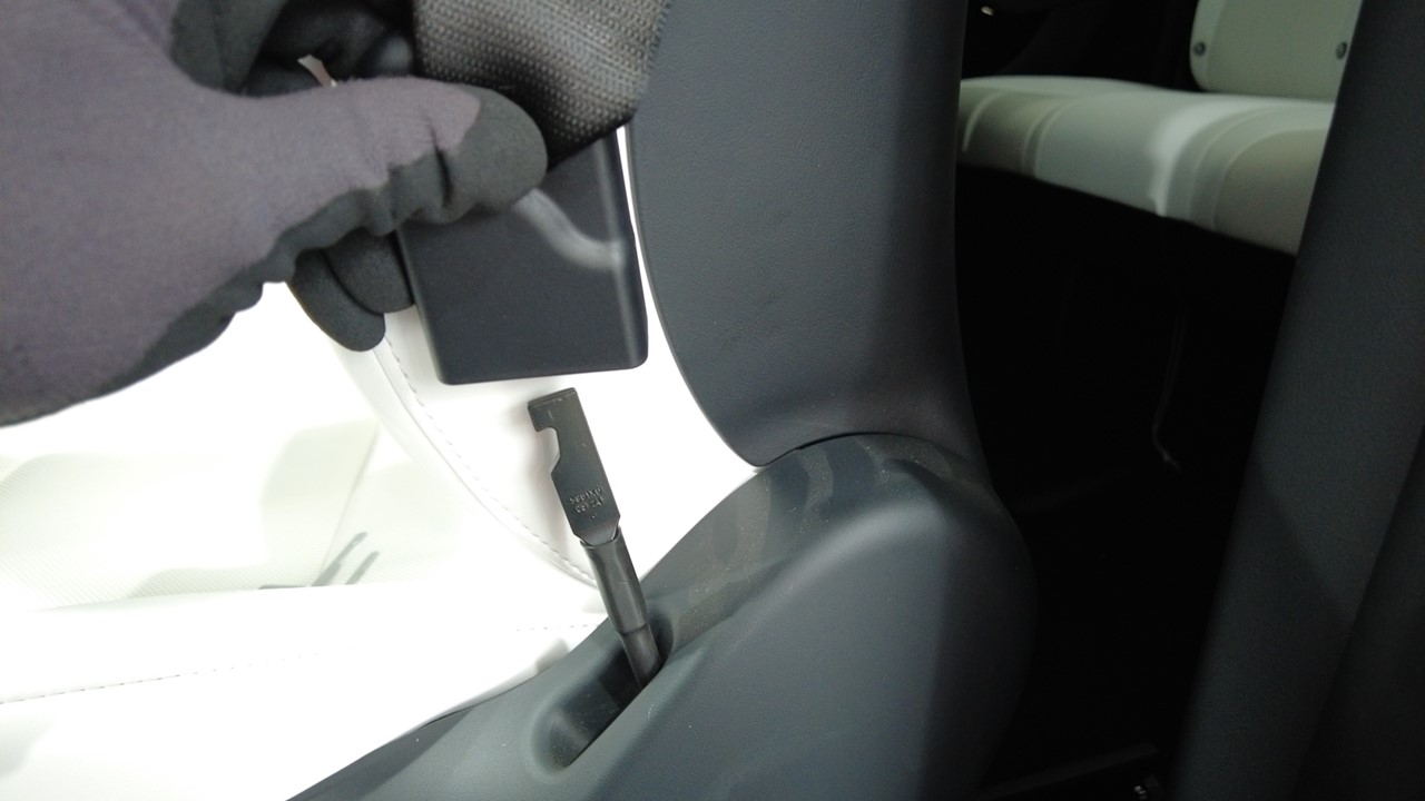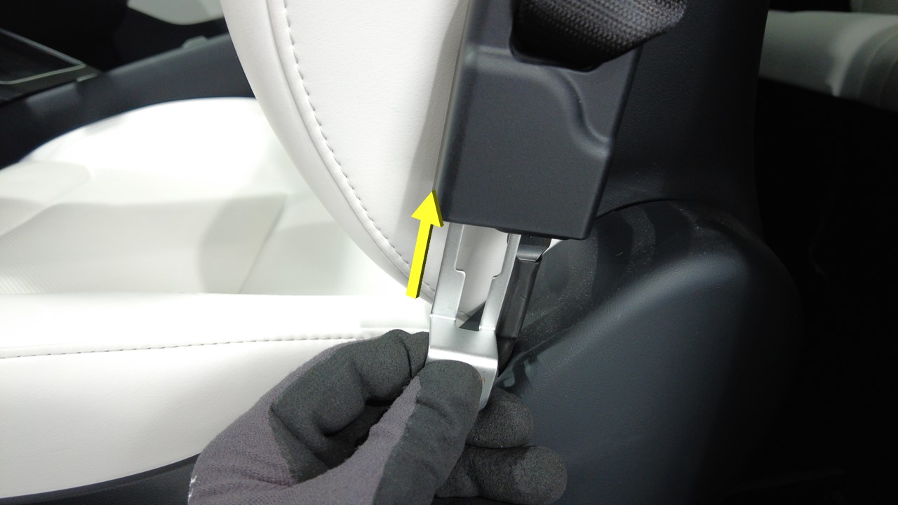 将座椅安全带释放钥匙 (1133787-00-A) 插入安全带预紧器连接件底部,将安全带从预紧器上松开。
