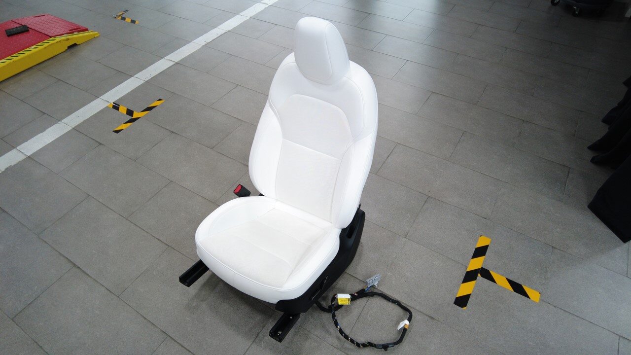 在协助下,撑起第二排座椅靠背,将左前座椅安装好。