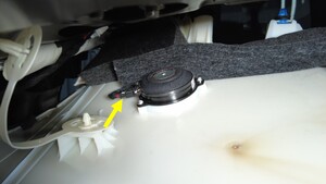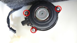 拆下将左后扬声器固定到顶篷的螺钉(3 个),然后将扬声器从车辆上拆下。