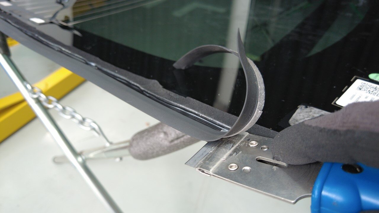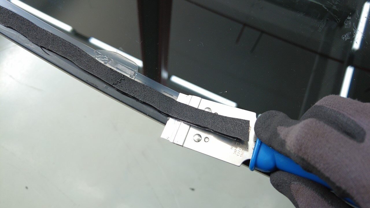 使用剃须刀片,小心地清除掀背尾门上的旧聚氨酯。