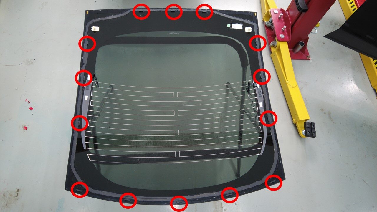 将线固定在穿线器上,然后将穿线器从车辆内部穿过背光灯玻璃左侧固定销附近的胶黏剂涂层。