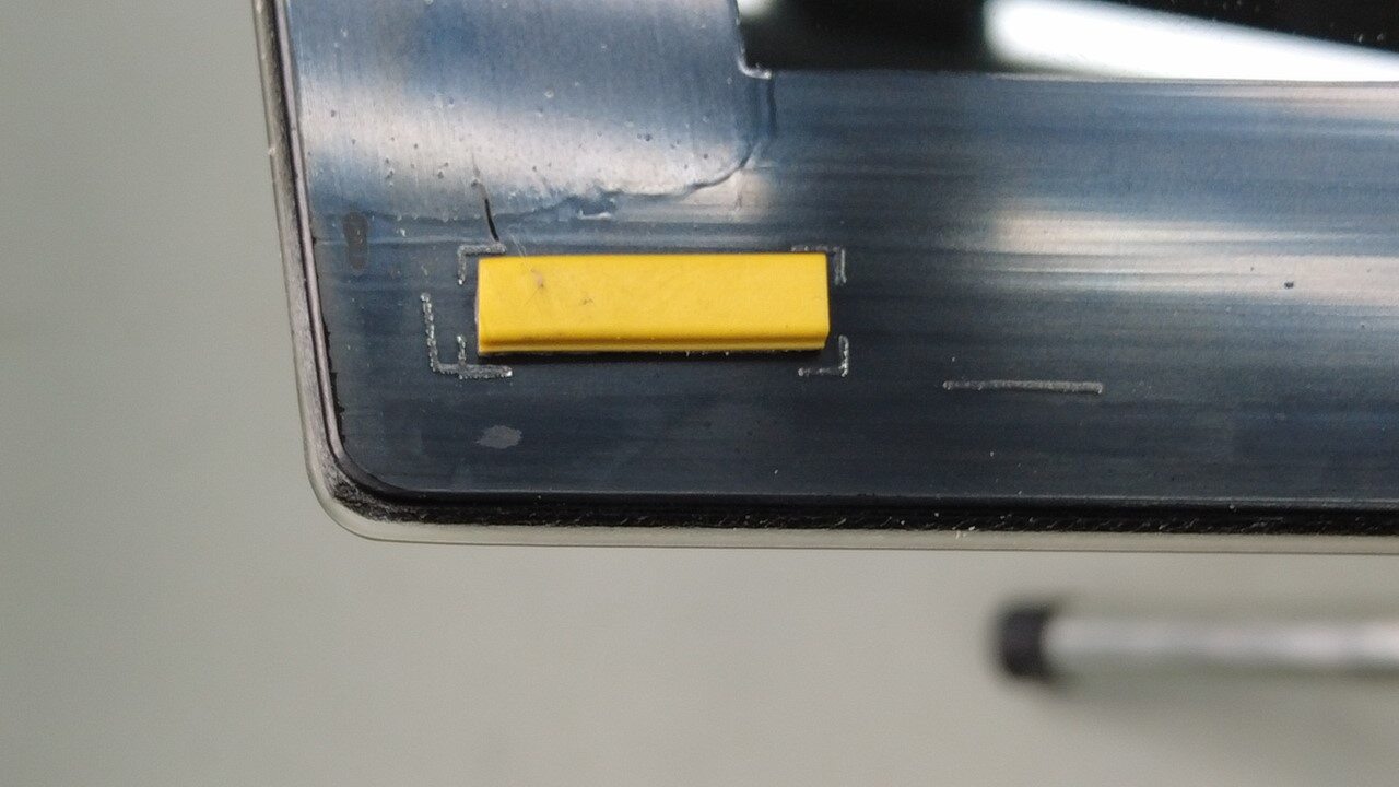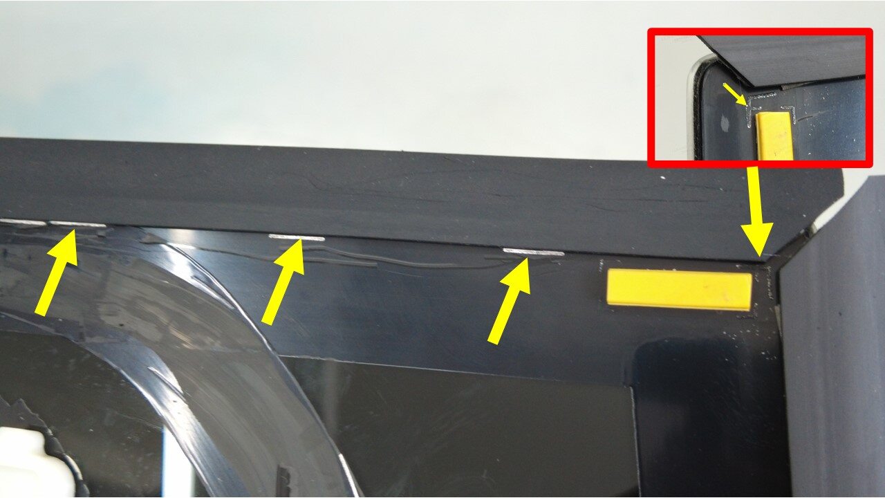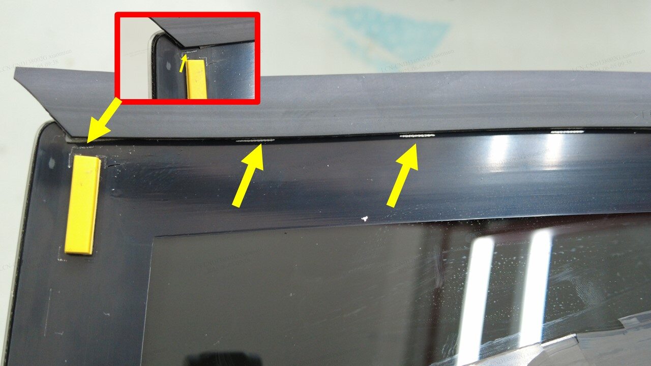 注玻璃上有辅助安装网垫的对齐标记。背光灯顶部两侧的垫片是黄色的。