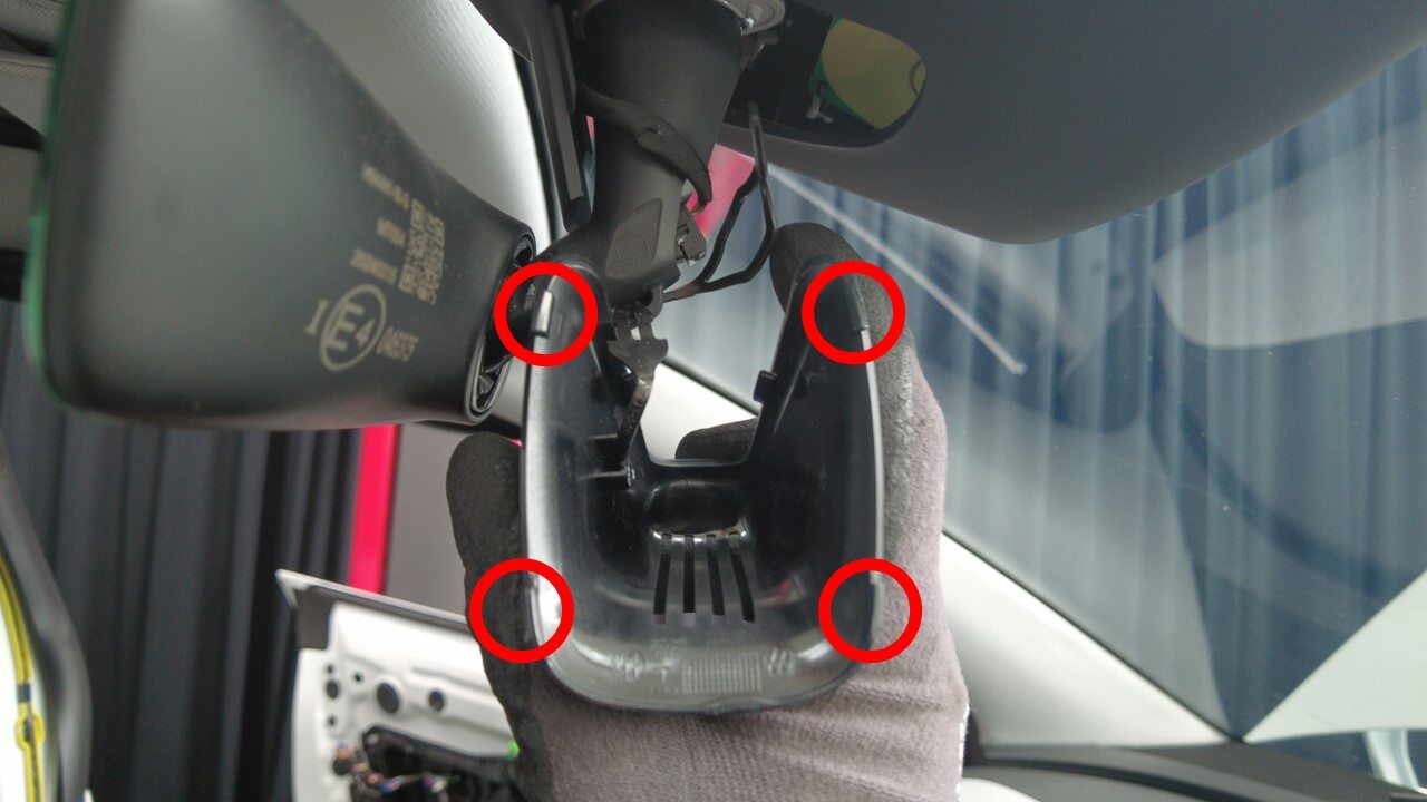挤压摄像头下盖两侧,然后将其拉离后视镜,以松开锁片(4 个)。