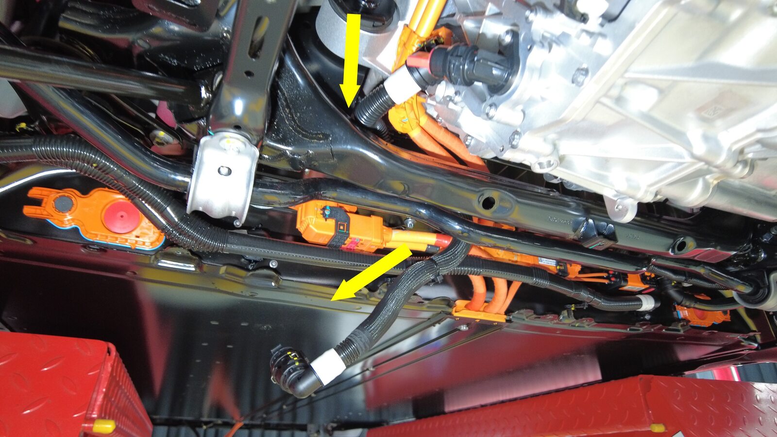 将后驱动电机变流器入口软管放置在副车架和后驱动电机之间,以备安装。