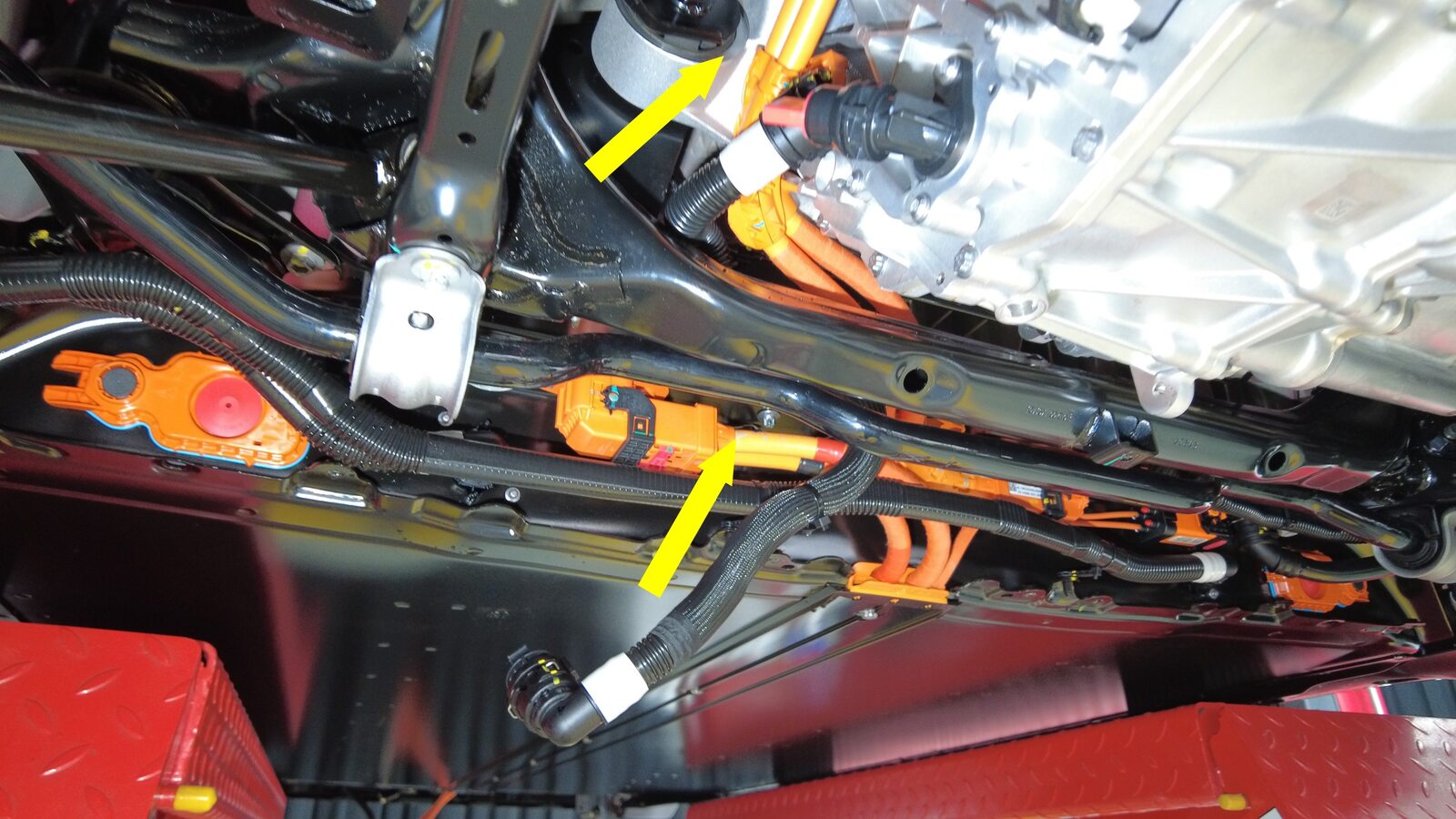取下塞子,将后驱动电机变流器入口软管连接到高压电池后部。