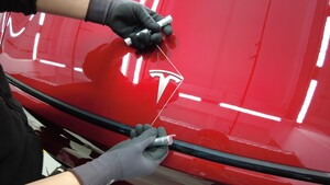 - 关闭前备箱盖,放置好徽标拆卸工具,使单丝线可以从前部 Tesla 徽标的一角下方开始切割。