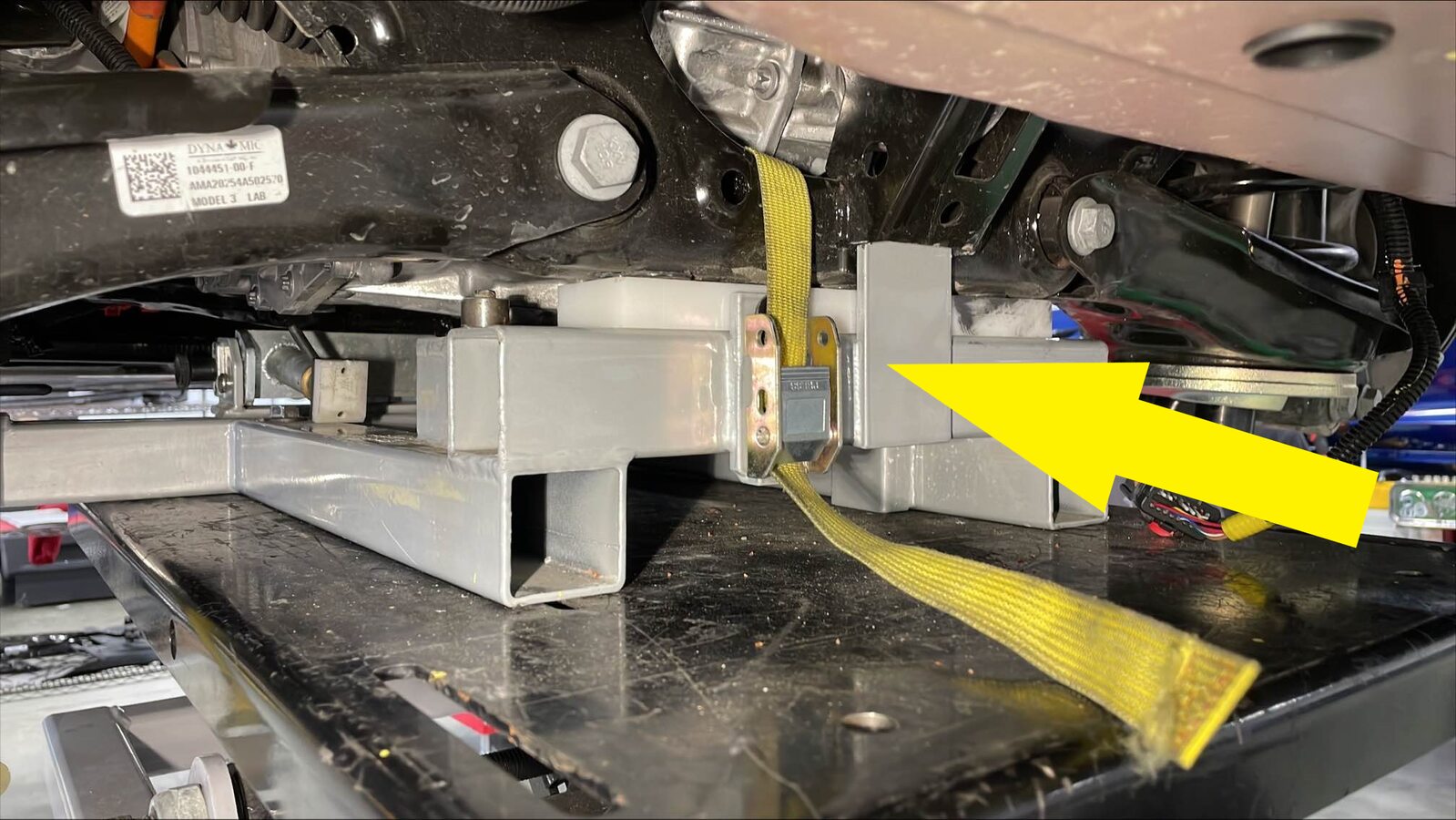 在后副车架上方缠绕系带,将系带末端挂在金属环上,然后拉紧系带,将副车架紧固到后副车架举升工具。