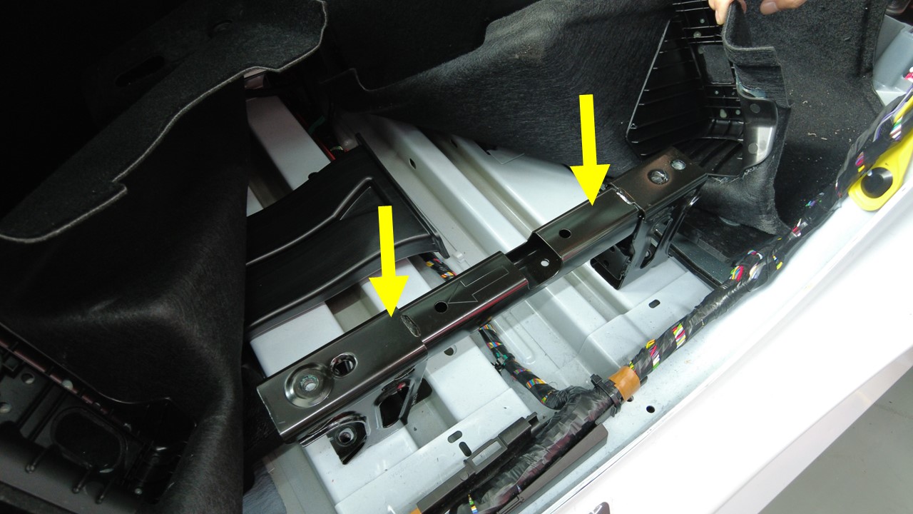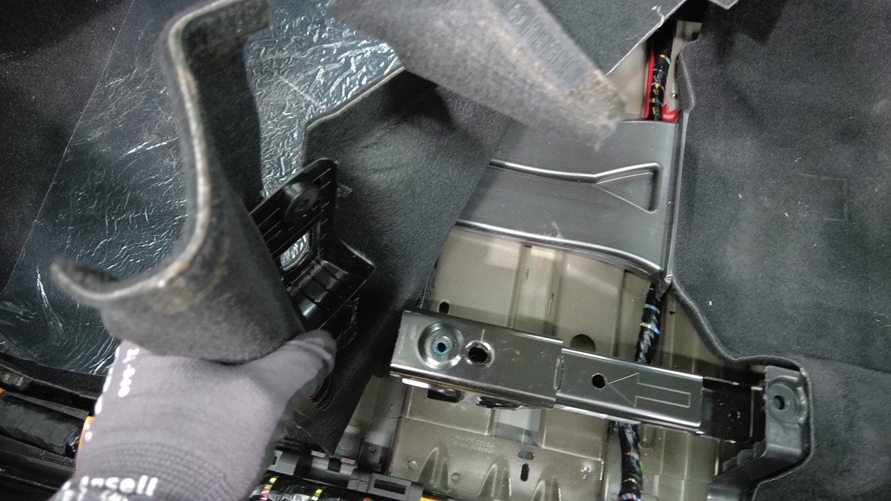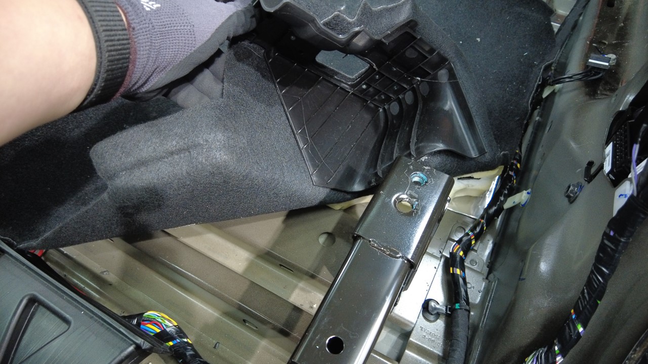 注在 LH 外侧座椅升降器后部附近抬起后部主毡毯的前边缘。