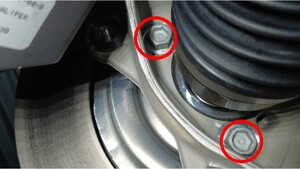 拆下并弃用将左前制动钳固定到左前转向节的螺栓(2 个),将制动钳从转向节上拆下,然后将制动钳挂在 S 型钩上。
