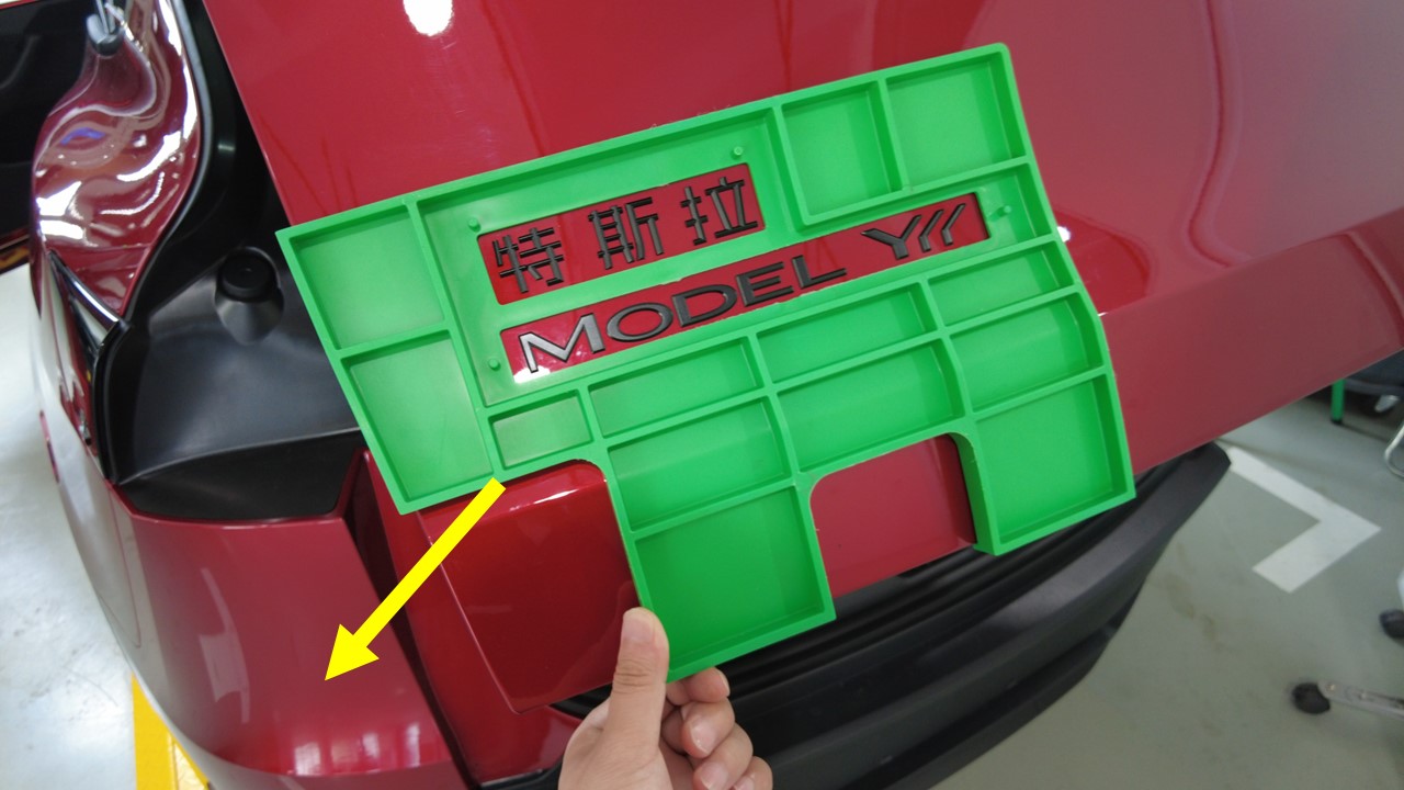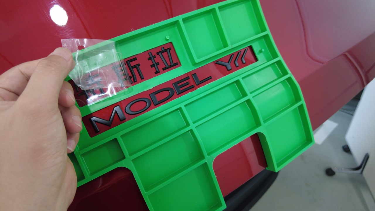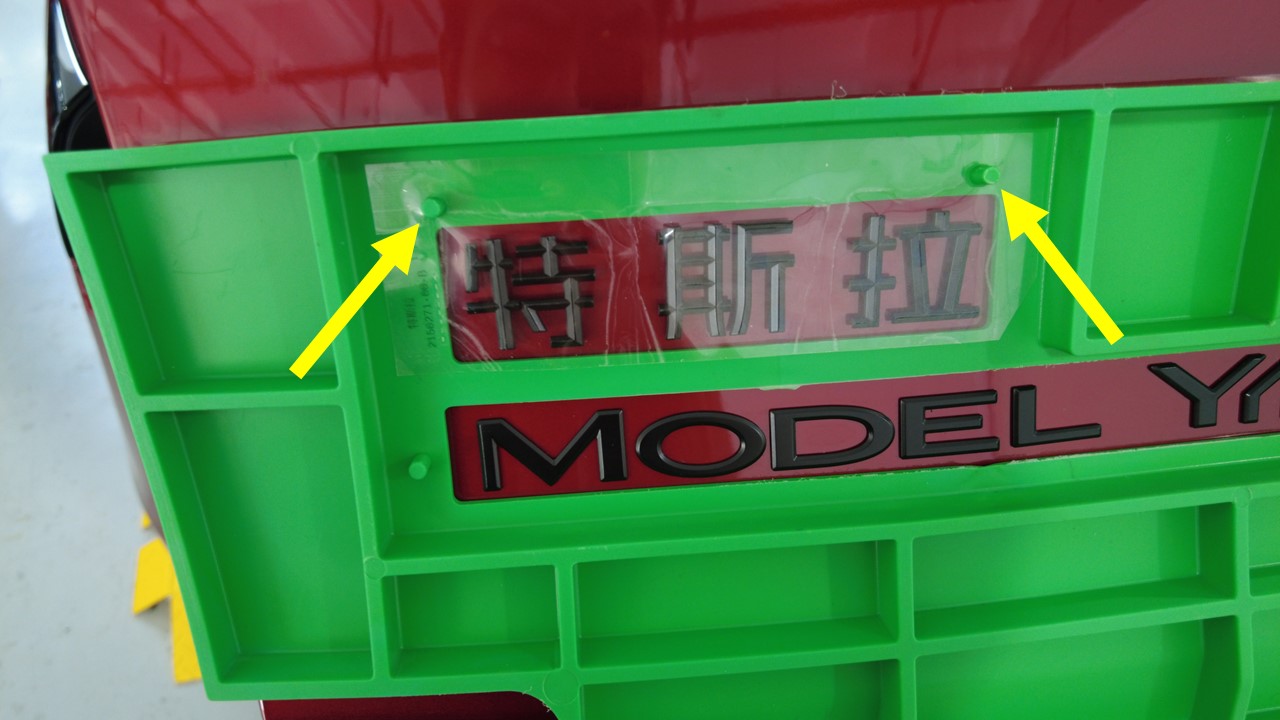 揭下中国地区用 Tesla 徽标的背胶,将保护膜上的孔与夹具 (2249790-00-A) 上的固定销对齐,然后将徽标压向掀背尾门。