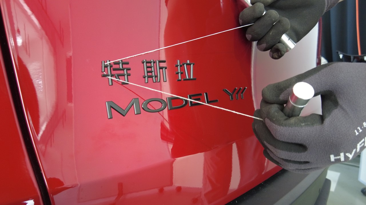 以拉锯的方式移动徽标拆卸工具,将中国 Tesla 徽标从掀背尾门盖板上分离。