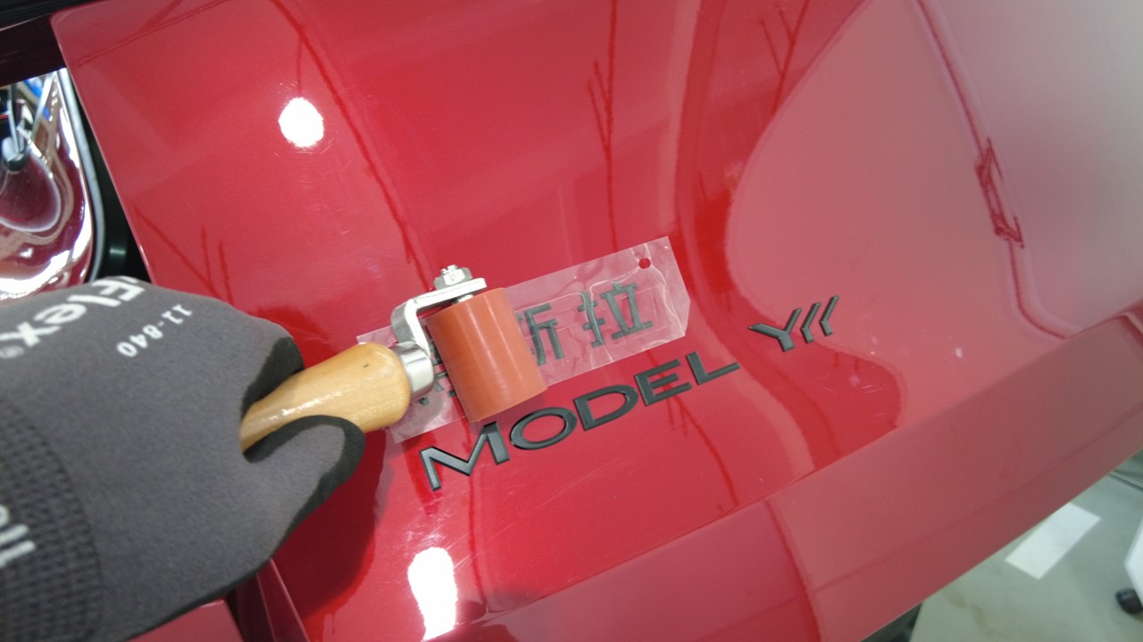 关闭掀背尾门,将保护膜放置在徽标上,使用滚压机 (1049517-00-A) 彻底压实徽标,然后揭下保护膜。