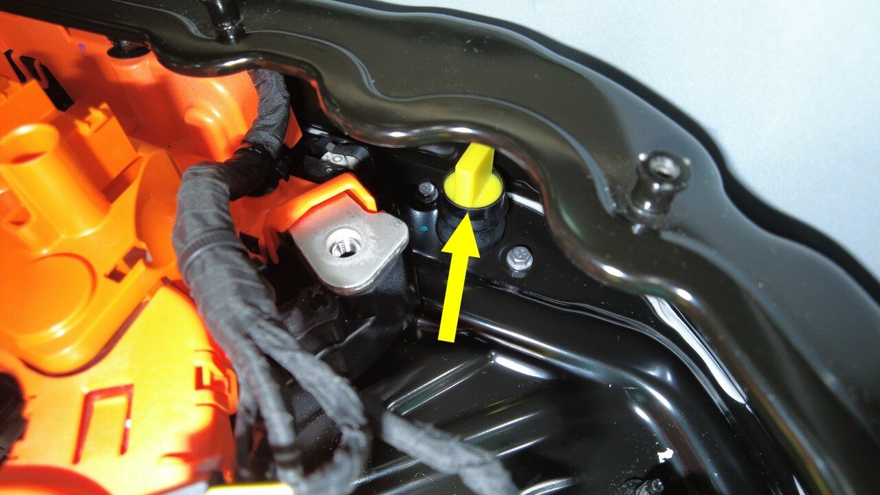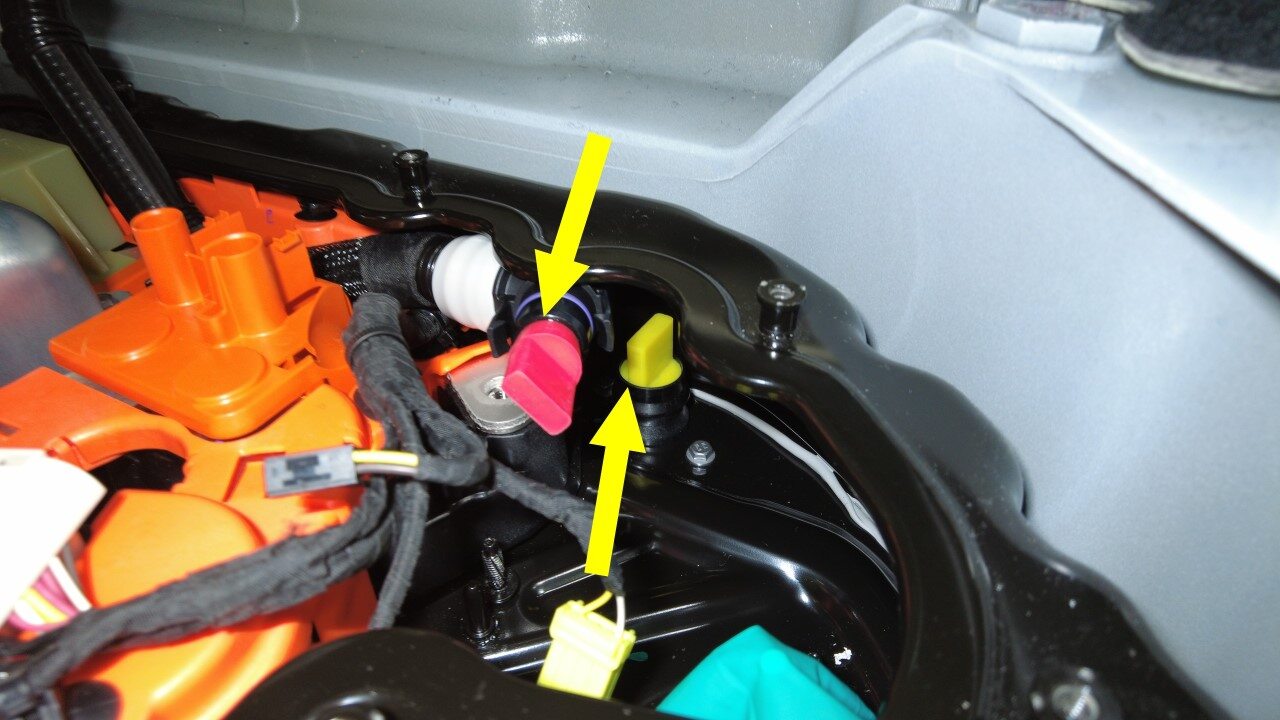 松开弹簧夹,将左侧冷却液软管从高压电池后侧断开,然后立即使用 2 个塞子堵住软管和直通件。