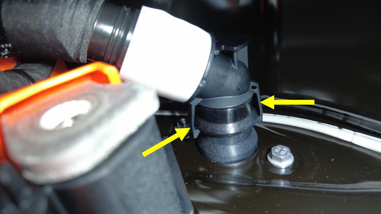- 将软管与高压电池仓对齐并紧固卡子(2 个);注意请勿损坏 O 型环。