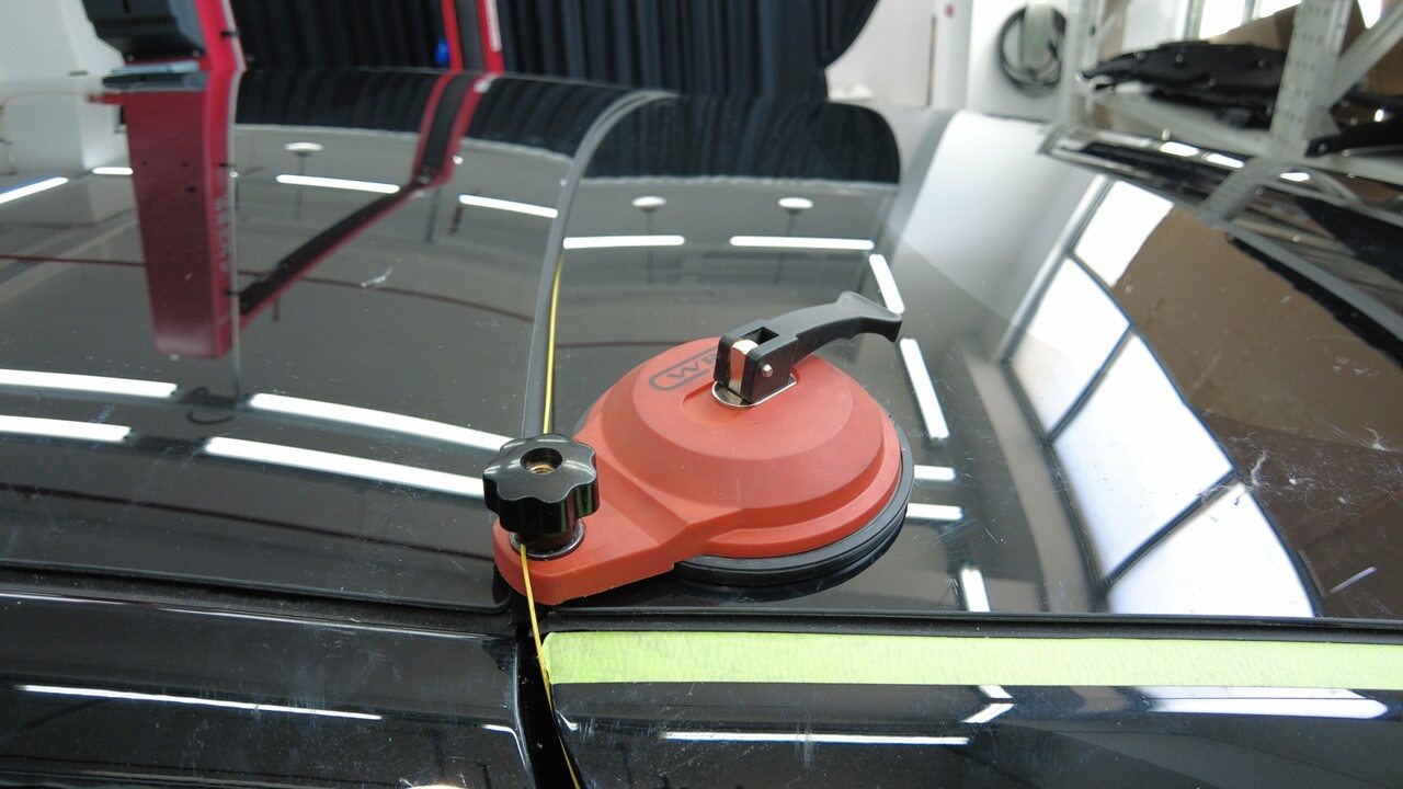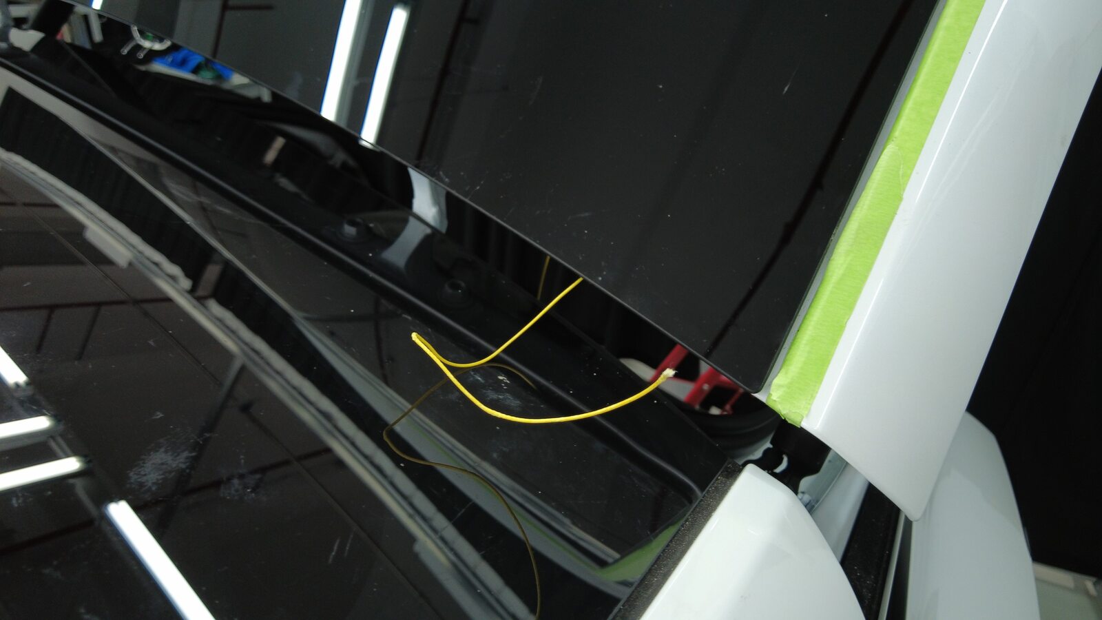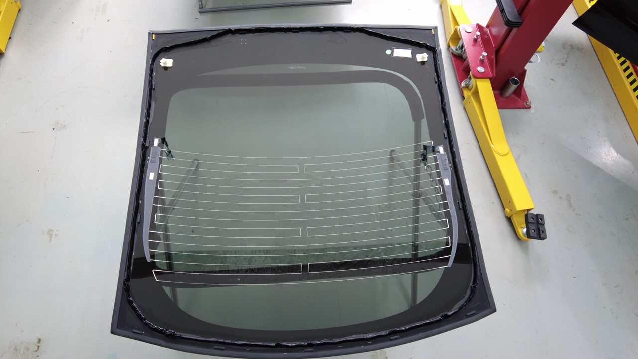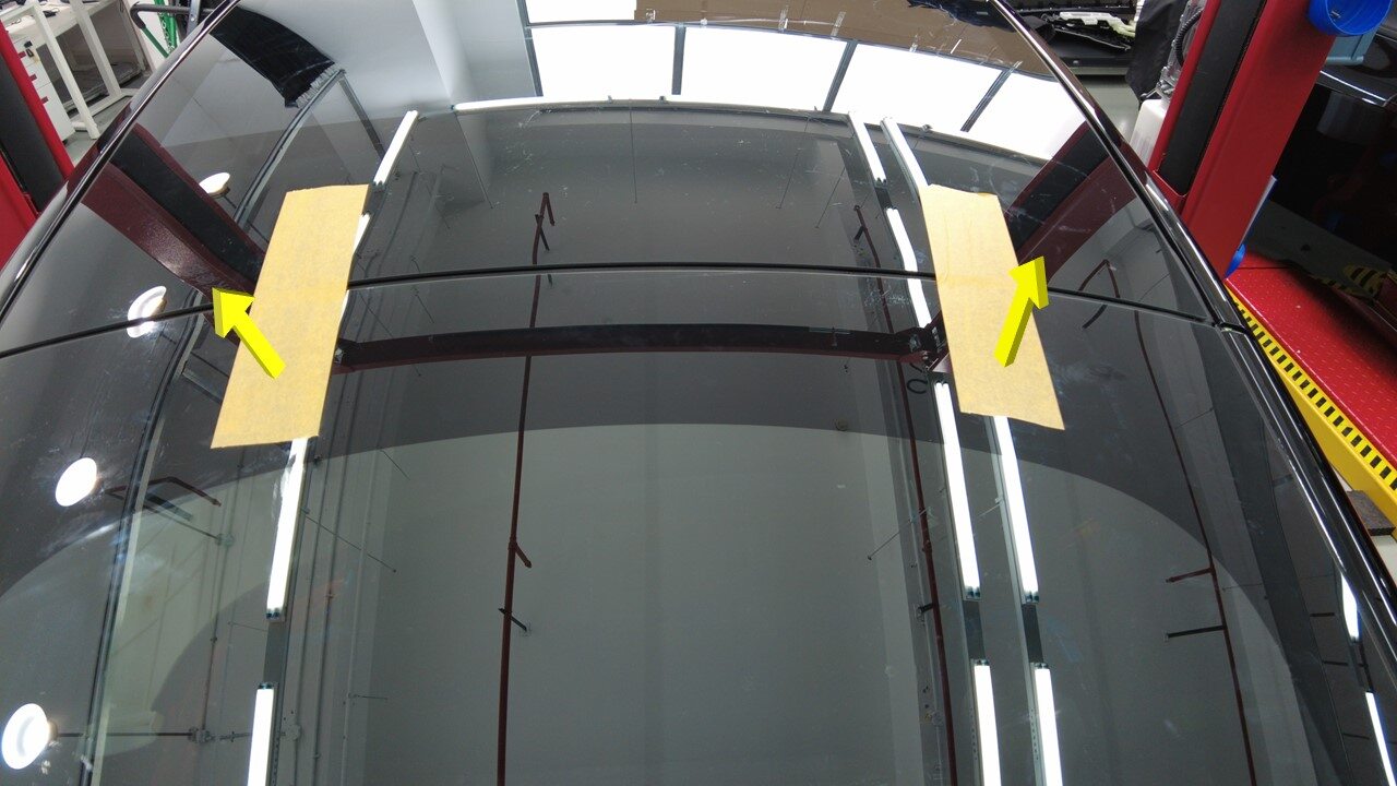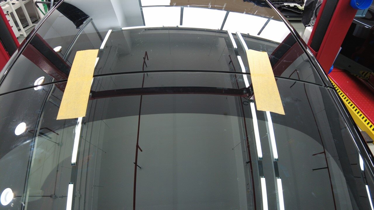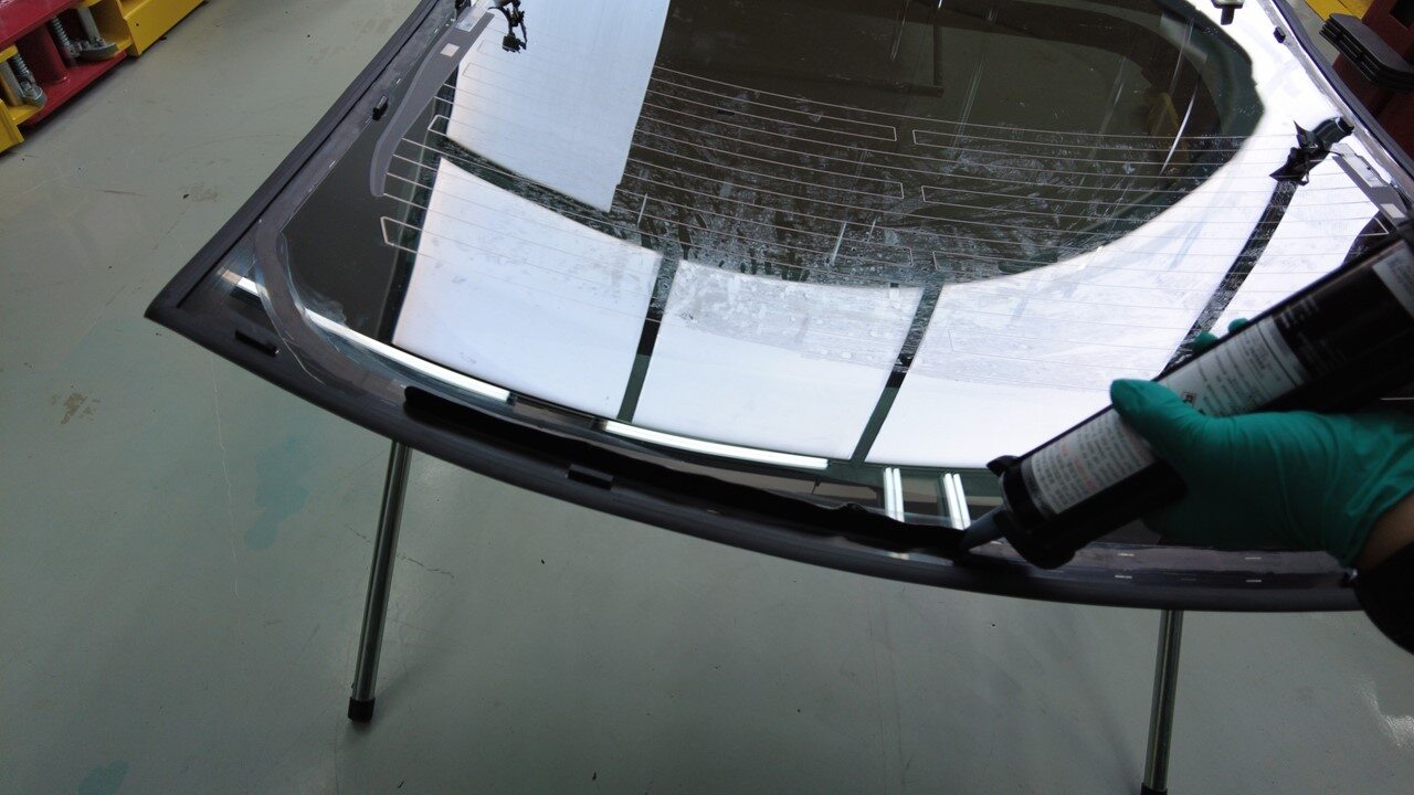 聚氨酯凝固期间,使用遮蔽胶带将背光灯玻璃固定到车身。