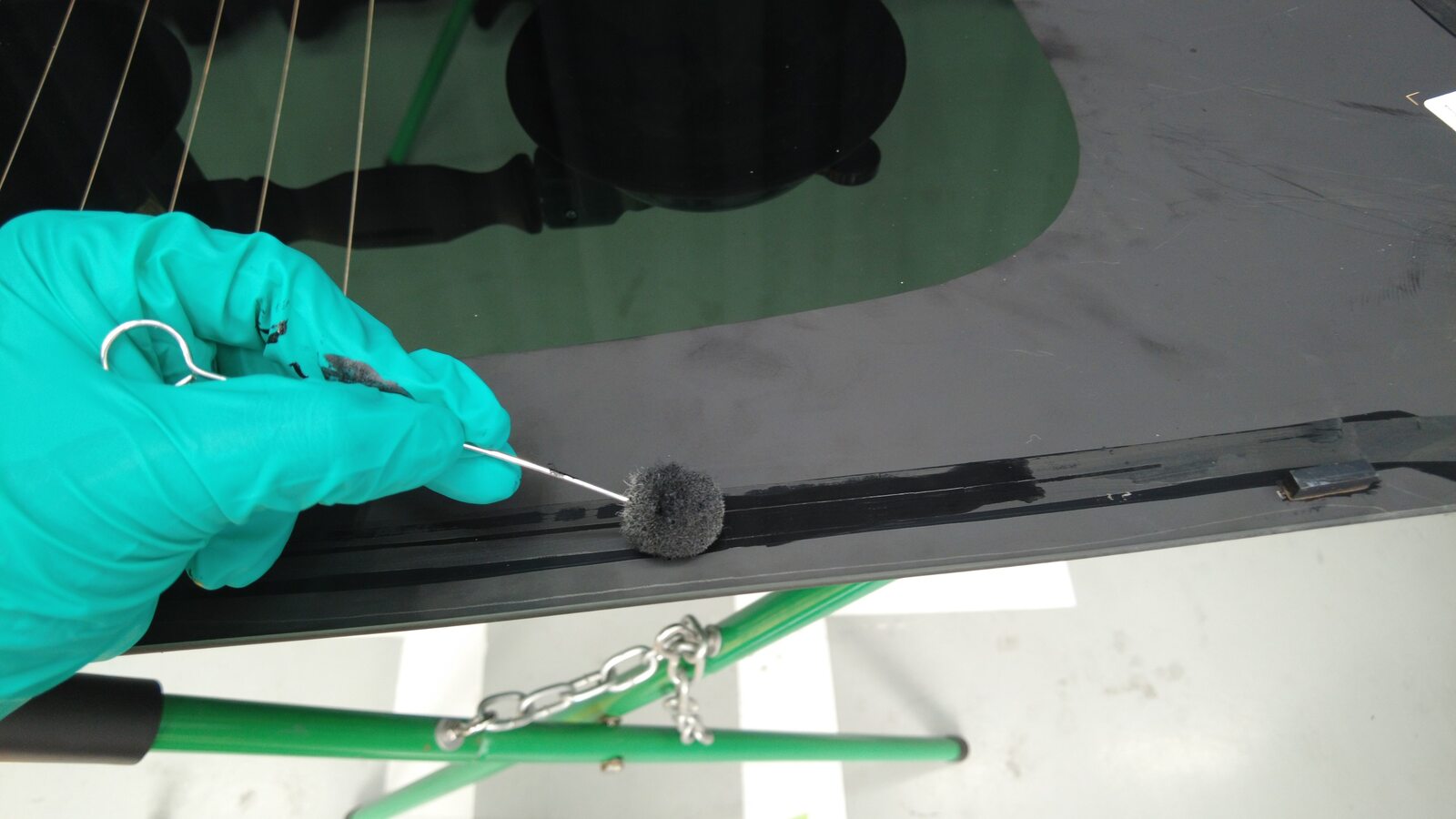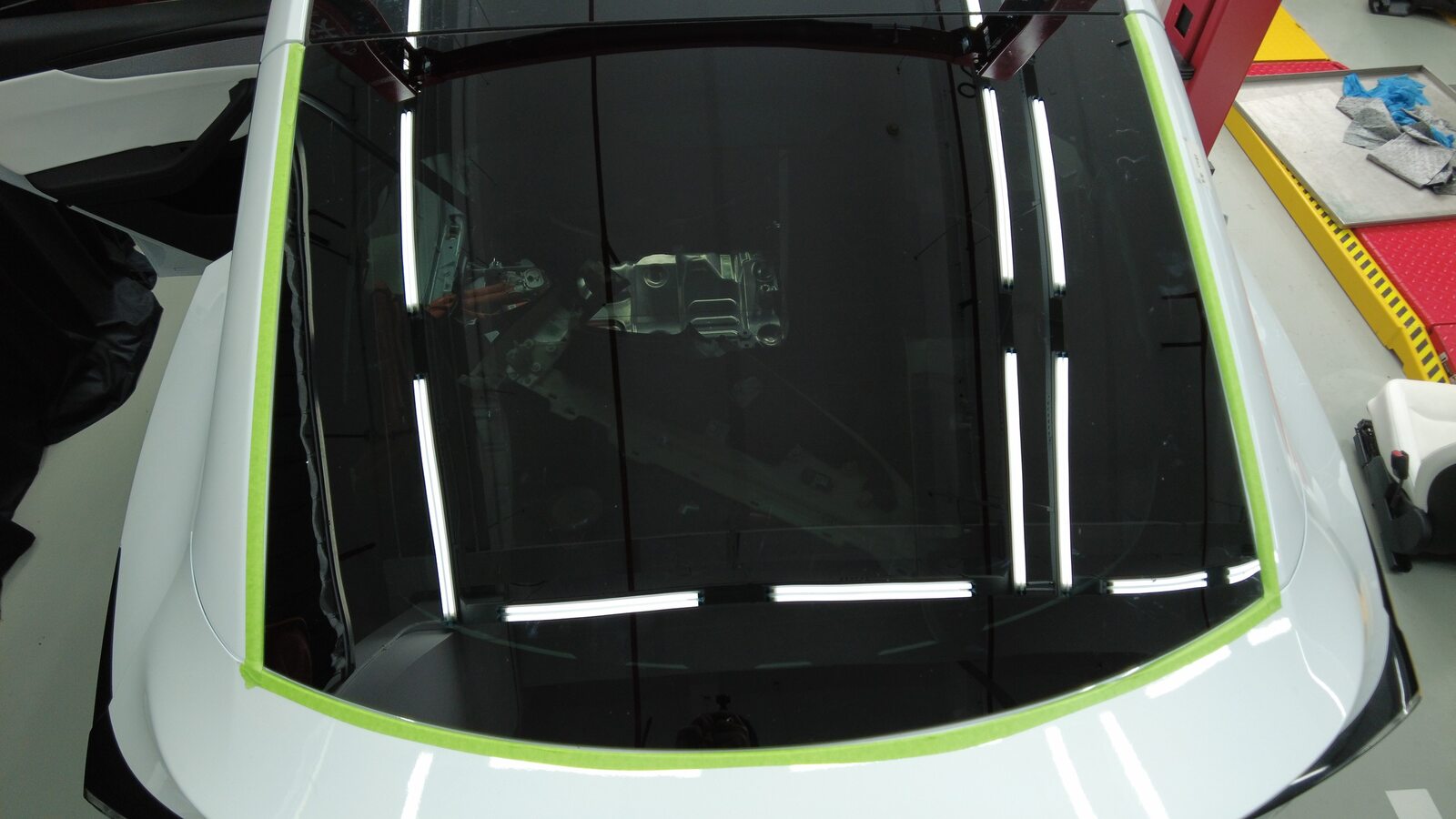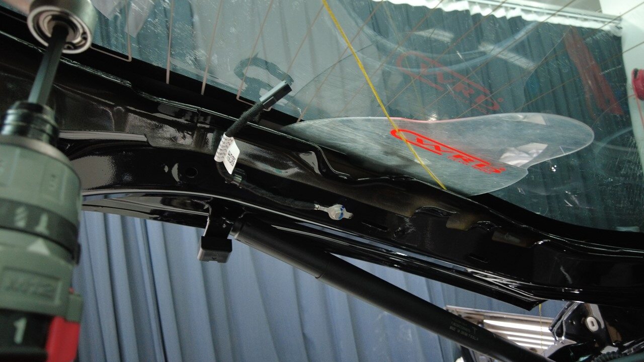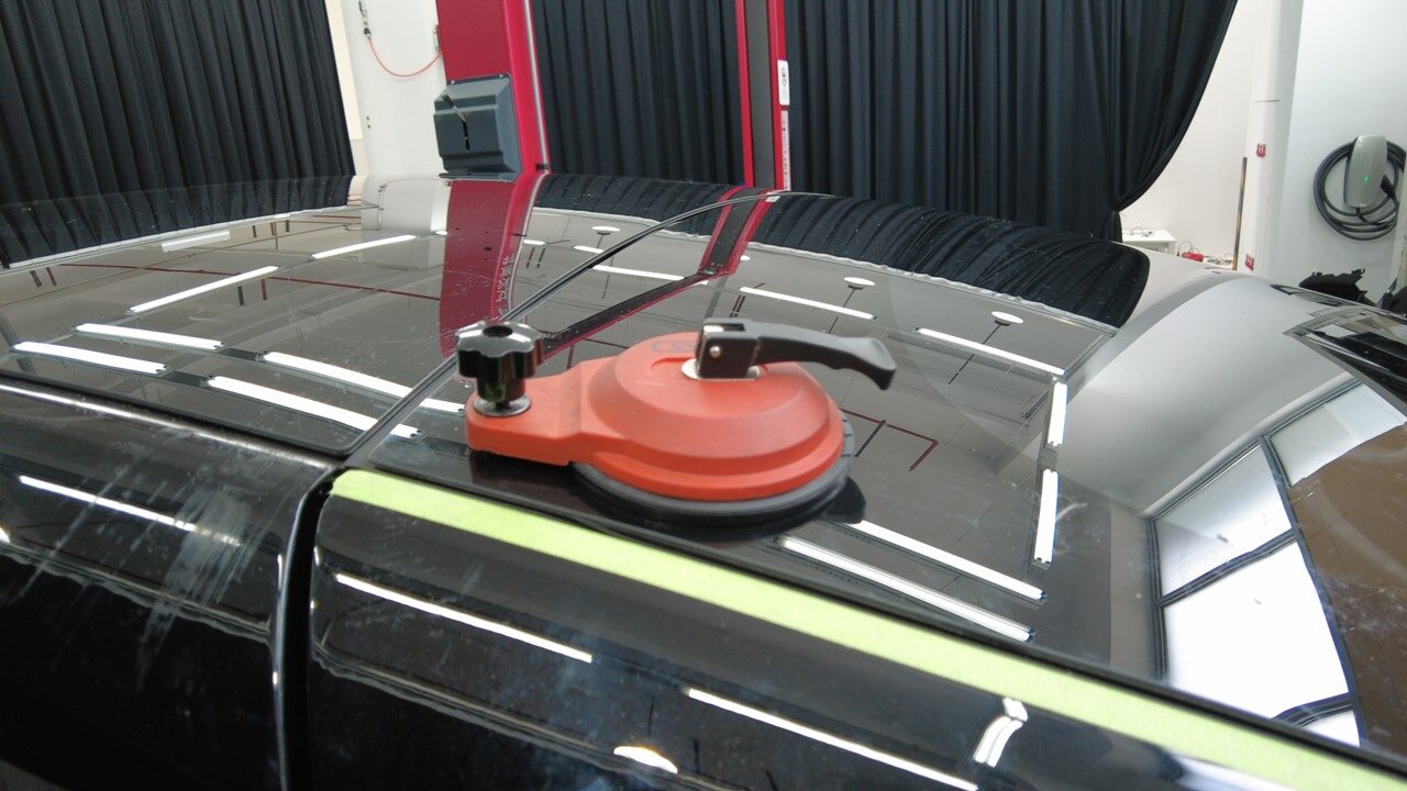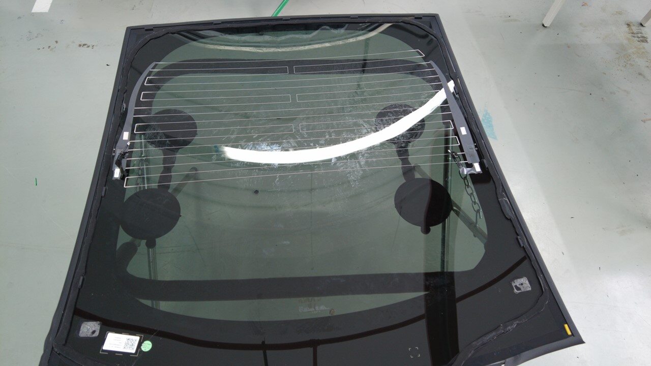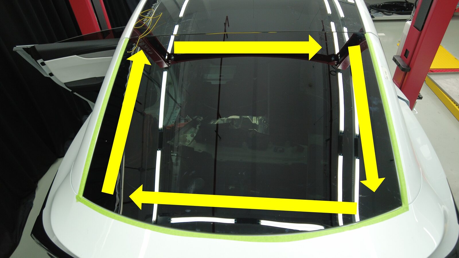 聚氨酯凝固期间,使用遮蔽胶带将背光灯玻璃固定到车身。