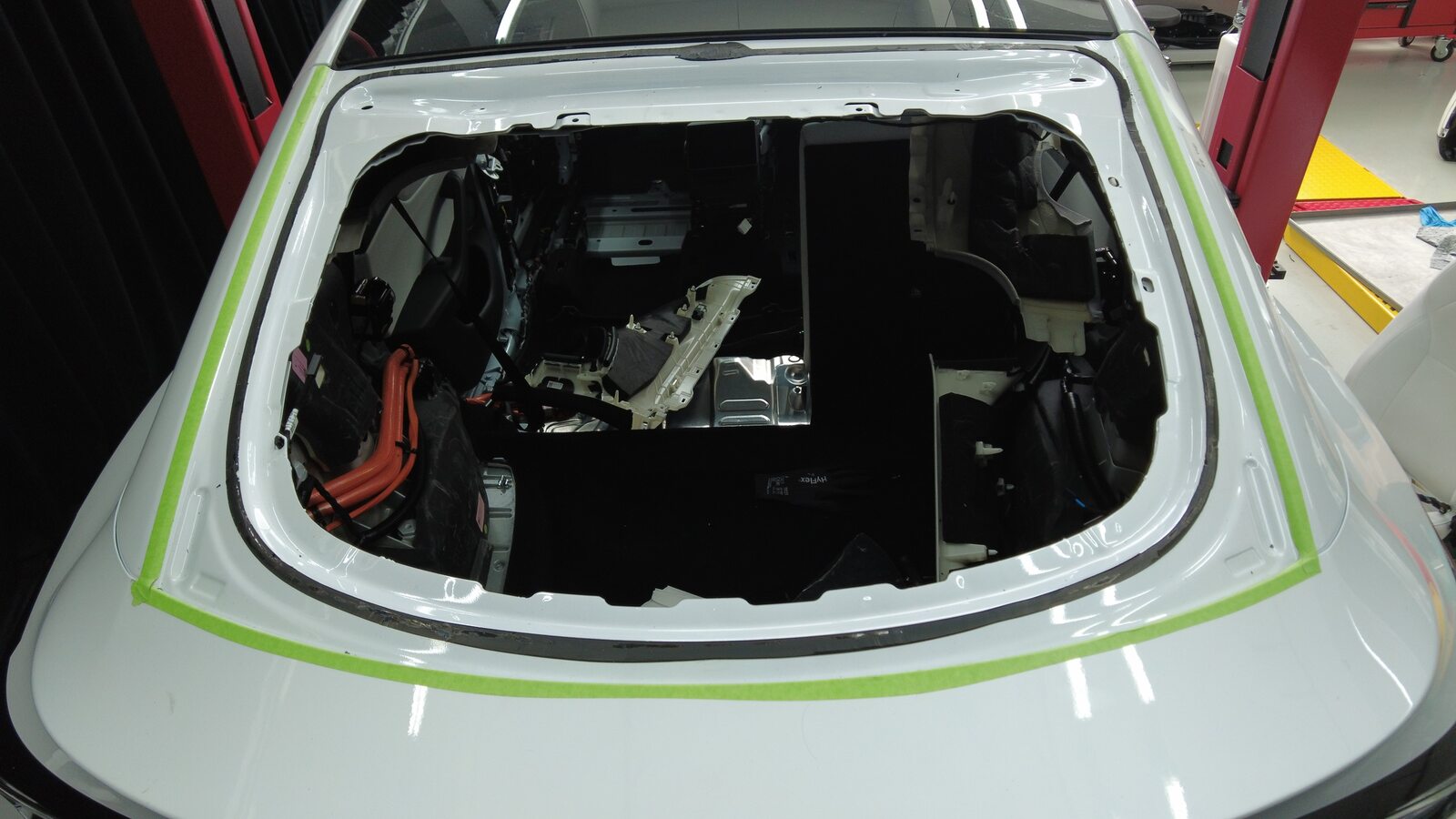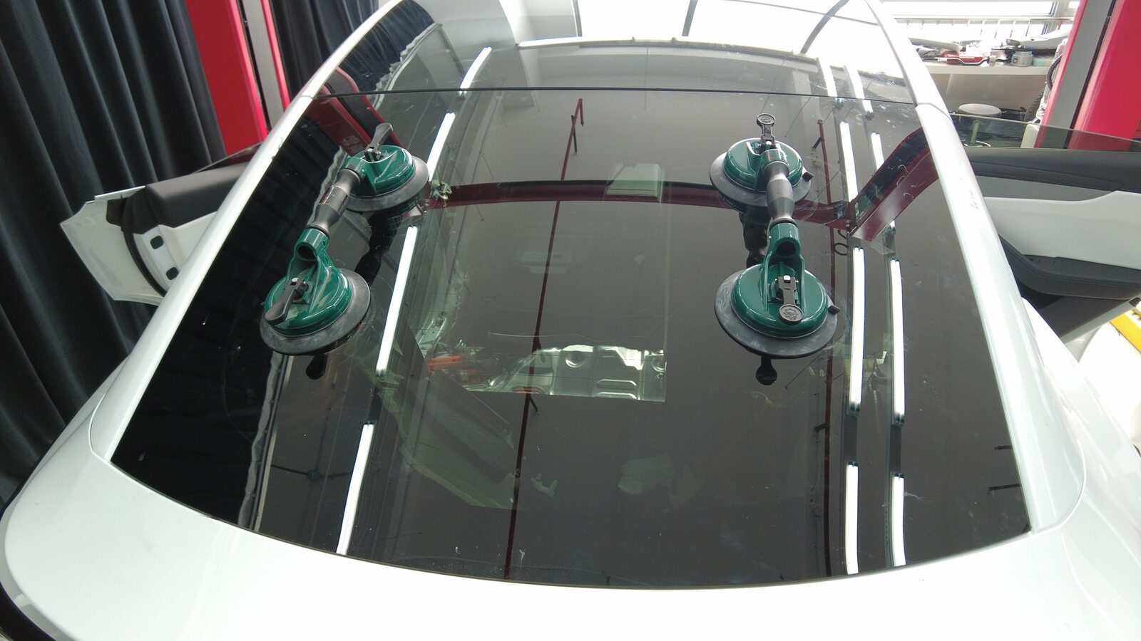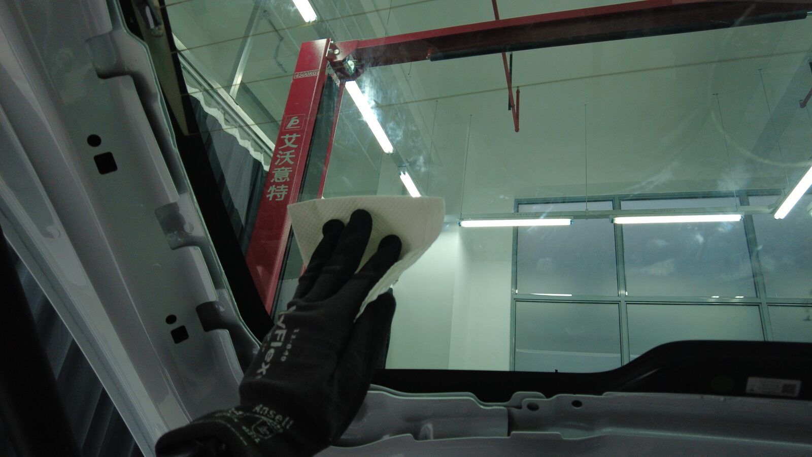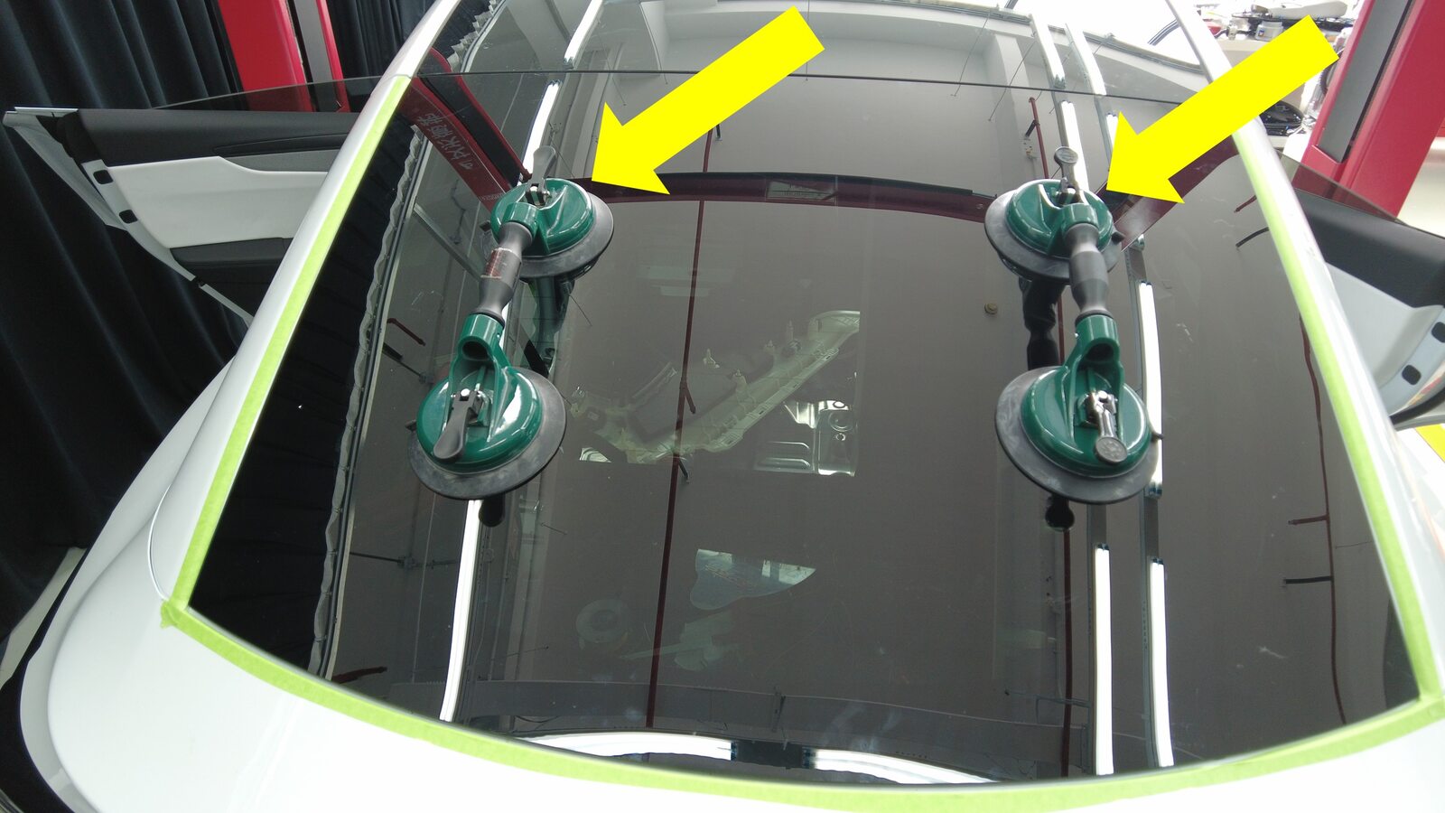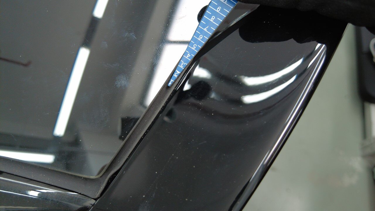 聚氨酯凝固期间,使用遮蔽胶带将背光灯玻璃固定到车身。
