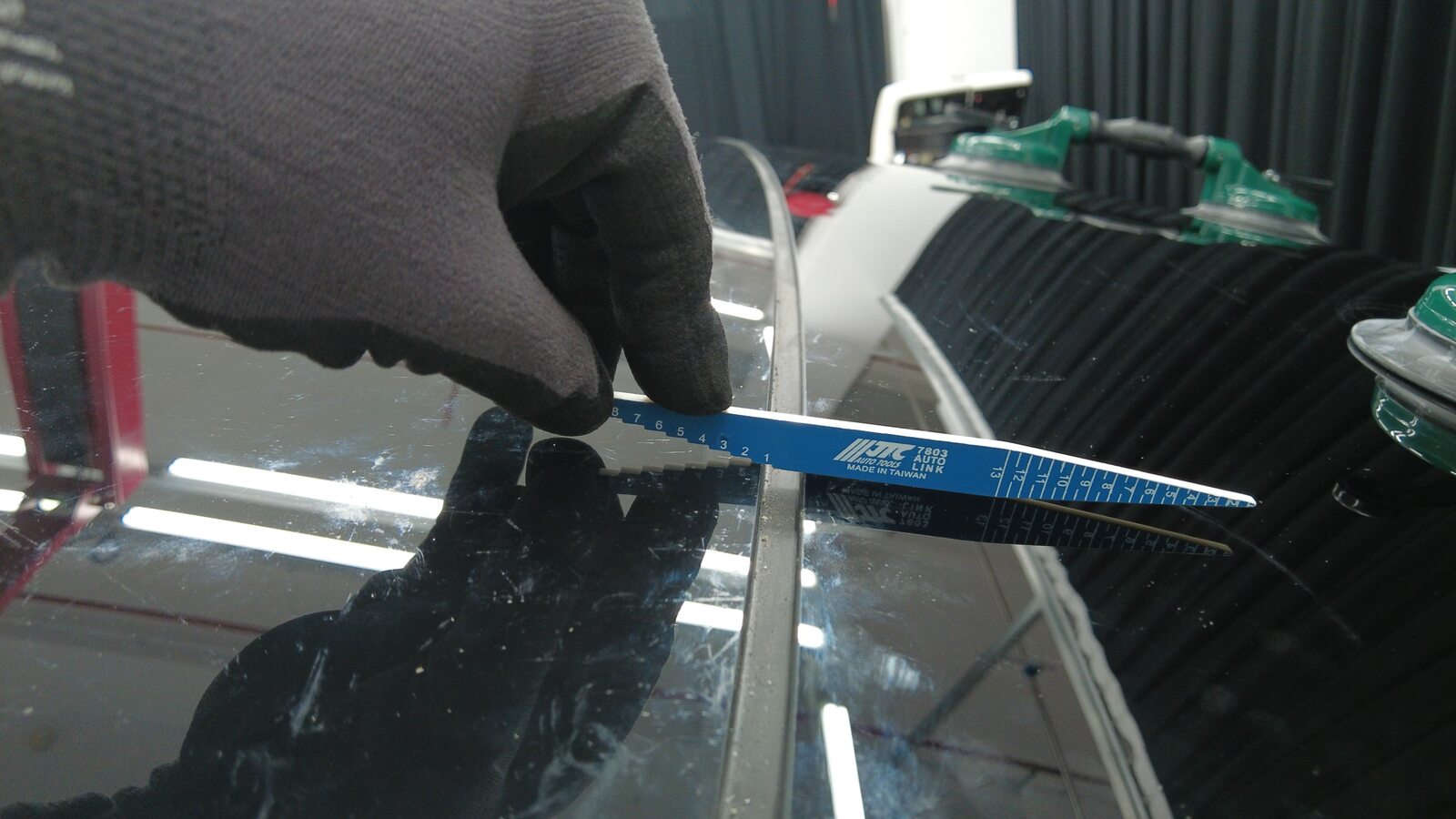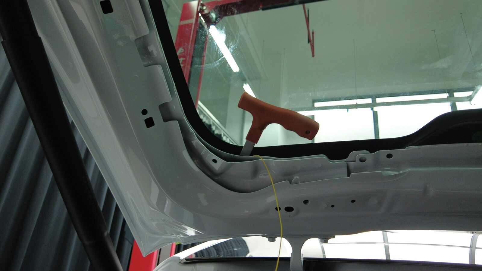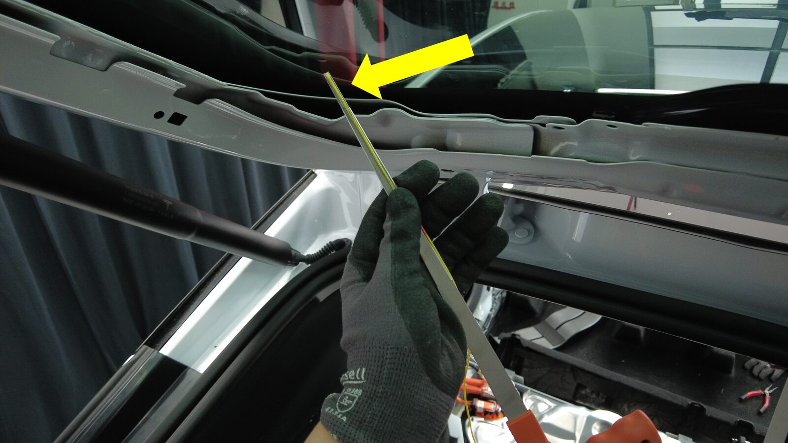将线固定在穿线器上,然后将穿线器从车辆内部穿过背光灯玻璃左侧固定销附近的胶黏剂涂层。