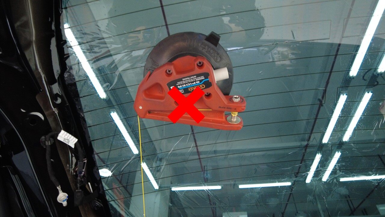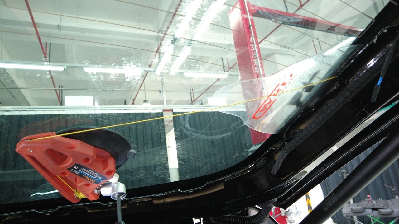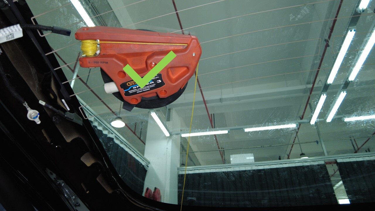 从车辆外部将尼龙绳顺时针缠绕在背光灯玻璃聚氨酯上。