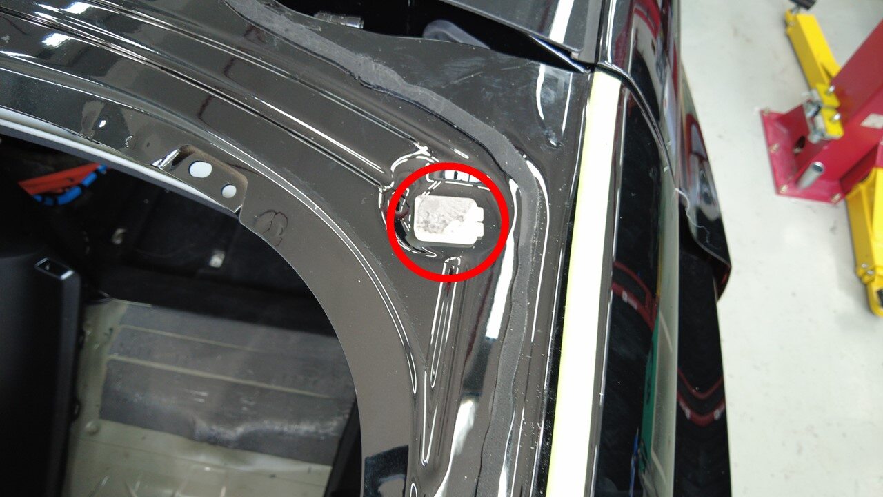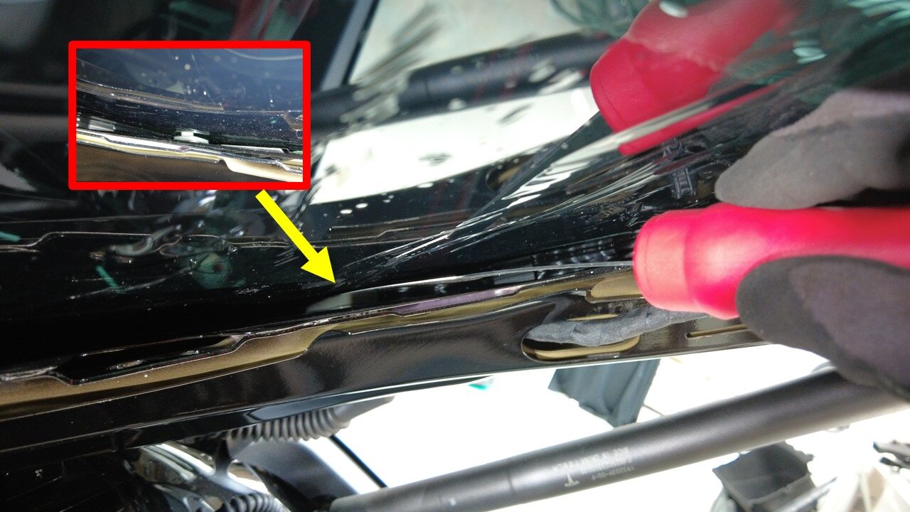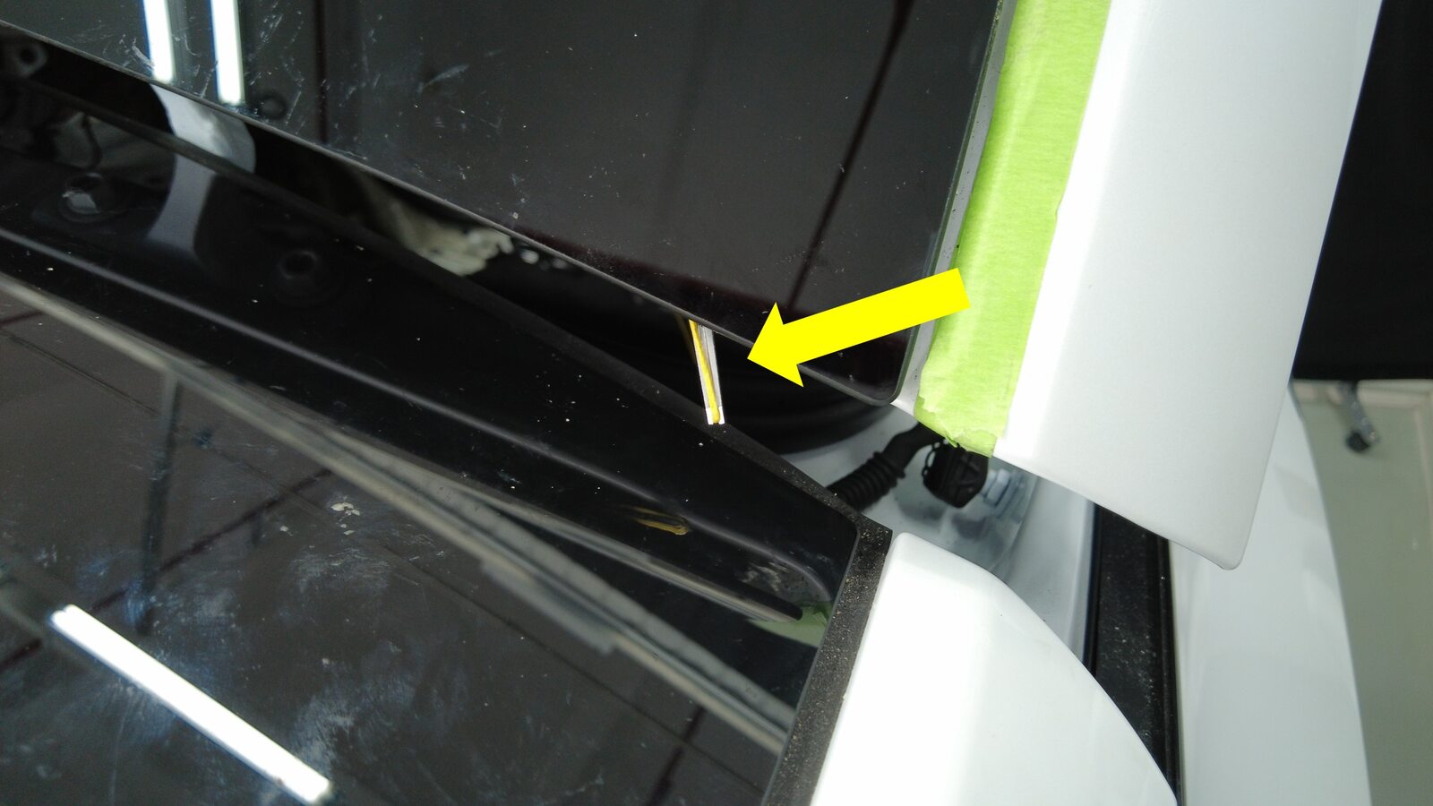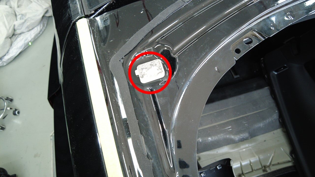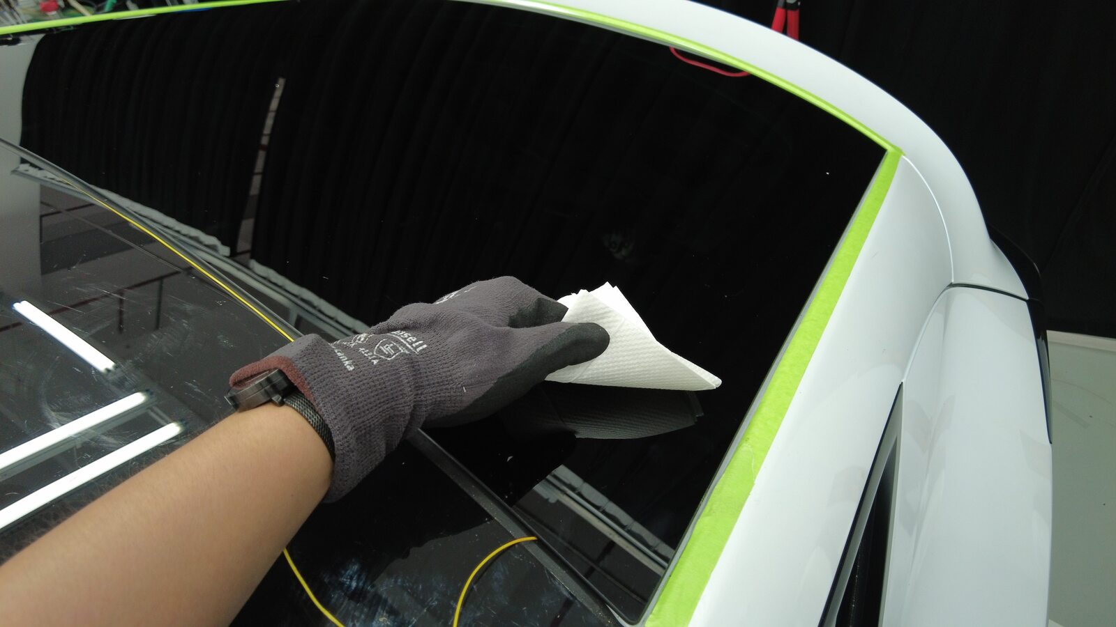 在背光灯玻璃周围车身上粘贴遮蔽胶带,以保护车漆免受损坏。