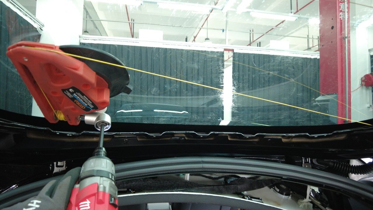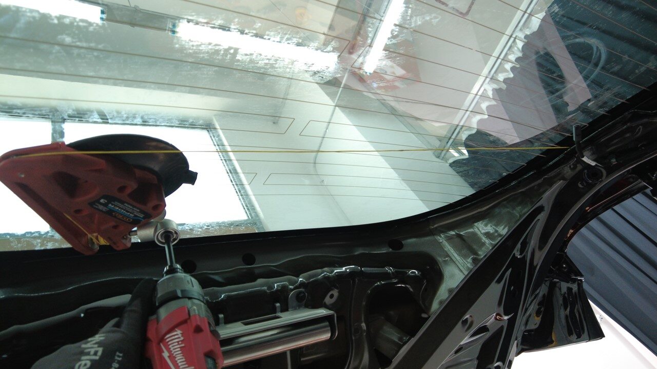 旋转带钻头切割工具的主轴,切割将背光灯玻璃固定到车身的聚氨酯。