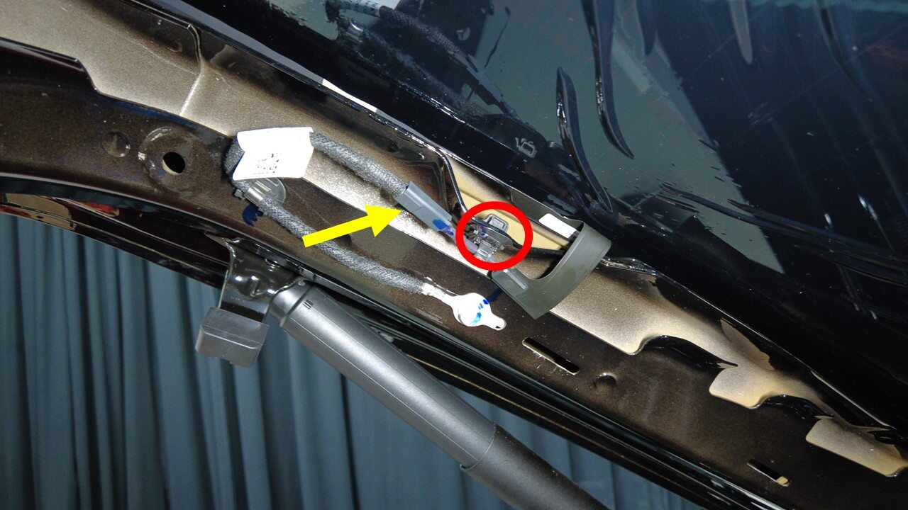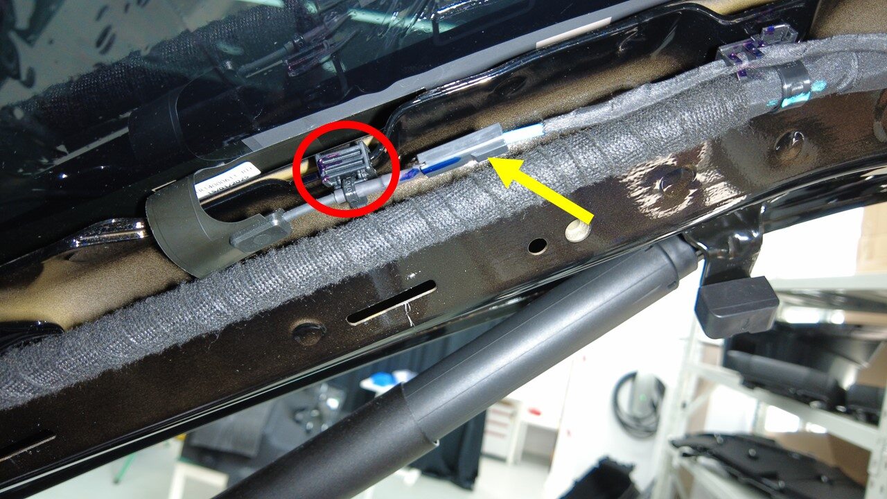 连接背光灯玻璃加热器正极连接器,然后安装将连接器固定到车身的卡子。