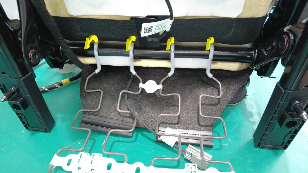 在协助下,将驾驶位座垫悬架下部安装到座椅框架上。