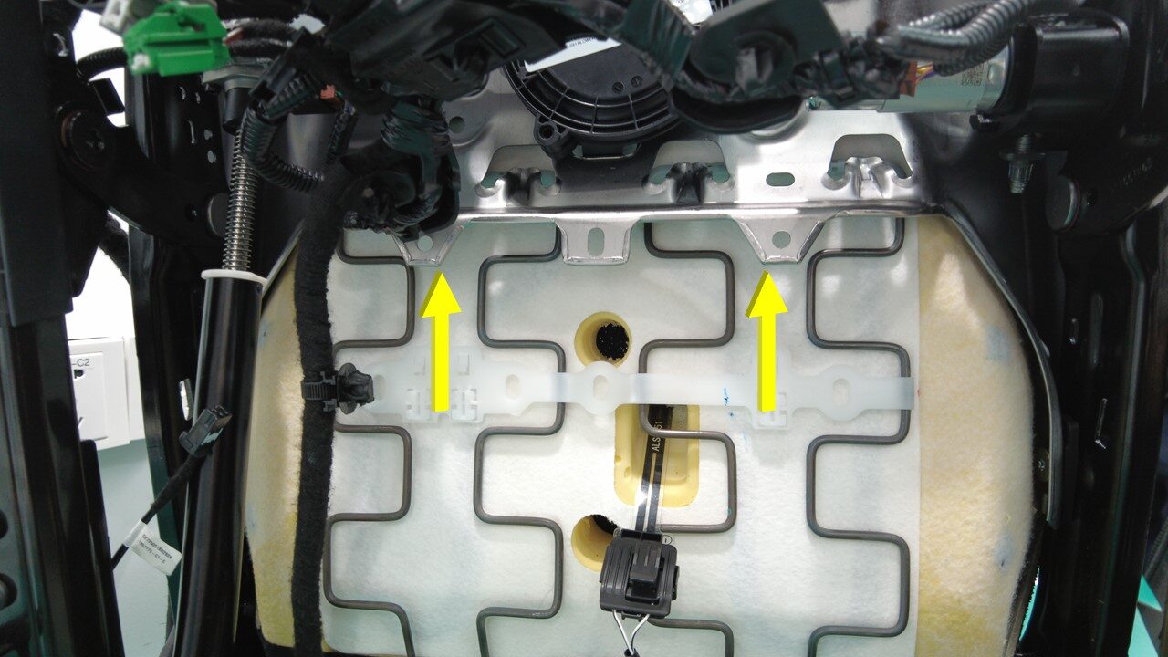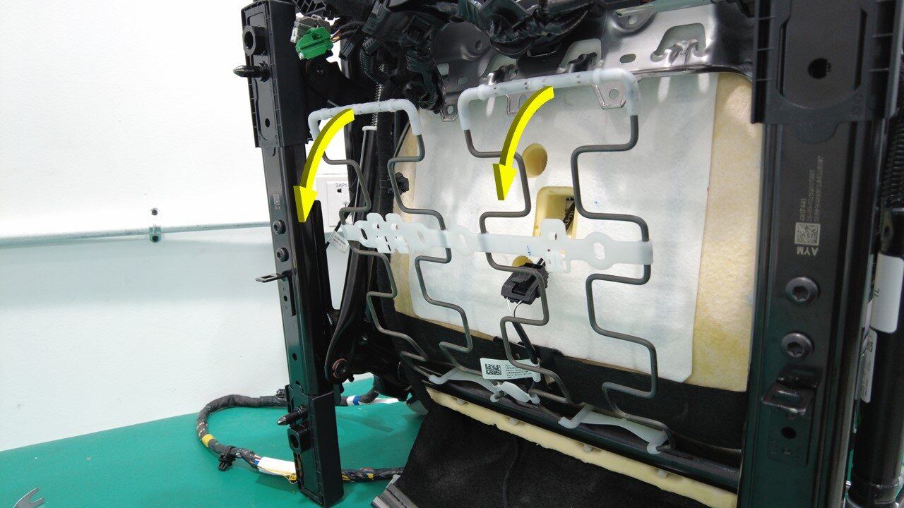 在协助下,将驾驶位座垫悬架上部安装到座椅框架上。