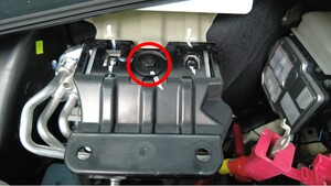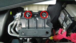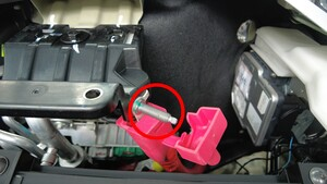 拆下将正极跳线柱固定到前围篦板支架的螺柱。