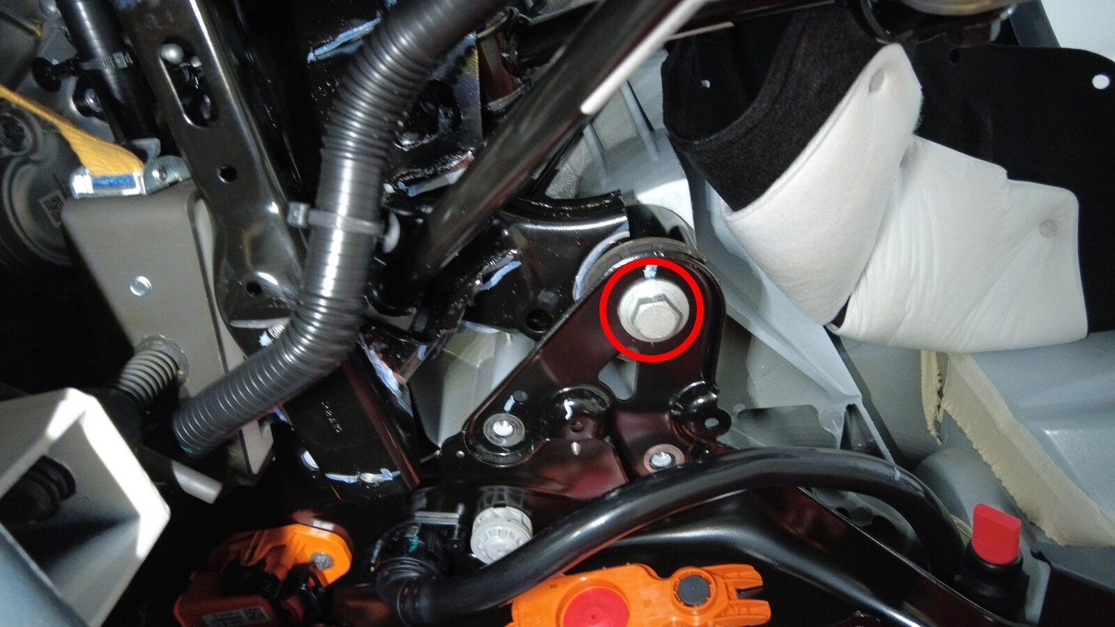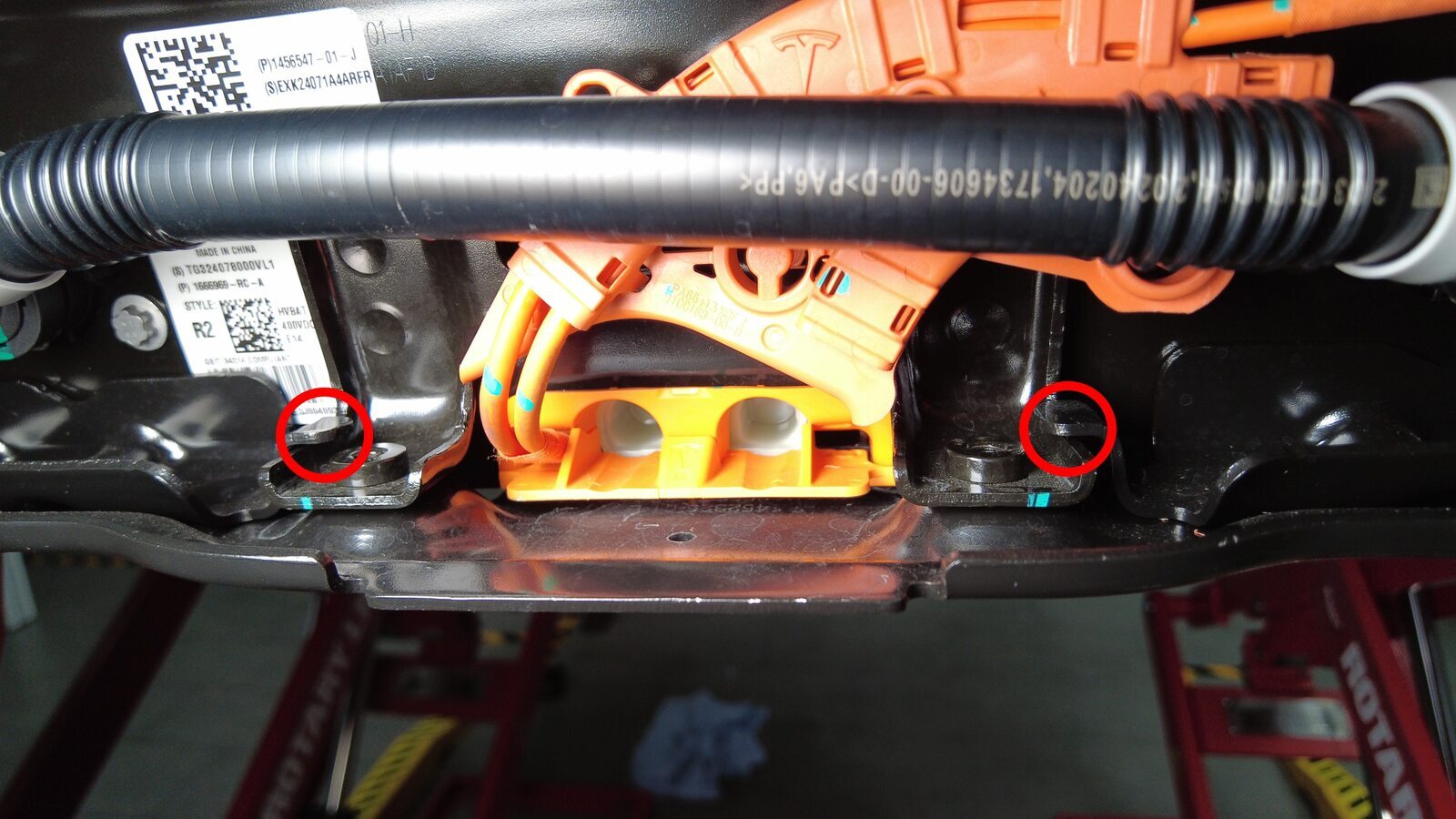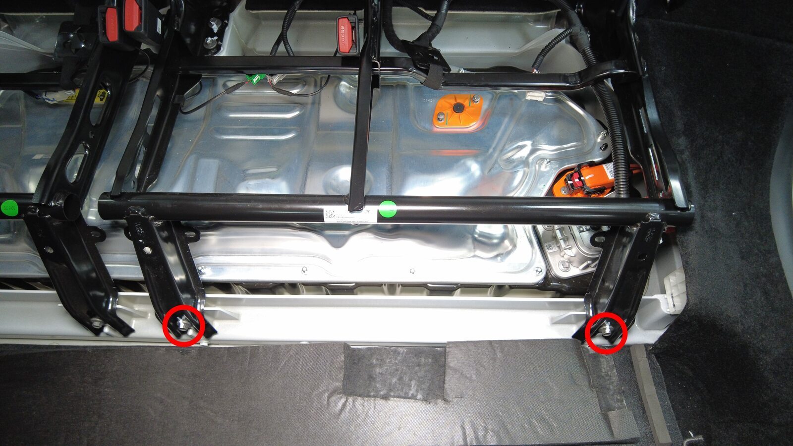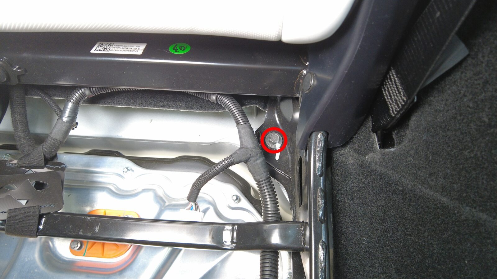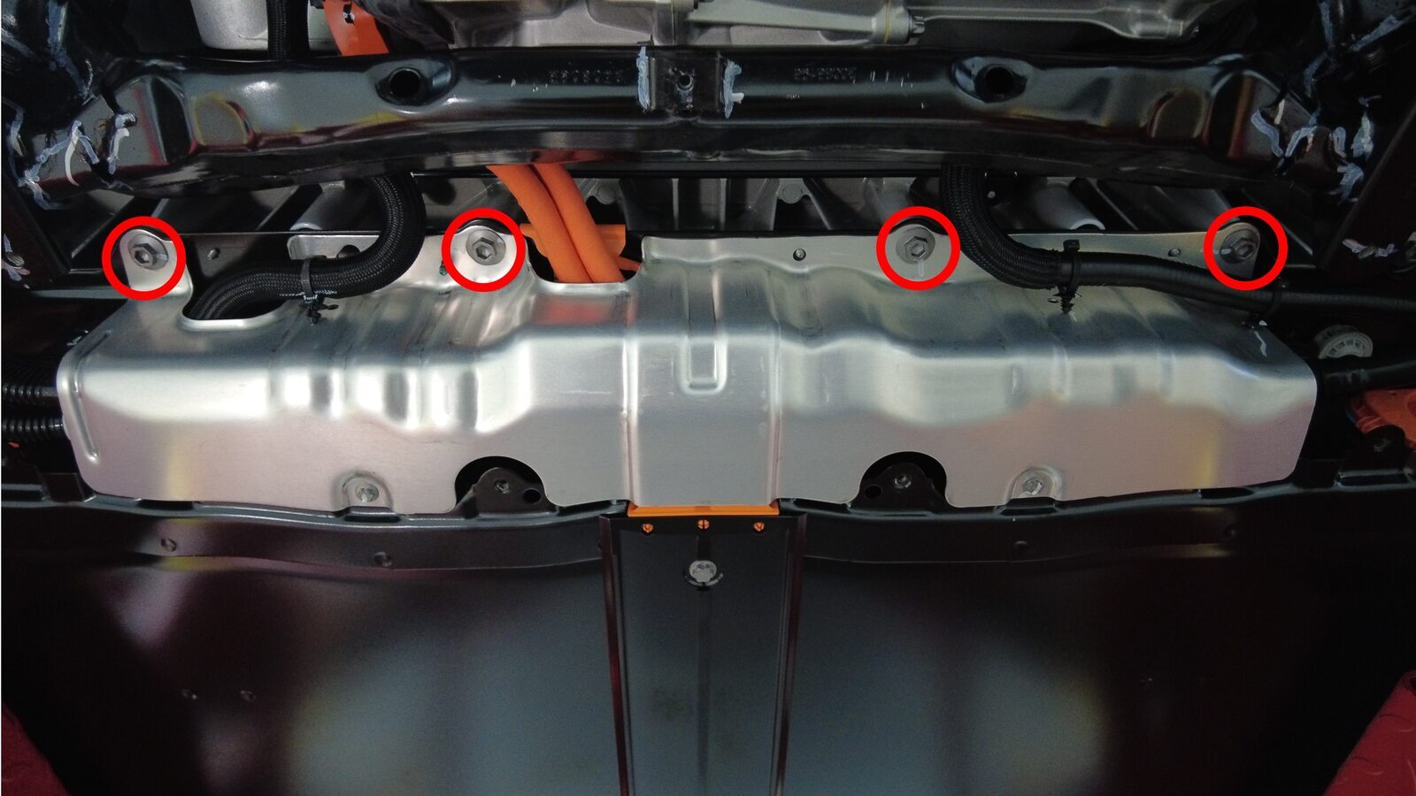 分离右前座椅下方的地毯穿孔,以便接触高压电池内部右侧中间螺栓
