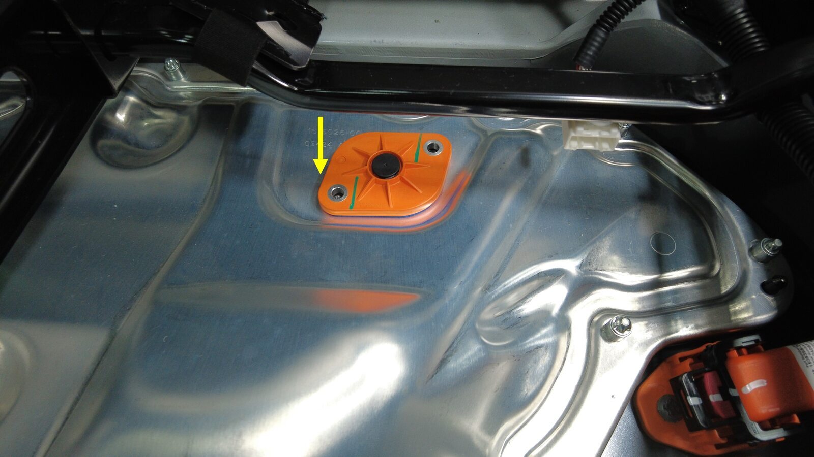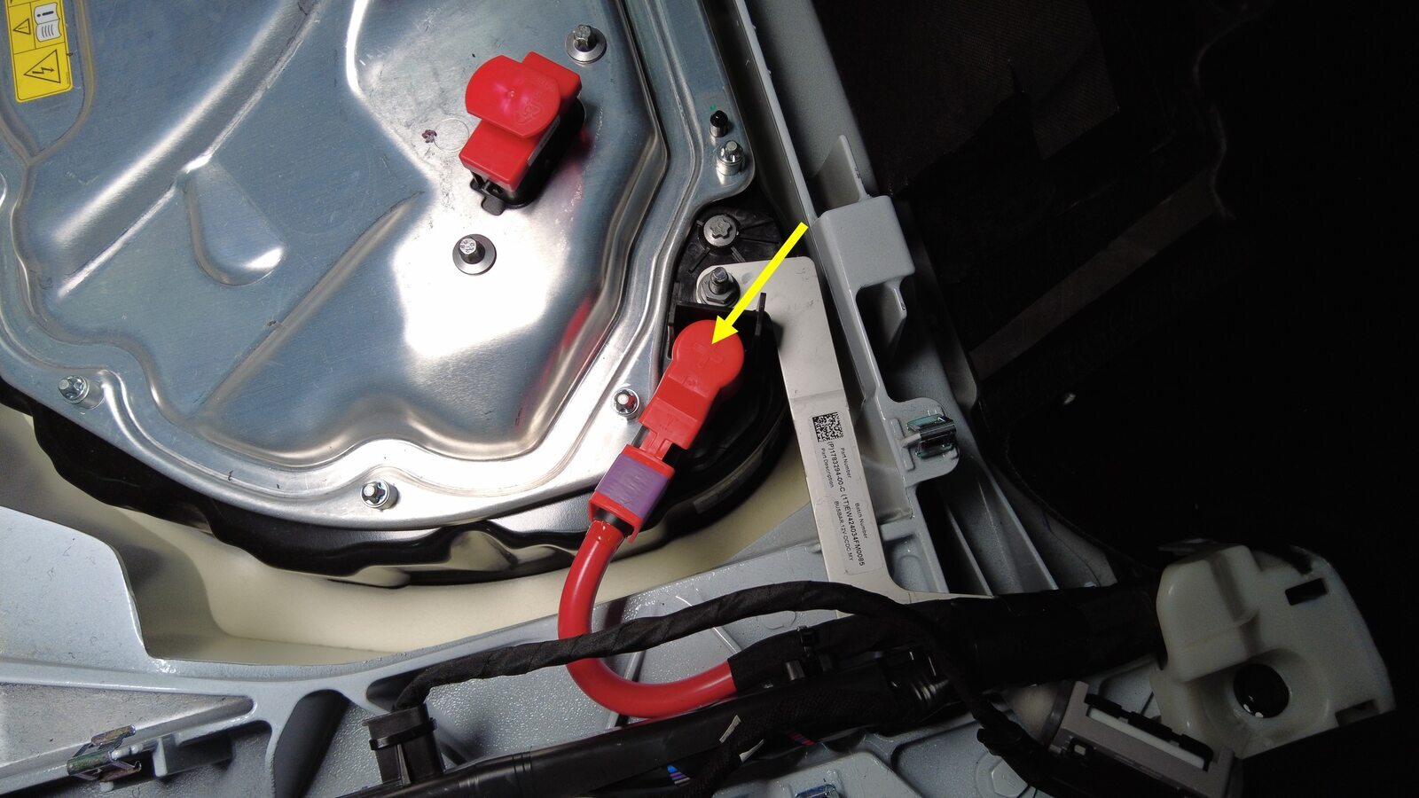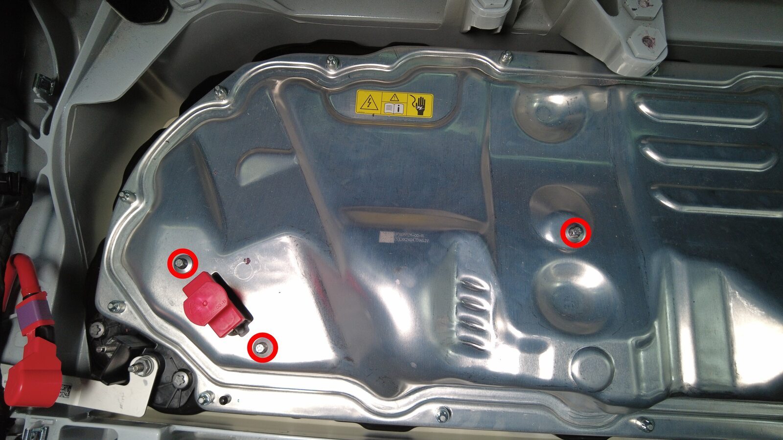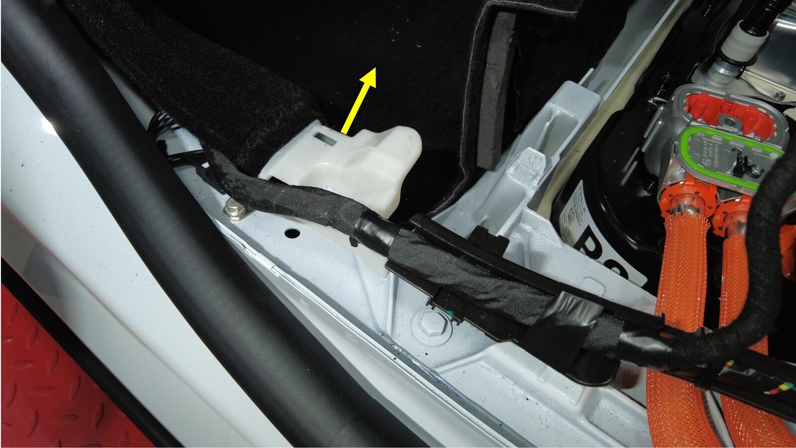 分离右前座椅下方的地毯穿孔,以便接触高压电池内部右侧中间螺栓