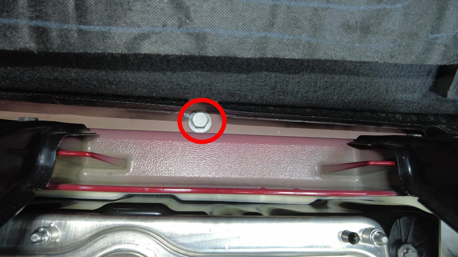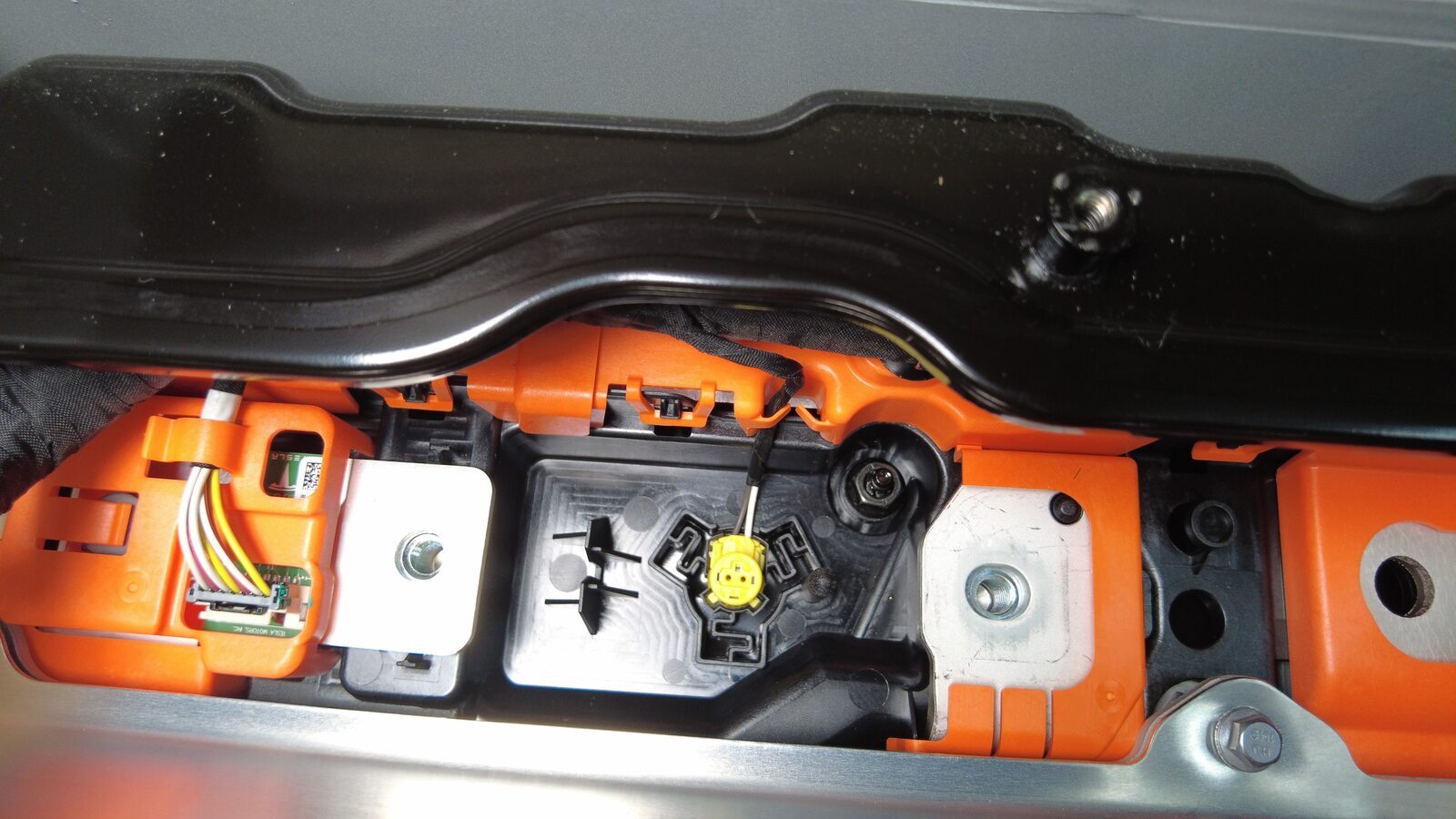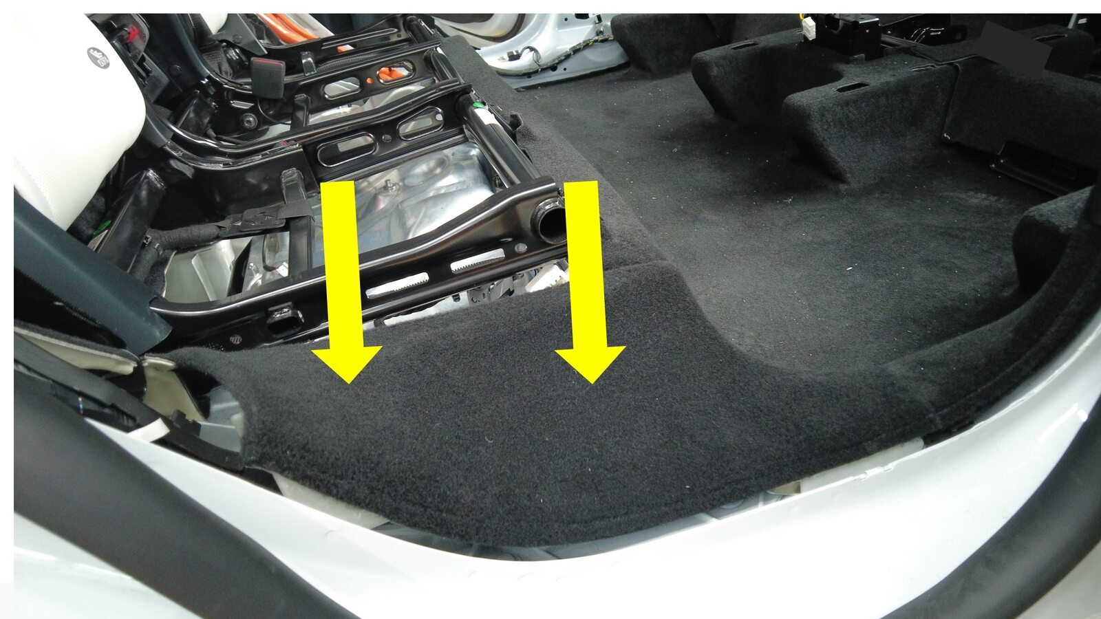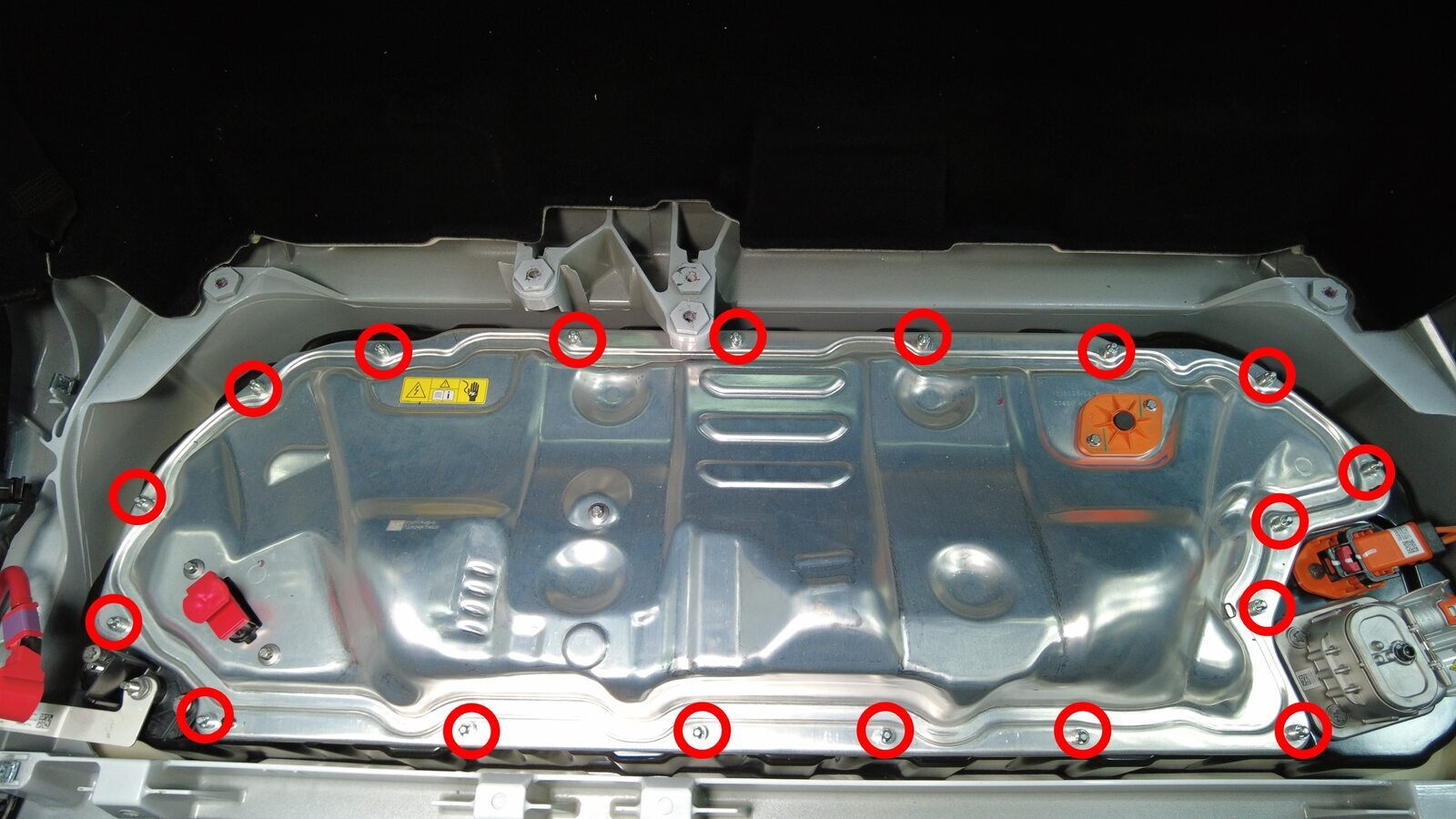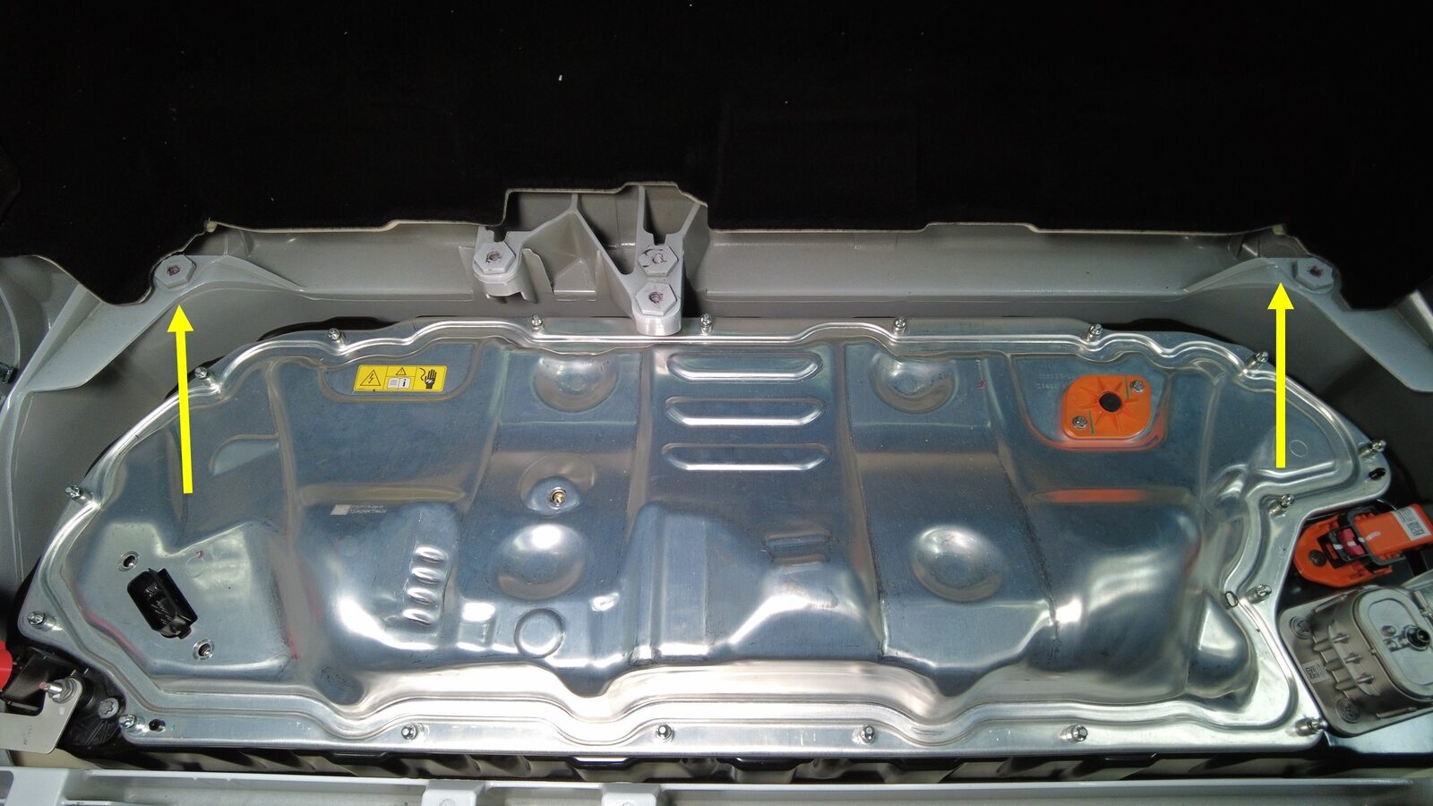 分离右前座椅下方的地毯穿孔,以便接触高压电池内部右侧中间螺栓