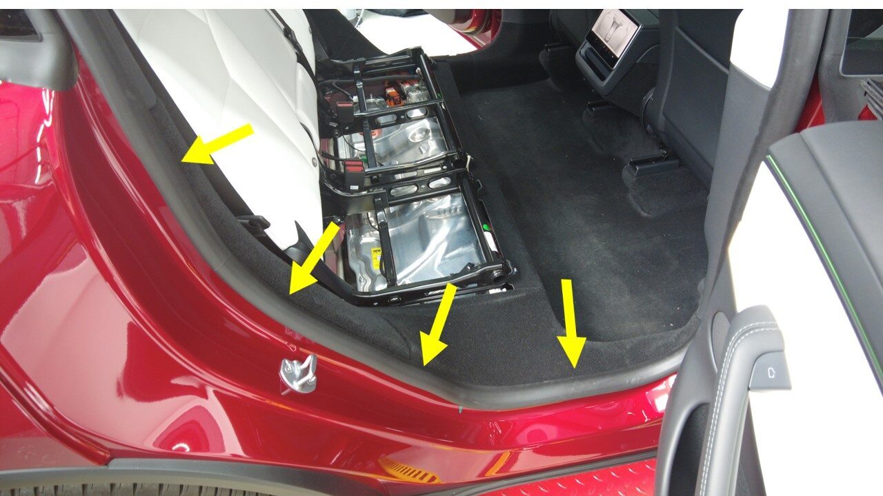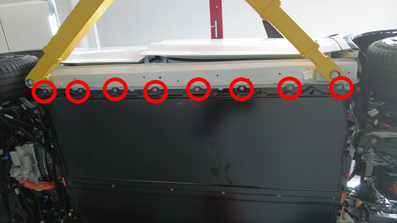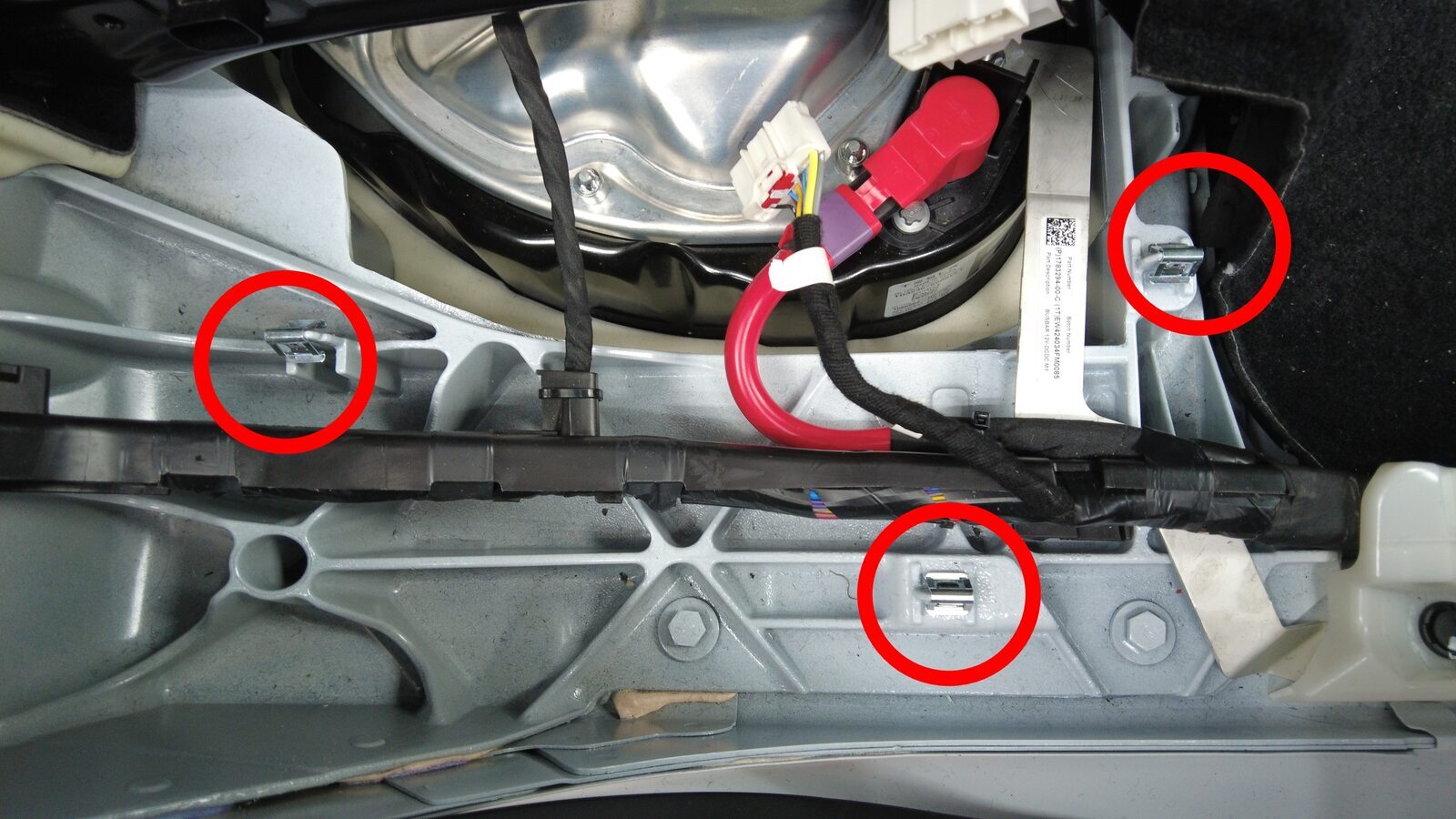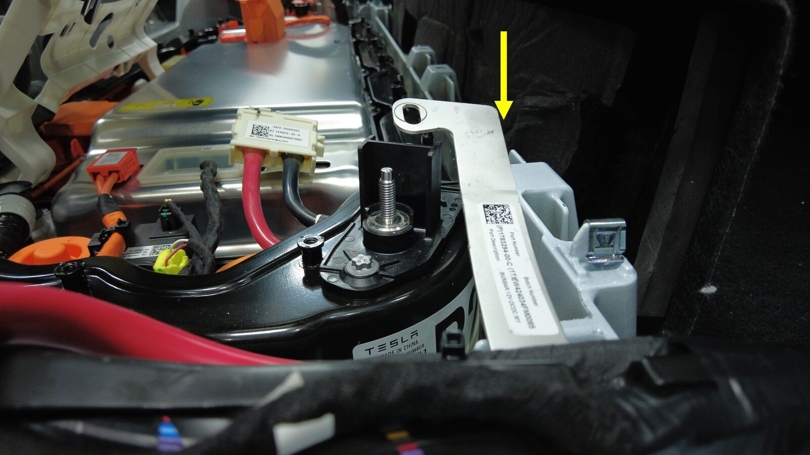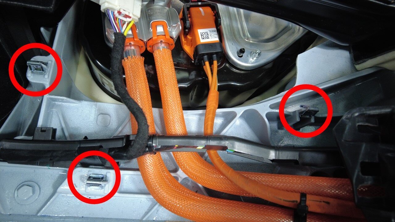 分离右前座椅下方的地毯穿孔,以便接触高压电池内部右侧中间螺栓