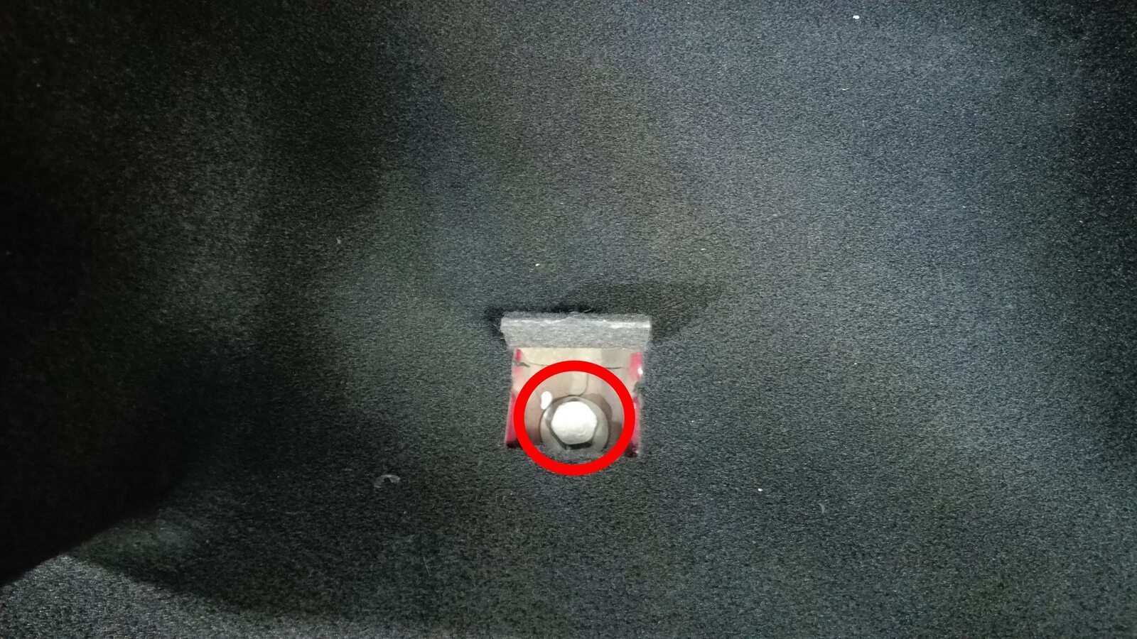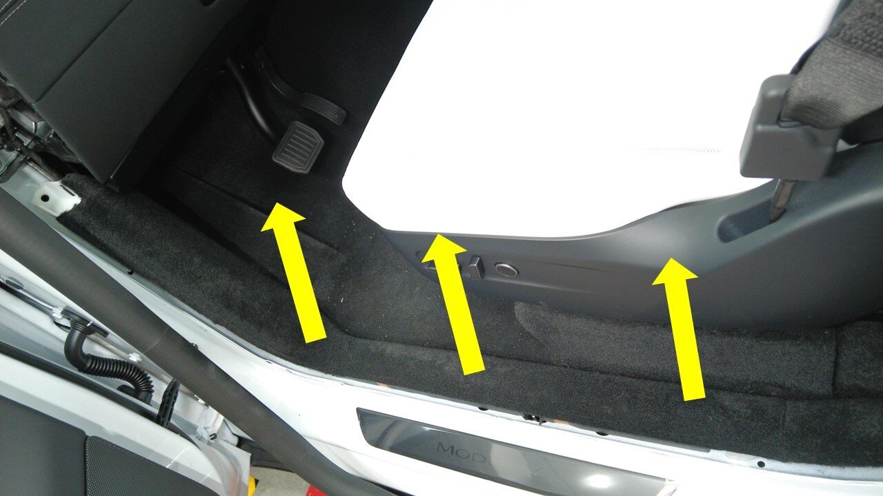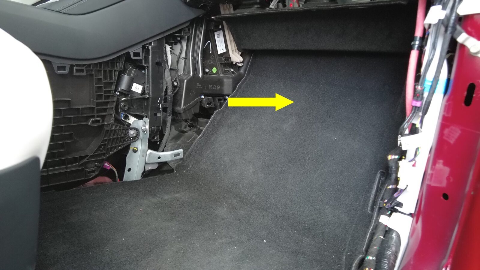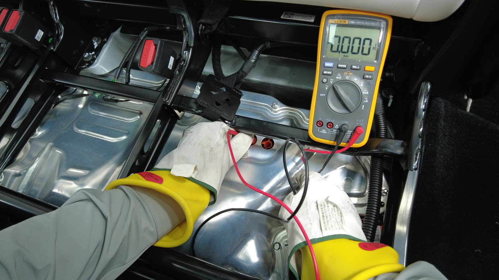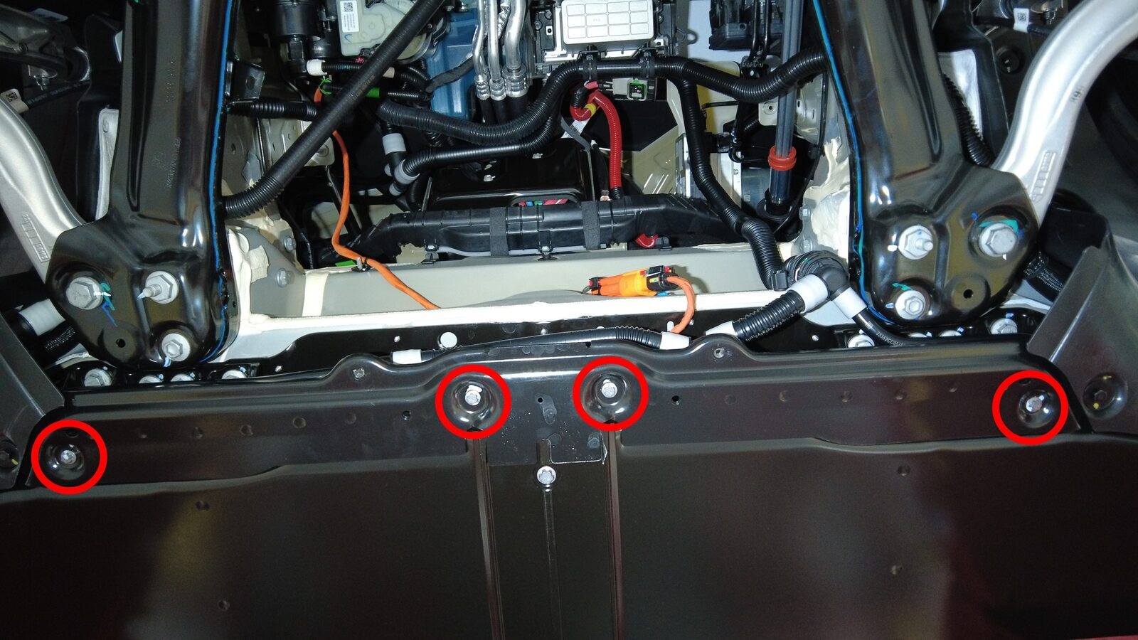 分离右前座椅下方的地毯穿孔,以便接触高压电池内部右侧中间螺栓