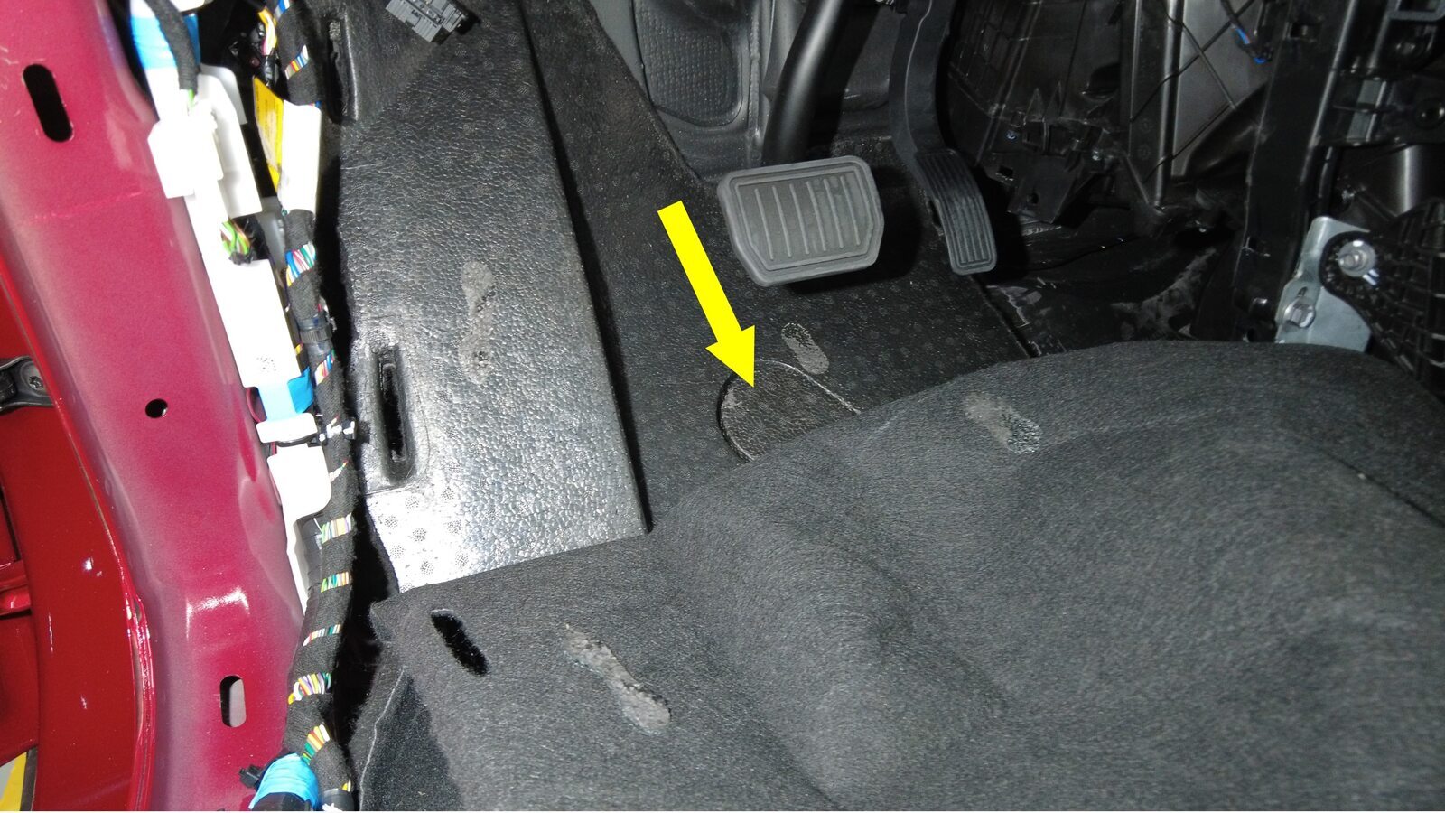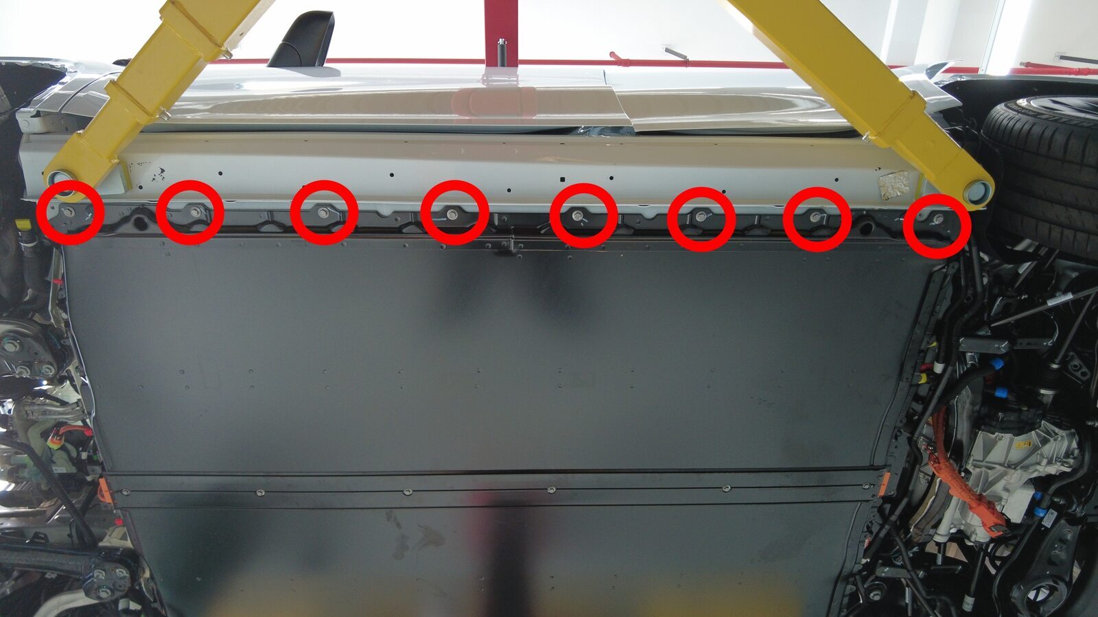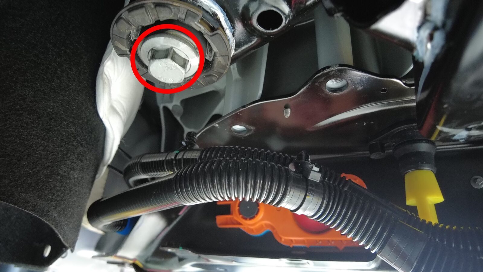 分离左前座椅下方的地毯穿孔,以便接触高压电池内部左侧中间螺栓